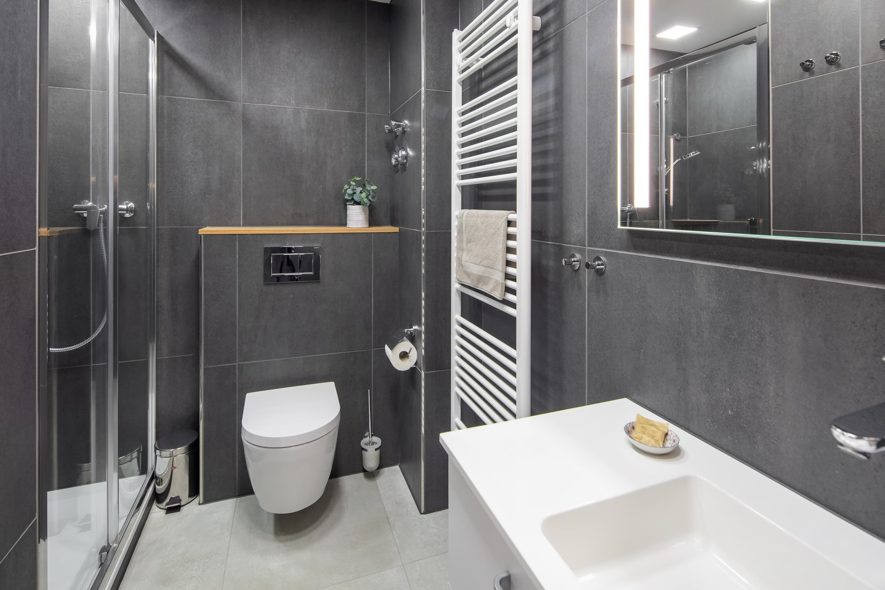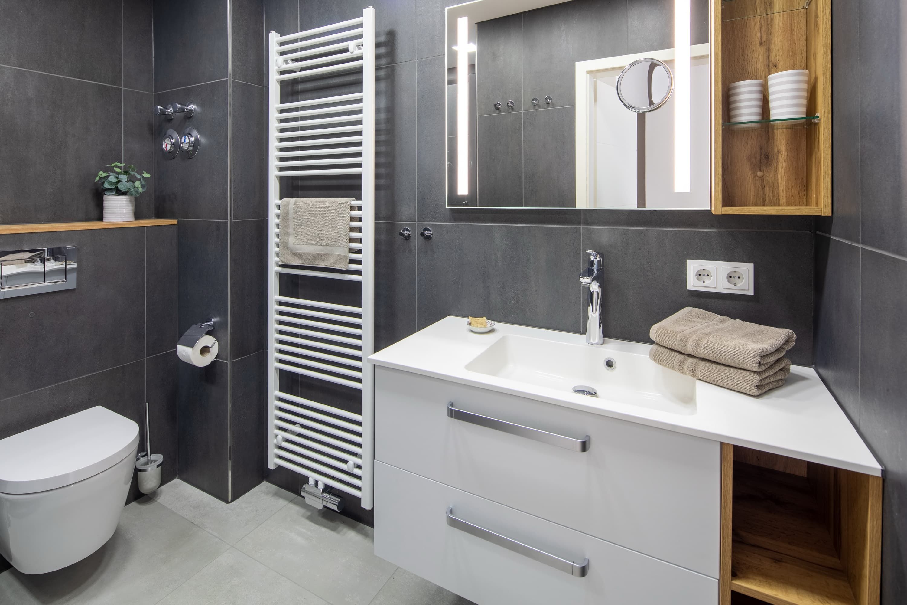 Das hochwertige Badezimmer hat eine bodentiefe Duschwanne. Ein gemütlicher Ort für Strandliebhaber, die sich eine entspannte Auszeit auf der Insel gönnen möchten.
