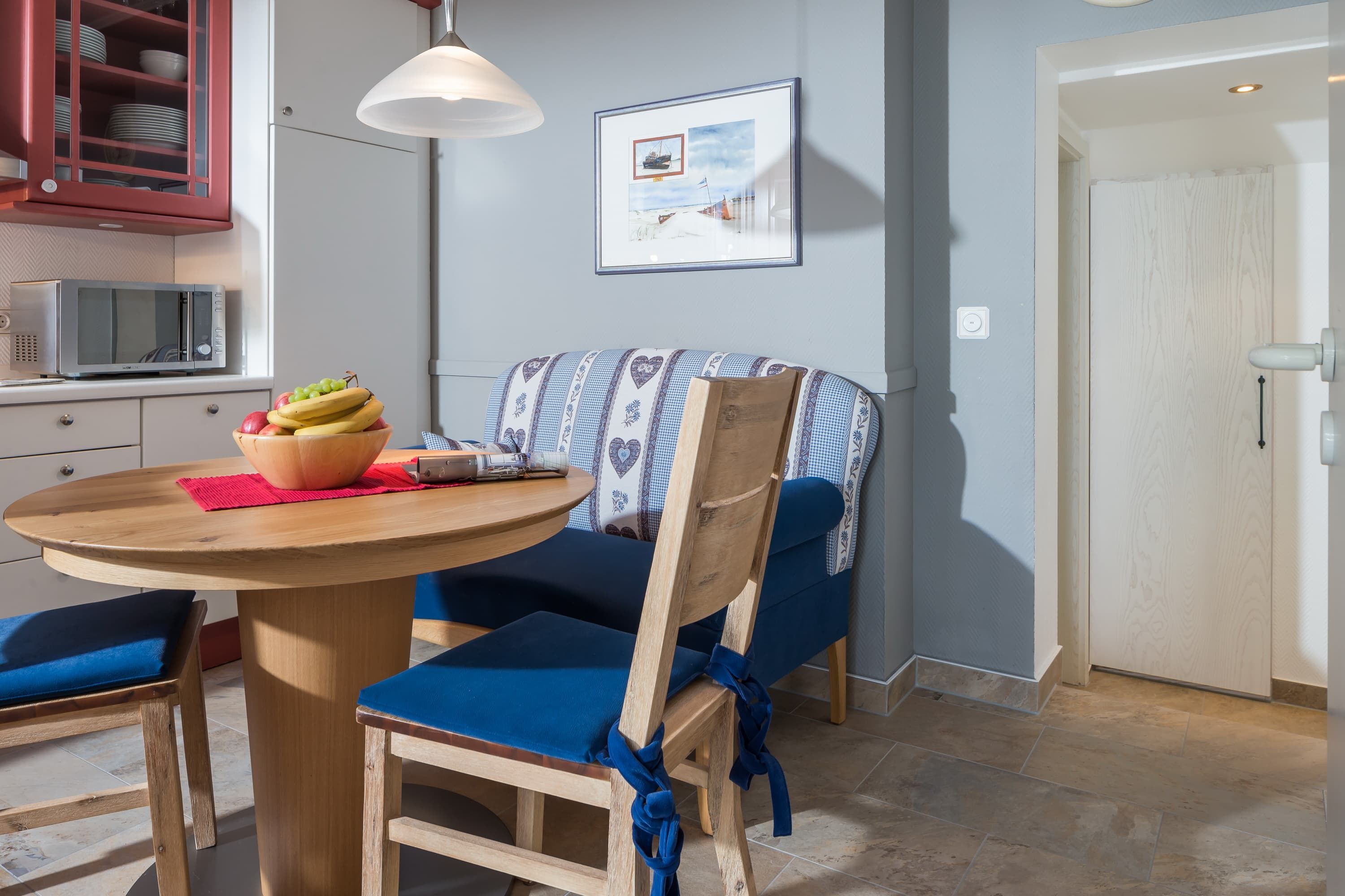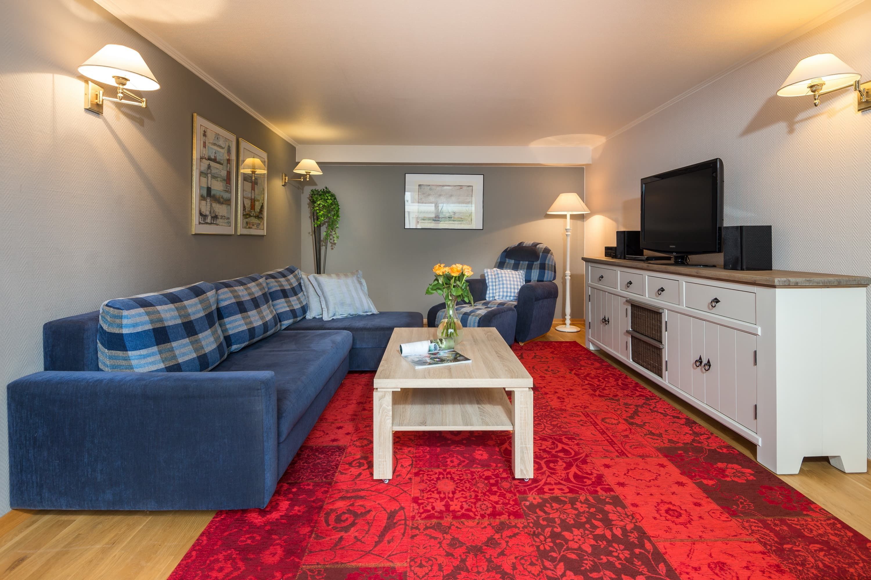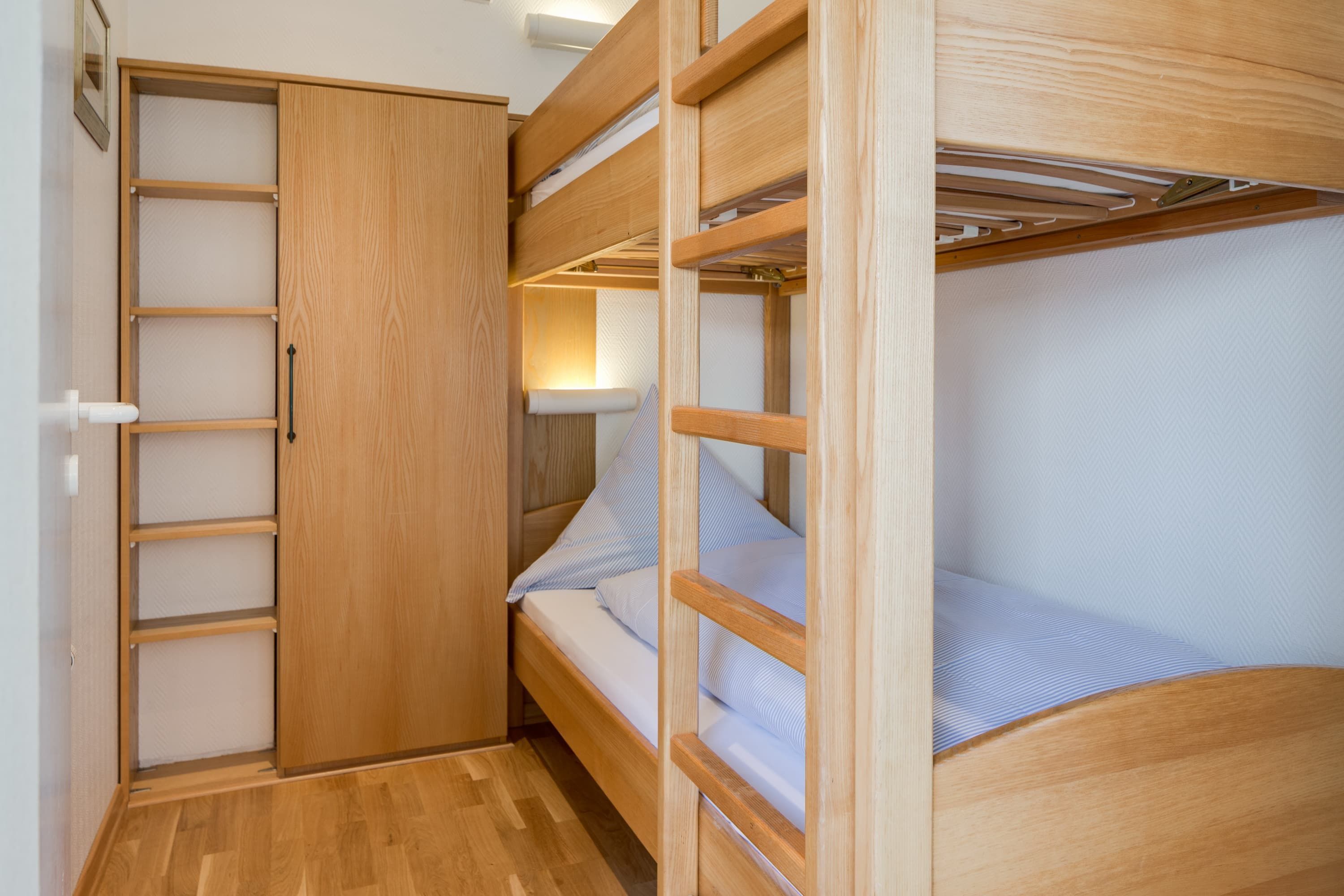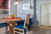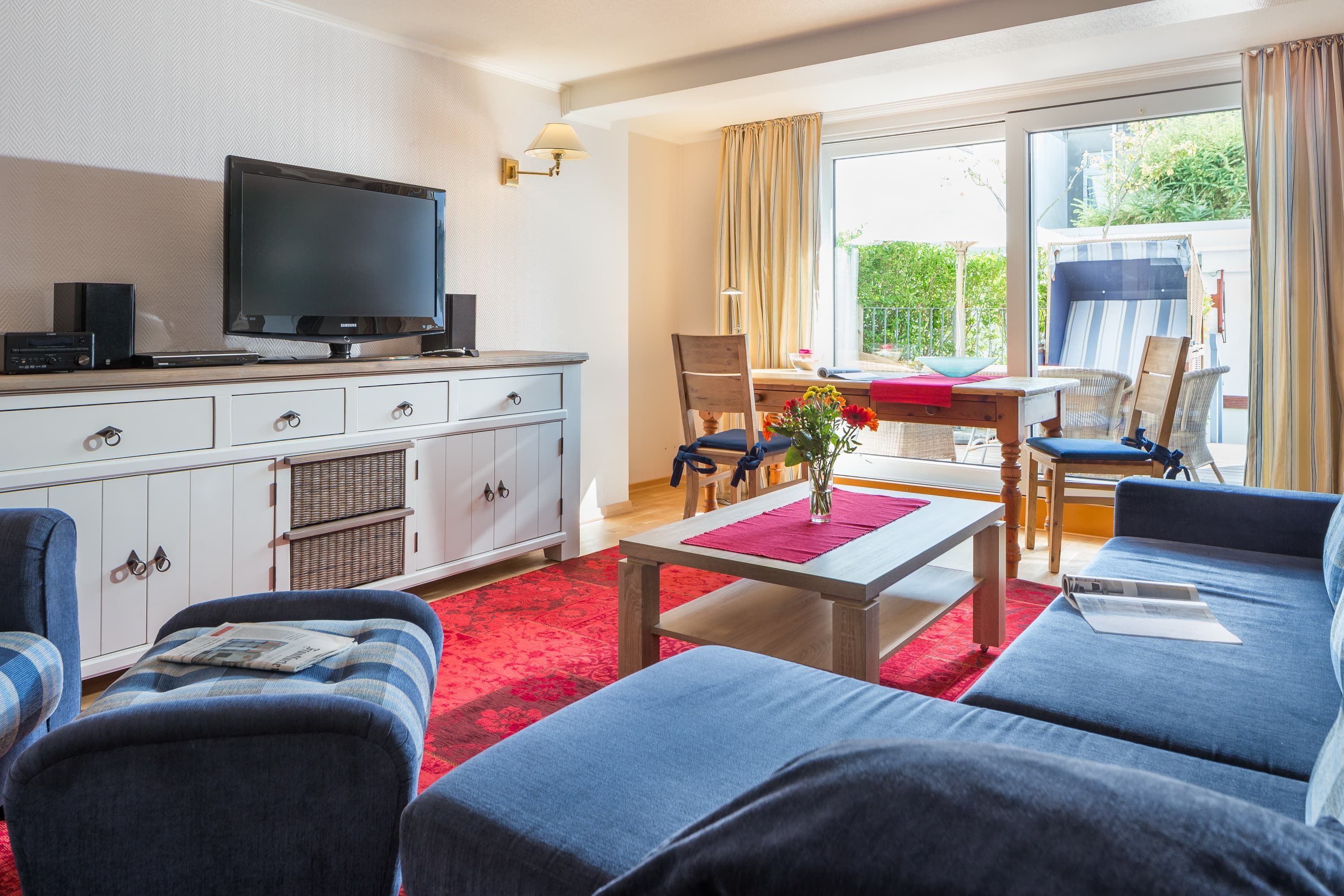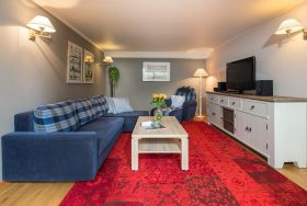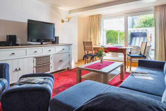 Sie ist hochwertig eingerichtet und lässt keine Wünsche offen. Die 2 separaten Schlafzimmer verfügen über ein Doppelbett, sowie ein komfortables Etagenbett. Besonders schön ist die Terrasse mit Strandkorb, die sie von der Küche und vom Wohnzimmer durch eine große Schiebetür begehen können. Die Wohnung verfügt über ein Duschbad.