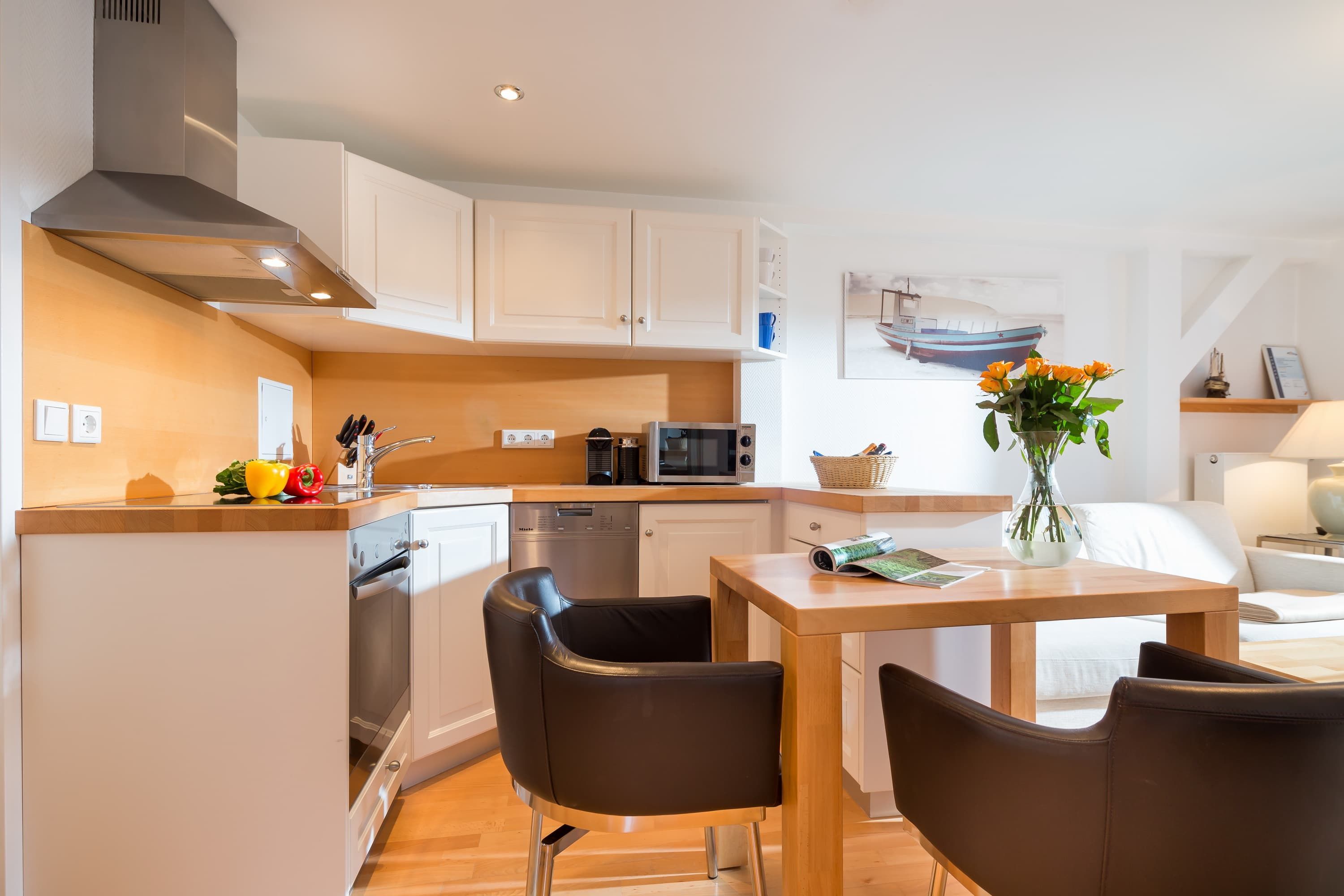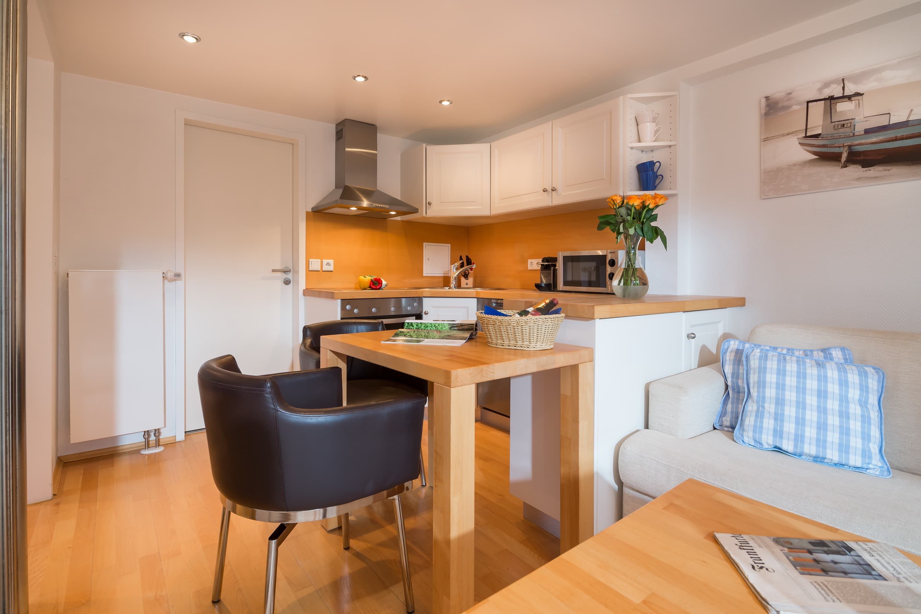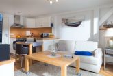 Die Wohnung „Sonnendeck“ befindet sich im 01.OG und ist über eine Treppe durch den ruhigen Innenhof zu erreichen. Im Wohnbereich befindet sich neben der Küchenzeile ein Esstisch und eine gemütliche Sitzecke mit Fernseher und Zugang zum Balkon. Das separate Schlafzimmer hat ein 1,40m breites Doppelbett. Das weiß geflieste Duschbad ist freundlich und hell.