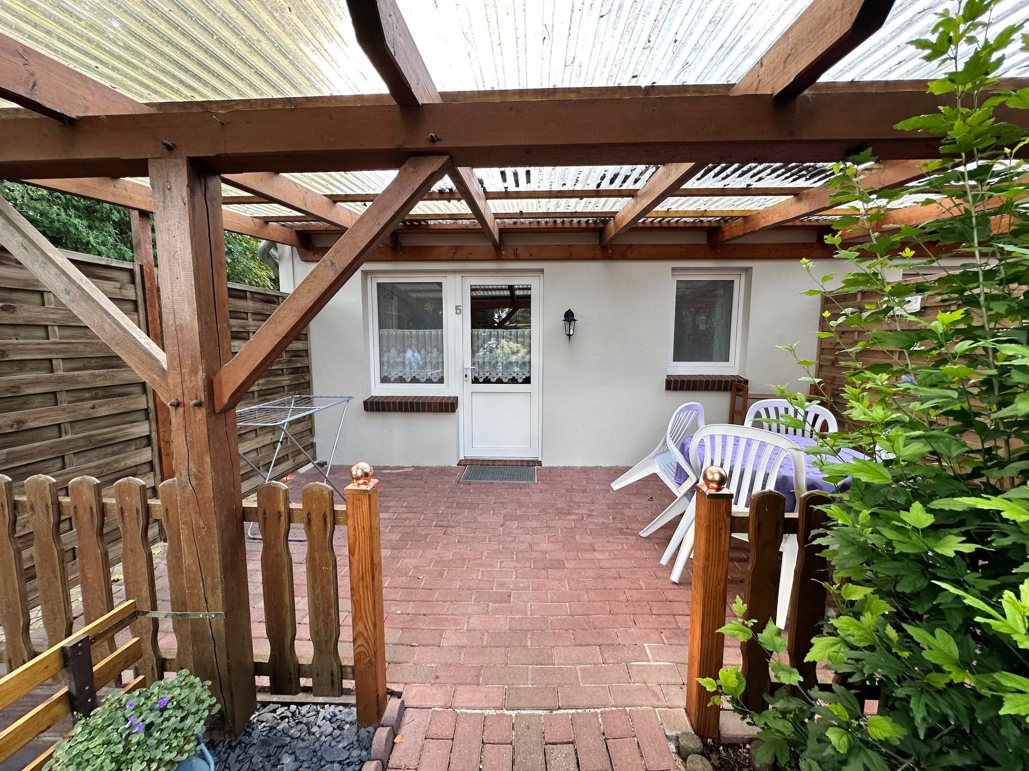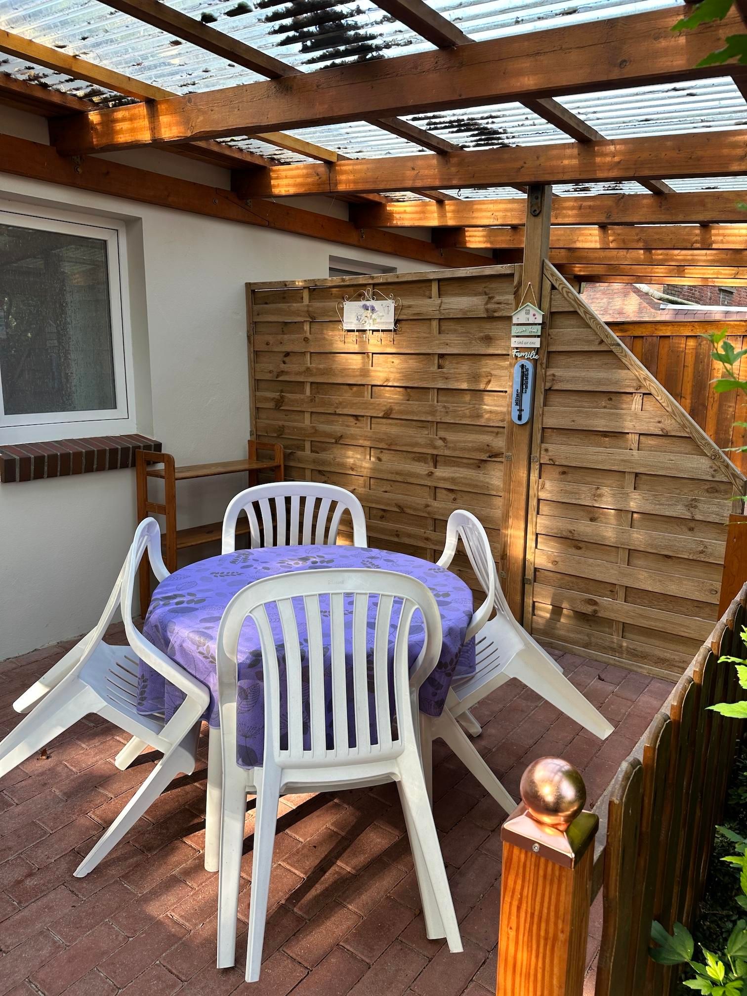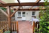 Eigene überdachte Terrasse mit Tisch, Stühlen und Entspannungs- Liegen, Kindertisch mit Bänken