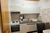 Einbauküche mit 4 Platten Herd und Backofen, Geschirr, Besteck & Töpfe, Kaffeemaschine, Eierkocher, Toaster, Wasserkocher u. div. Utensilien, Küchentisch mit 4 Stühlen