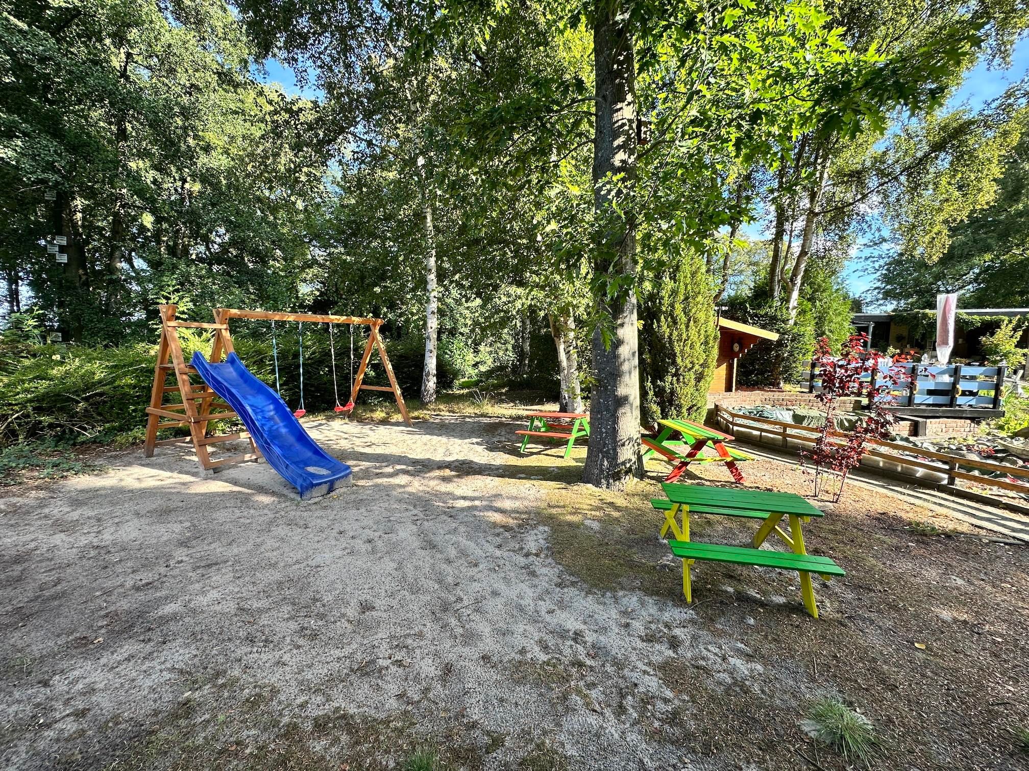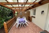Eigene überdachte Terrasse mit Tisch, Stühlen und Entspannungsliegen, Kindertisch mit Bänken