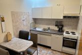 Einbauküche mit 4 Platten Herd und Backofen, Geschirr, Besteck u. Töpfe, Kaffeemaschine, Eierkocher, Toaster, Wasserkocher u. div. Utensilien, Küchentisch mit 4 Stühlen