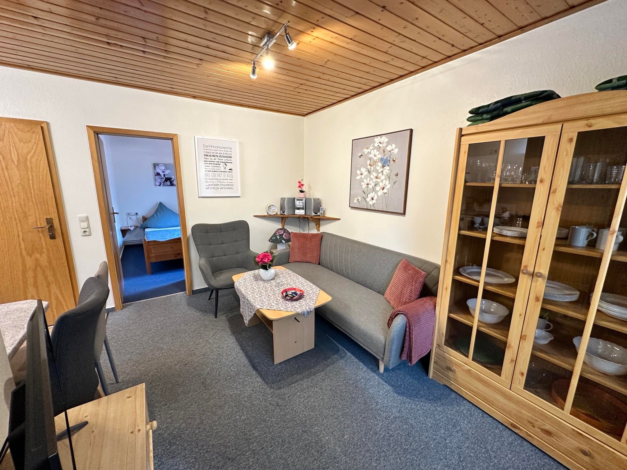 Wohnzimmer mit Couchtisch, 3 er Sofa u. Fernsehsessel, Glasschrank, Digital Sat-TV, Telefon, Stereoanlage mit CD-Player natürlich mit Fernbedienung