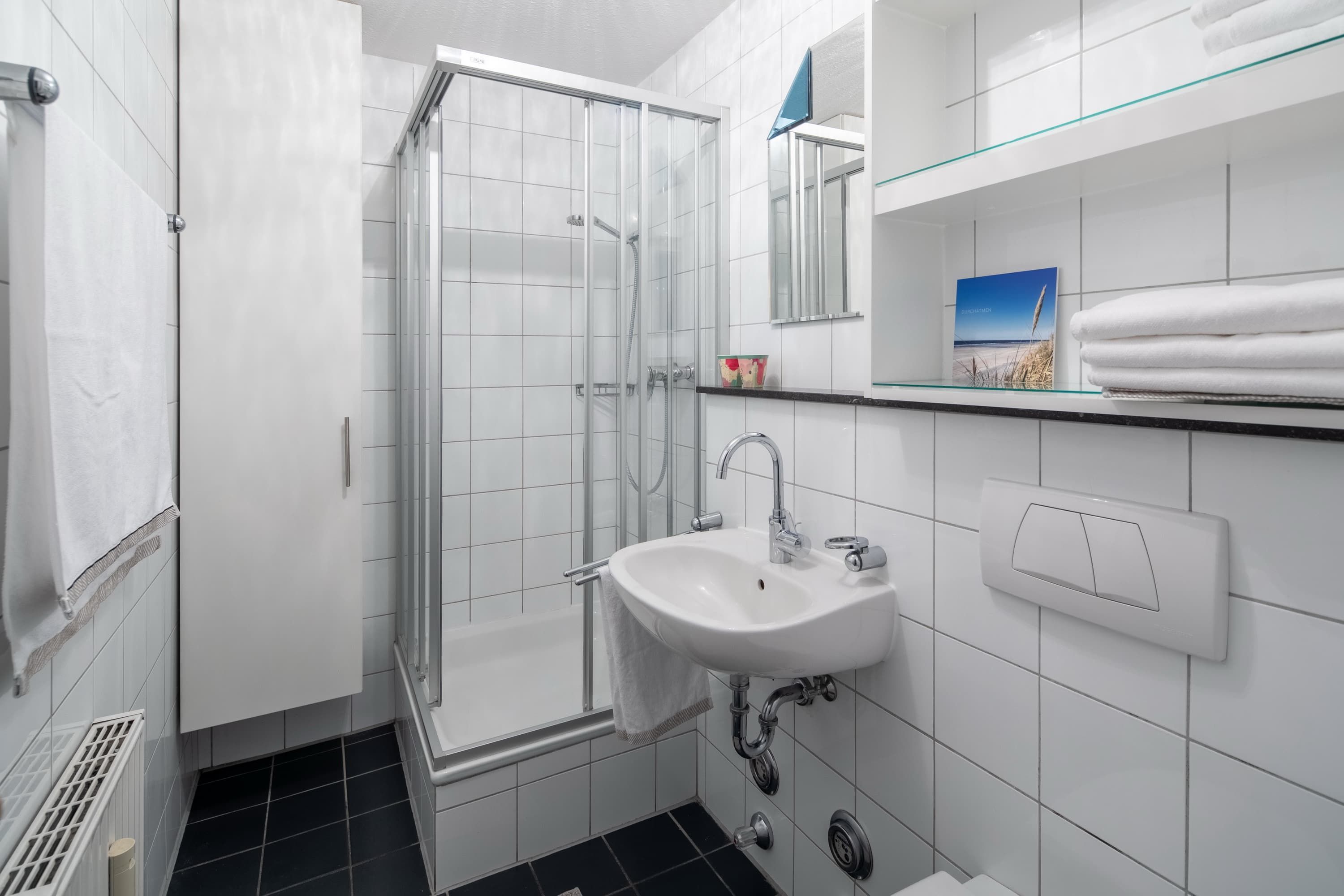 Die Ferienwohnung „Auszeit“ für drei Personen liegt in ruhiger Lage im Zentrum Norderneys. Sie bitte einen gemütlichen Wohnraum mit Esstisch und Zugang zum Balkon in den ruhigen Innenhof. In der Sitzecke mit Sofas lassen sich entspannte Abende verbringen. Das Norderneyer Schlafzimmer geht vom Wohnraum ab, genau wie die Küche. Von hier gelangen Sie ins Duschbad. Es stehen Ihnen gemeinschaftlich genutzte Waschmaschine und Trockner gegen Gebühr zur Verfügung. Sie gelangen zum Nordstrand (Kaiserwiese, Milchbar) in wenigen Minuten zu Fuß und sind ebenso im Stadtkern mit Restaurants und Einkaufsmöglichkeiten. Ein Fahrradverleih liegt in fußläufiger Entfernung.