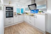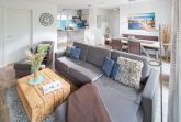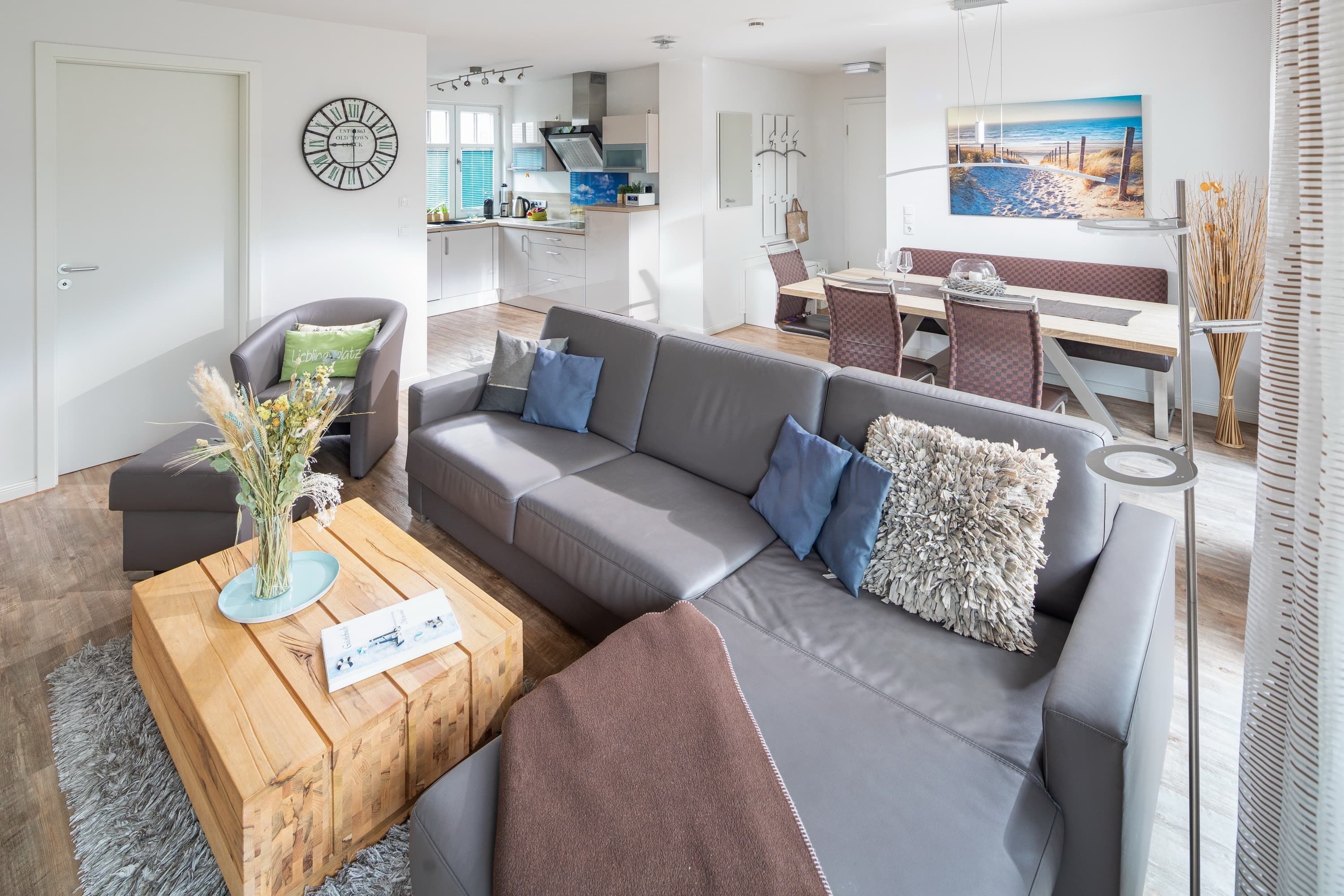 Im 34 qm großen Wohnzimmers mit 3 großen bodentiefen Fenstern befindet sich der Essbereich mit geräumigem Esstisch und angrenzender Küche. In der Sofaecke lässt es sich wunderbar zum Lesen oder Fernsehen gemeinsam sitzen. Die Couch ist mit einem Handgriff zum vollwertigen Doppelbett mit Matratze ausziehbar. Von hier aus gelangen Sie auf die 15qm große Terrasse mit Esstisch und Strandkorb für 2 Personen. Die Terrasse liegt sicht- und windgeschützt im separaten Gartenteil des Grundstücks.