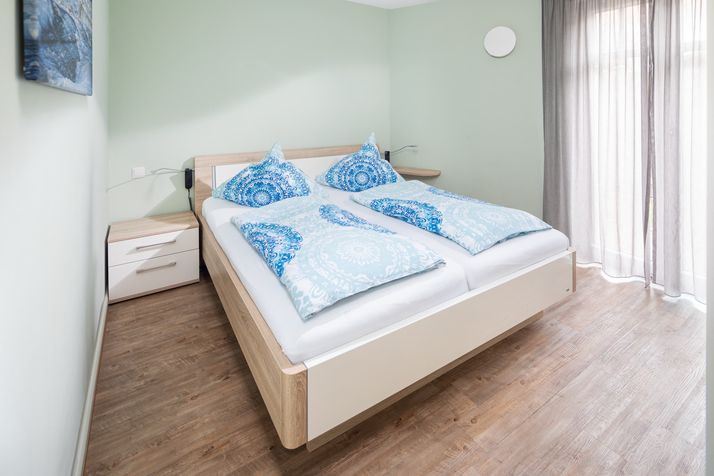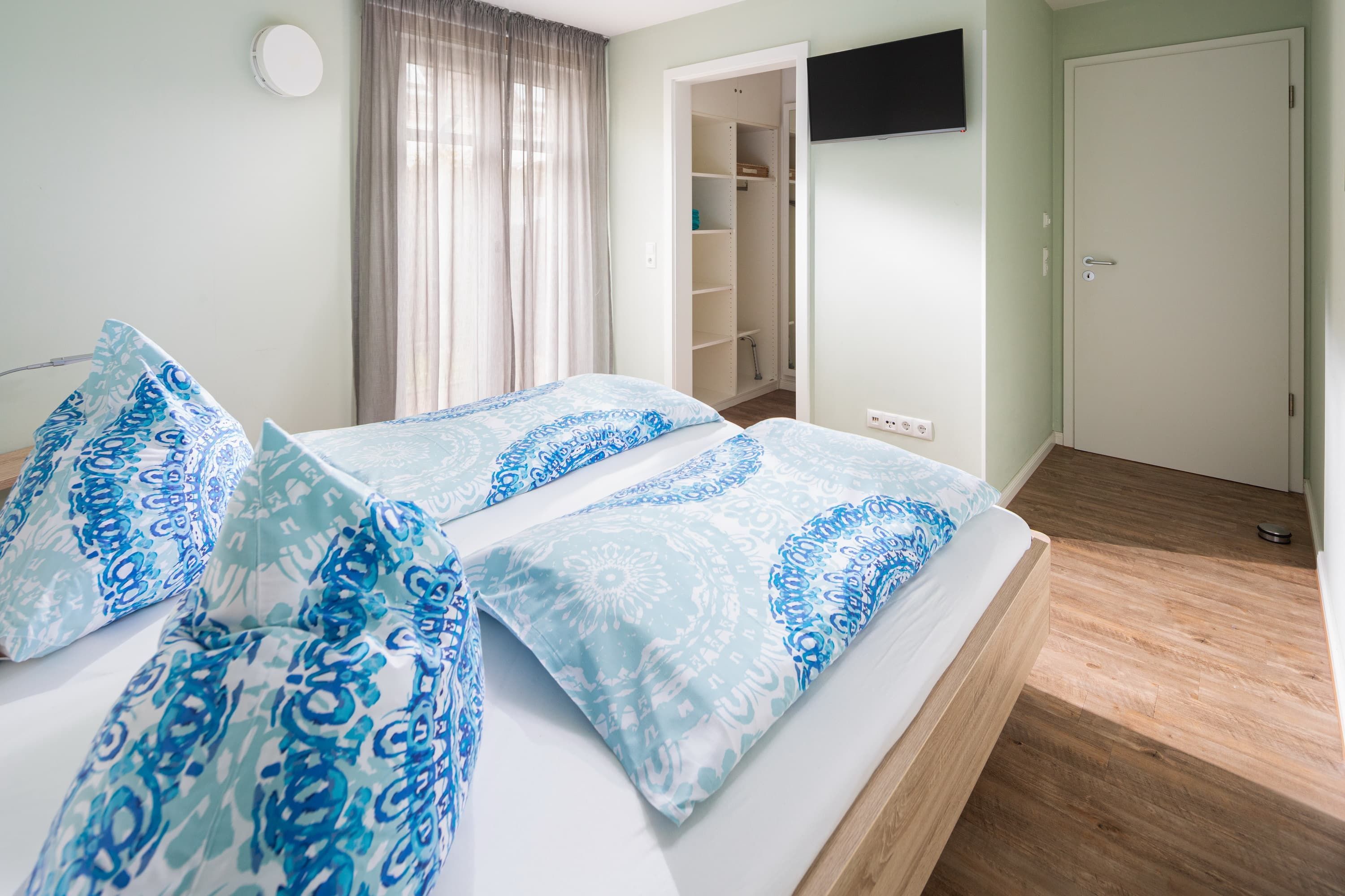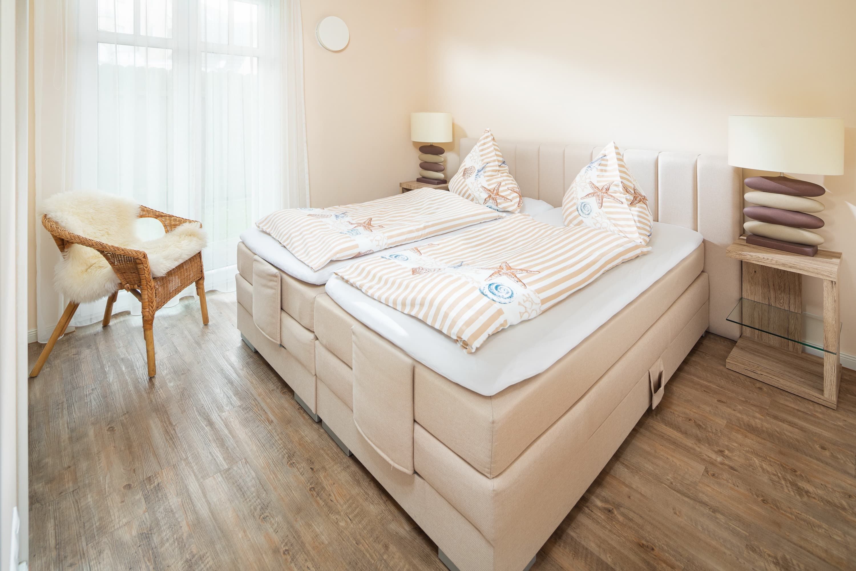 Ein Schlafzimmer verfügt über ein separat am Kopf- und Fußteil elektrisch verstellbares Boxspringbett und das andere Schlafzimmer über ein elektrisch verstellbares Doppelbett mit integrierter Beleuchtung. Beide Betten sind 1,80 m x 2,00 m. In jedem Schlafzimmer finden Sie einen begehbaren Kleiderschrank mit jeweils zwei Einzelschränken, welche mit ausreichend Regalen, einem Spiegel und einer Kleiderstange bestückt sind. Ein massives Kinderbett (1,20m x 0,60 m) kann auf Wunsch bereitgestellt werden. Nachttische, Leselampen, Sessel, stilvolle Stores und Plissees sorgen für Behaglichkeit. Zur medialen Unterhaltung finden Sie in jedem Schlafzimmer einen Samsung 32? LED-TV.