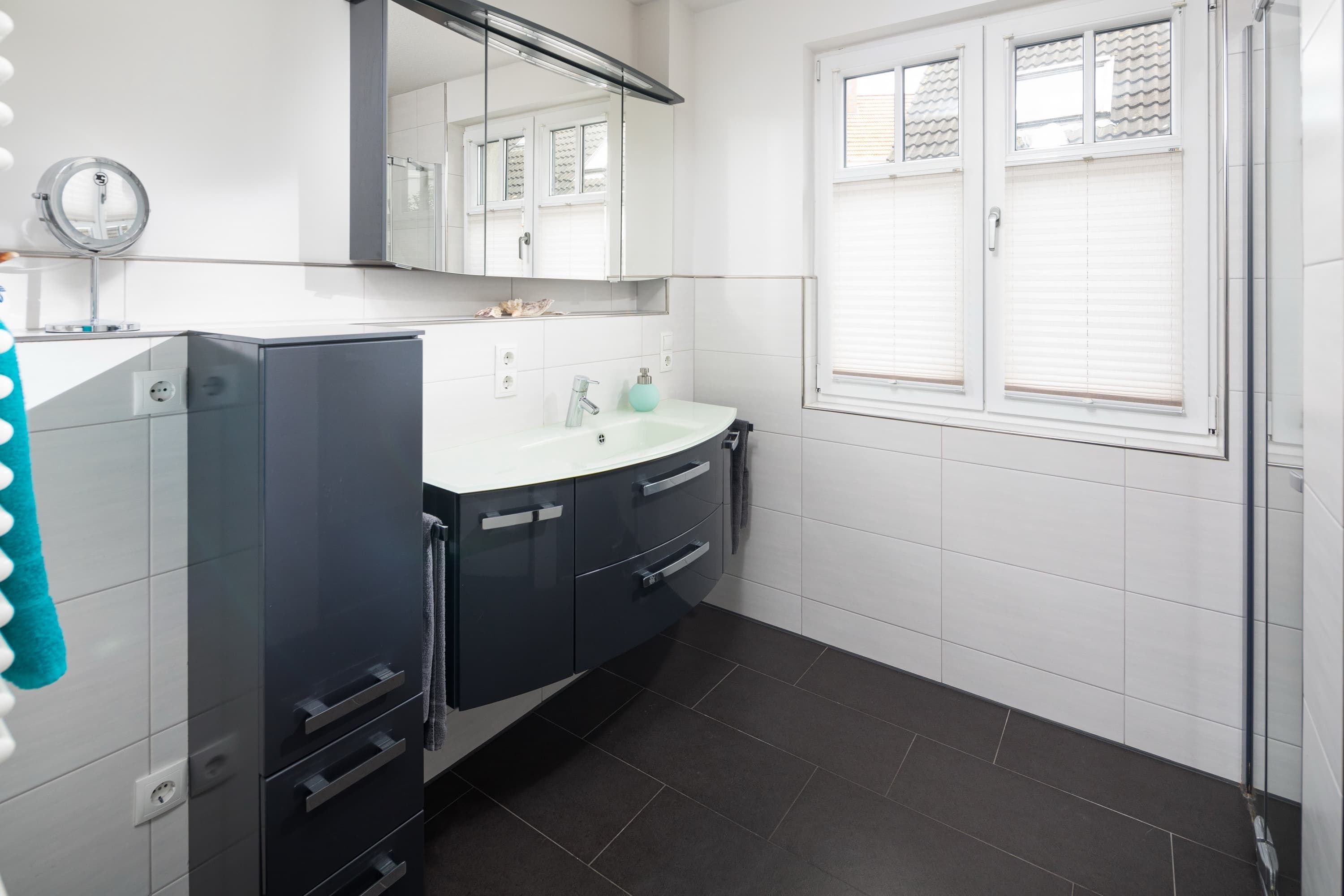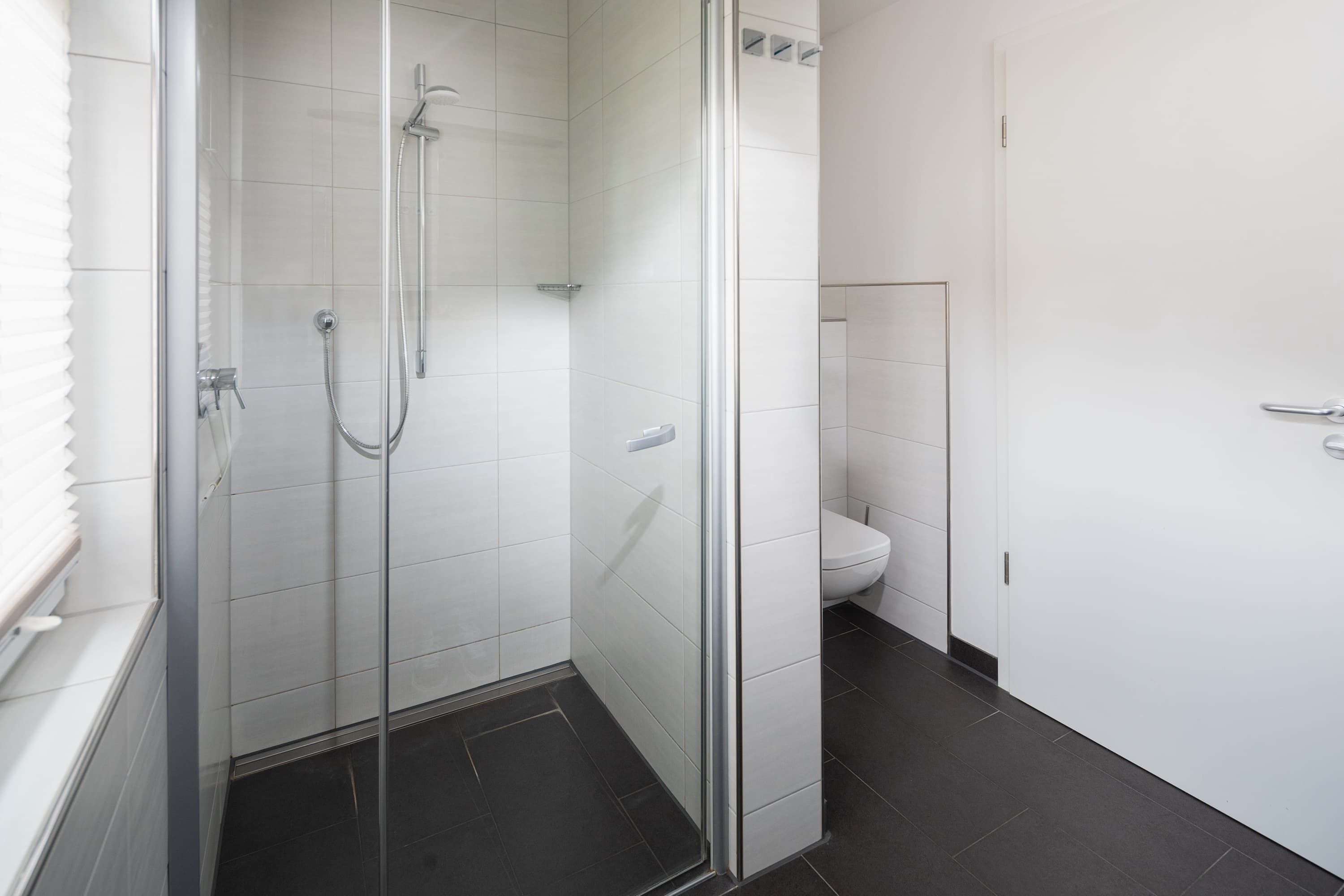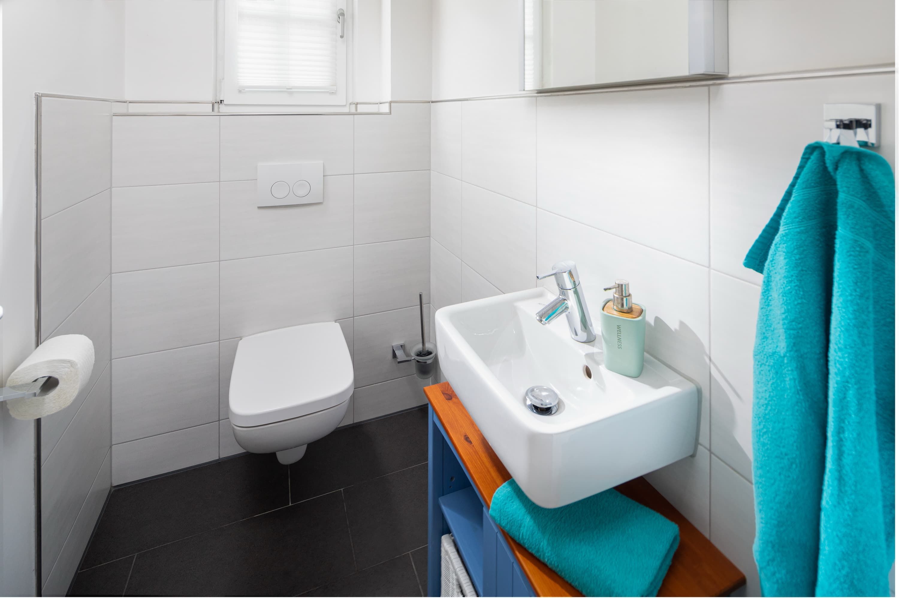 In der Wohnung befindet sich ein Tageslicht-Bad mit ebenerdig, verglaster Dusche, WC, Handtuchtrockner sowie hochwertige Badmöbel mit Glaswaschtisch und ein Spiegelschrank mit viel Ablagefläche. Zubehör wie ein Fön, Duschstuhl, Wäscheständer, Wäschekorb, Kinderhocker und eine Babybadewanne für die jüngsten Gäste sind auch vorhanden. Im Eingangsbereich befindet sich ein Gäste-WC mit Waschtisch und beleuchtetem Spiegel.