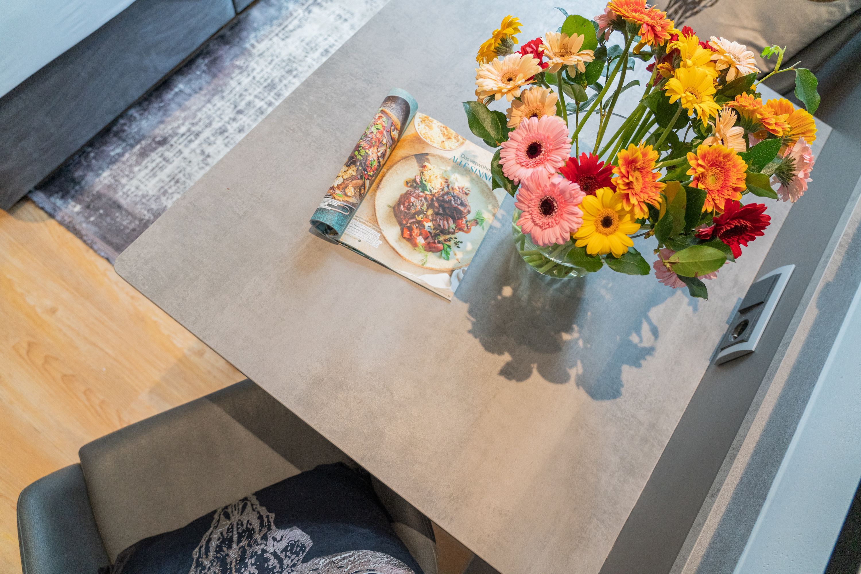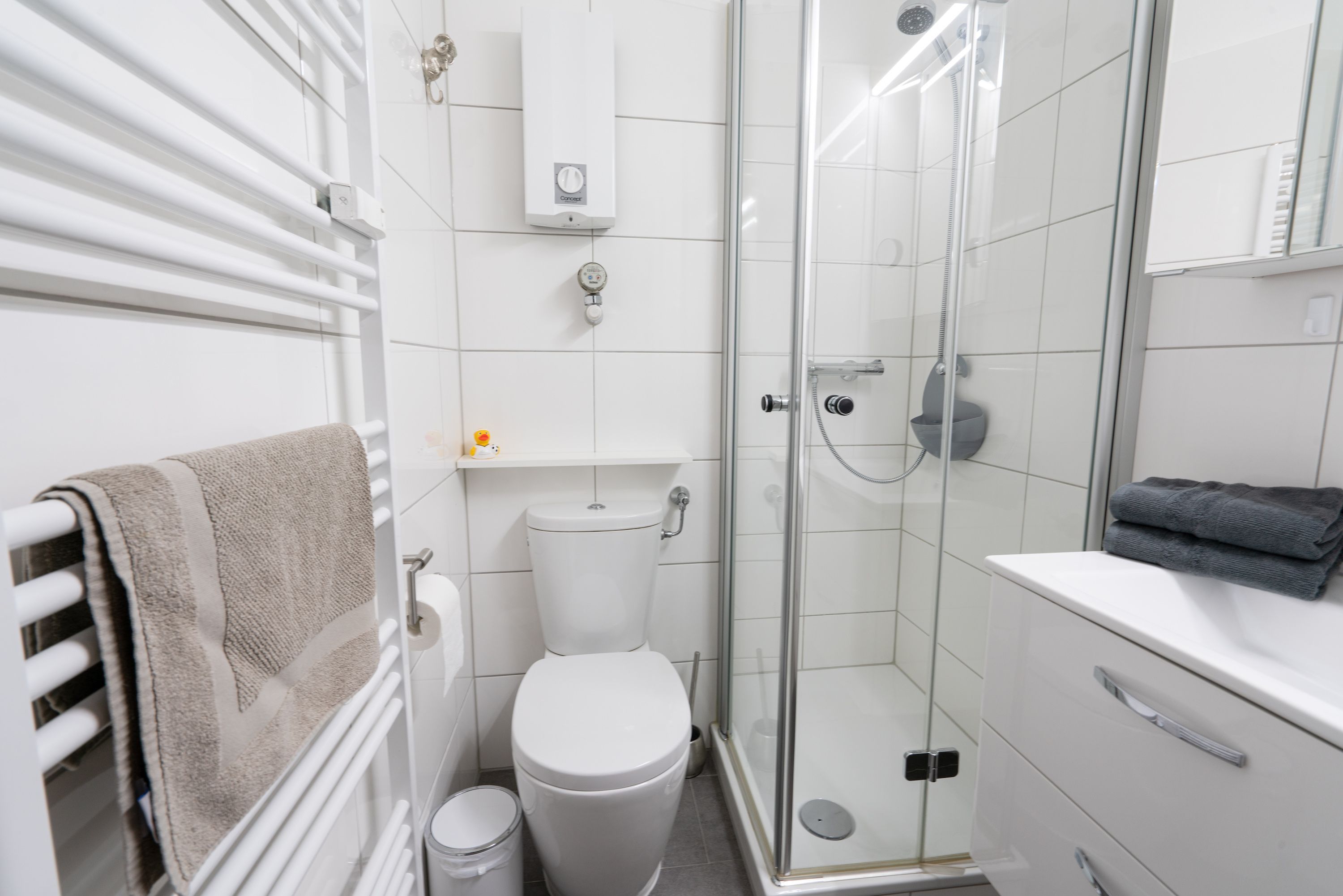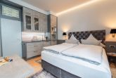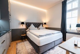 Das exklusiv ausgestattete Einraum-Appartement wurde 2021 komplett saniert. Es liegt im EG des Haus Bielefeld kurz hinter dem Empfangsbereich. Der Wohn-Schlafraum bietet ein gemütliches Boxspringbett (1,80m×2,00m), eine komplett ausgestattete Küchenzeile mit Kaffee-Vollautomat, Spülmaschine, Induktionsherd mit 4 Platten und eingelassenem Dunstabzug, einen Esstisch und einen großen Fernseher. Das Fenster geht in den Vorhof des Haus Bielefeld nahe der Eingangstür. Im kleinen Flur gibt es Stauraum für 2 Personen und auch das weiß geflieste Duschbad geht vom Flur ab. Die Gemeinschafts-Sauna im Haus Bielefeld kann gegen Gebühr mit genutzt werden.