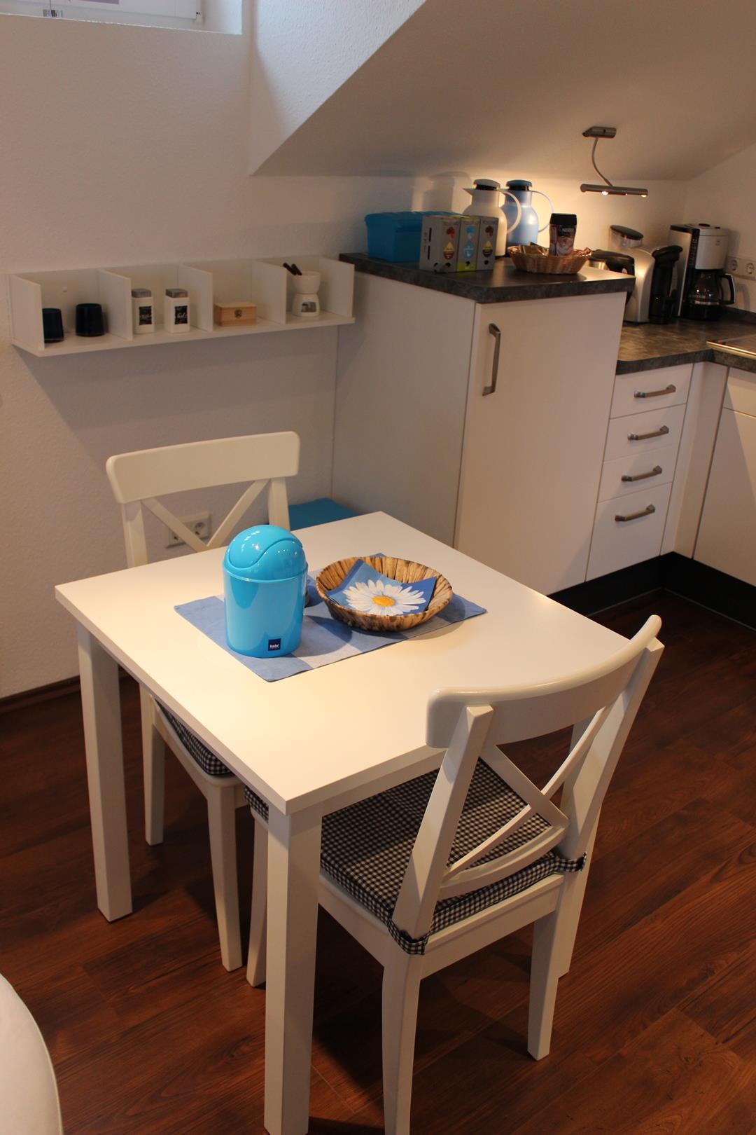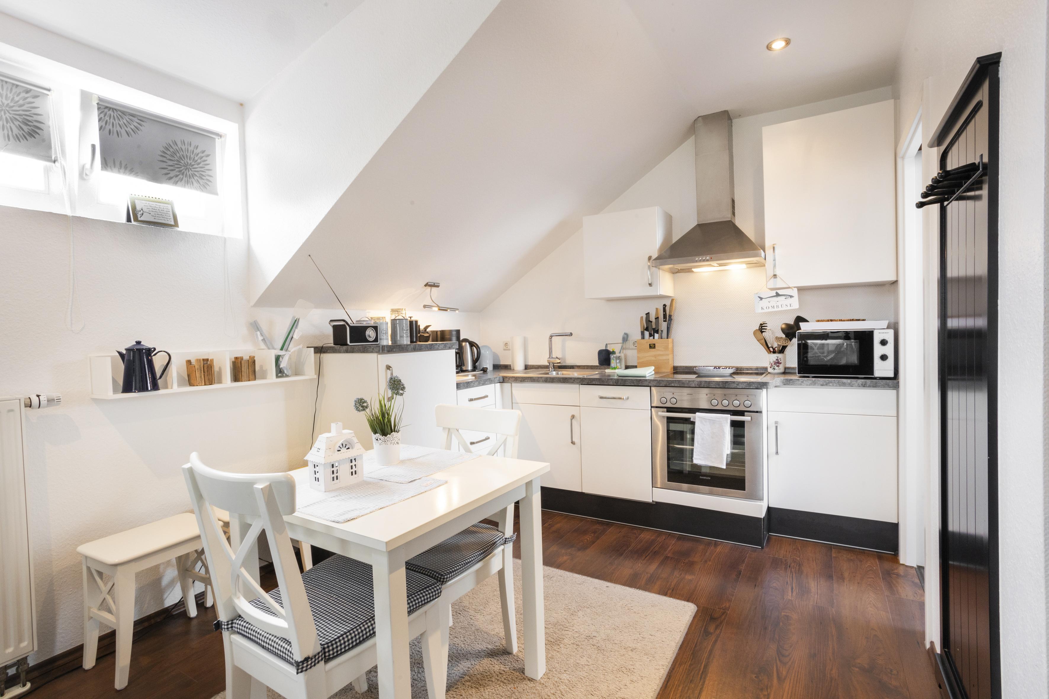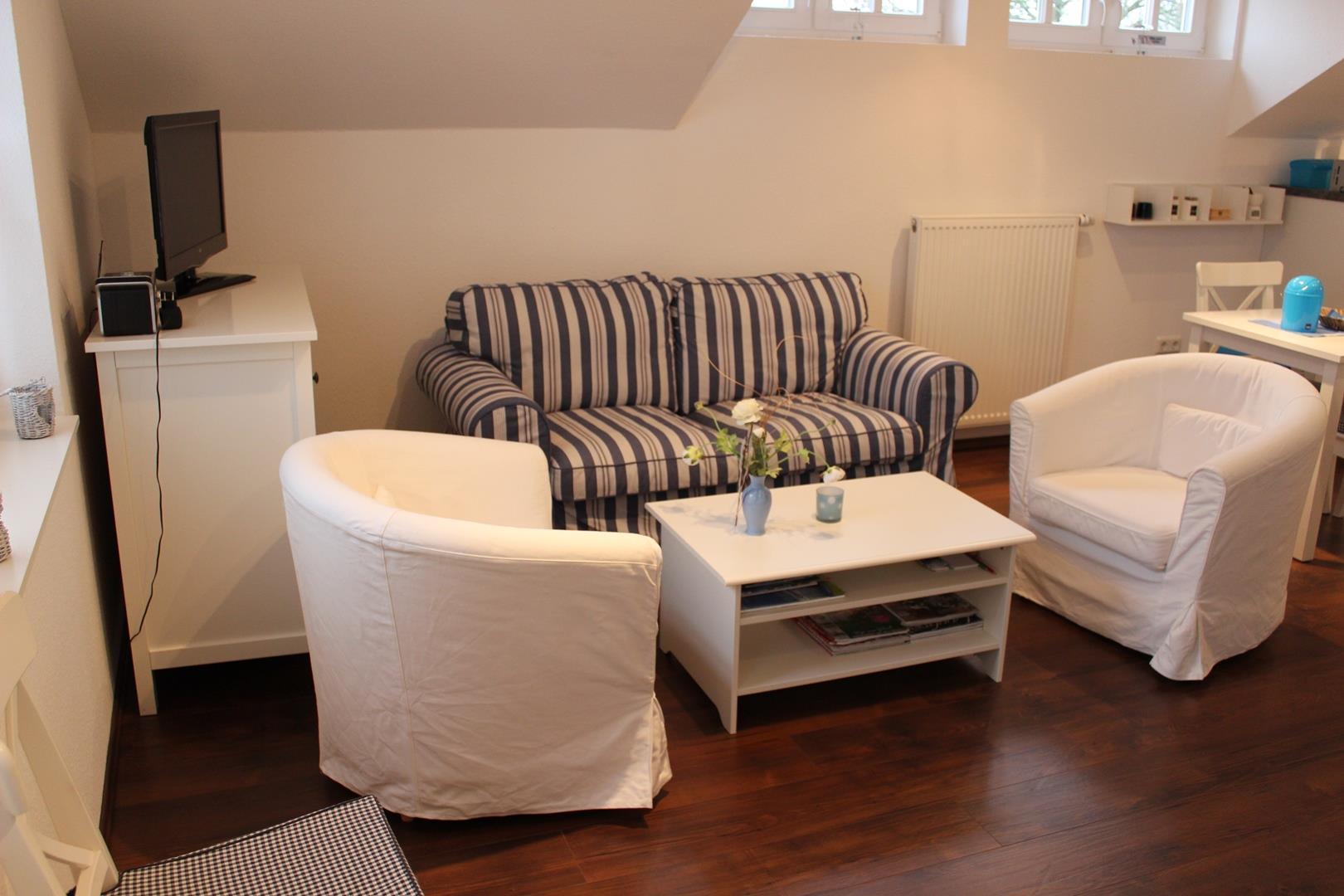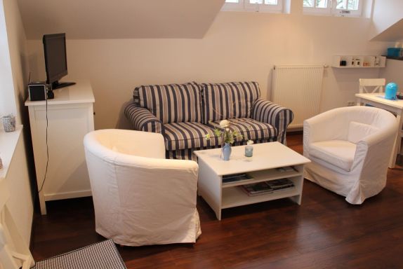 Die Ferienwohnung Anna liegt im Obergeschoss eines Reetgedeckten Hauses direkt in dem schönen Wurtendorf Sillens. Im Eingansbereich finden Sie die Garderobe und eine Ablage für die Schuhe. Eine Treppe führt direkt in die hell und im Landhausstil gemütlich eingerichtete Ferienwohnung mit einer Sitzecke mit Sat-TV und Radio und Schlafcouch, einer vollausgestatteten Küche (Kühlschrank, Backofen mit Ceranfeld, Geschirrspüler, Kaffeemaschine, Kaffeepadmaschine, Toaster, Wasserkocher, Sandwichtoaster, Raclette, Mixer und Pürierstab), ein Schlafbereich mit Doppelbett (Allergikerbetten, Bandscheibenmatrazen) und einem Bad mit großer Dusche mit Glastür, 2 Waschtischen und WC.