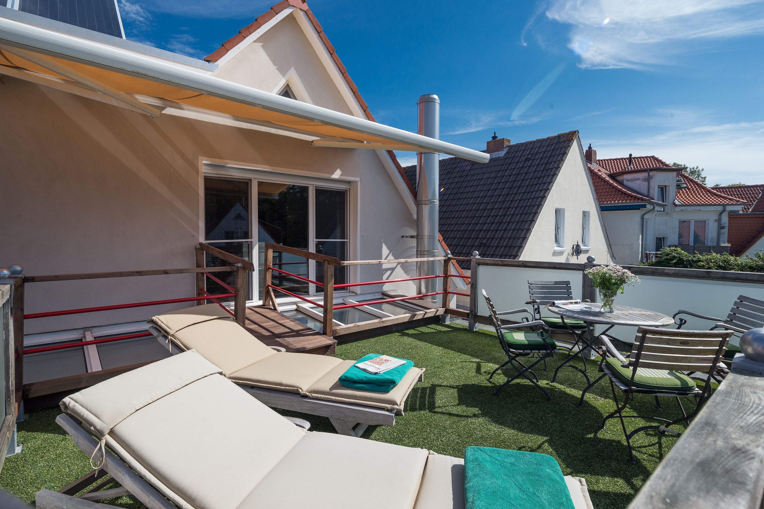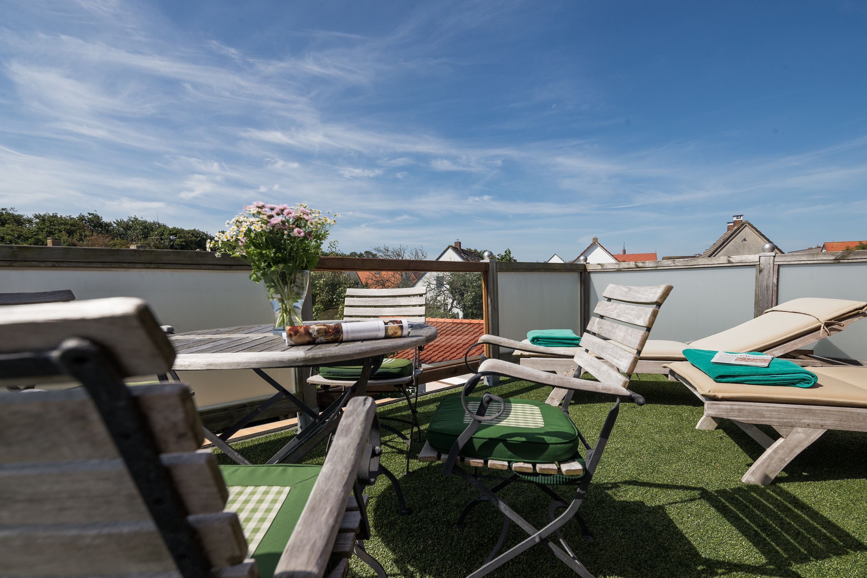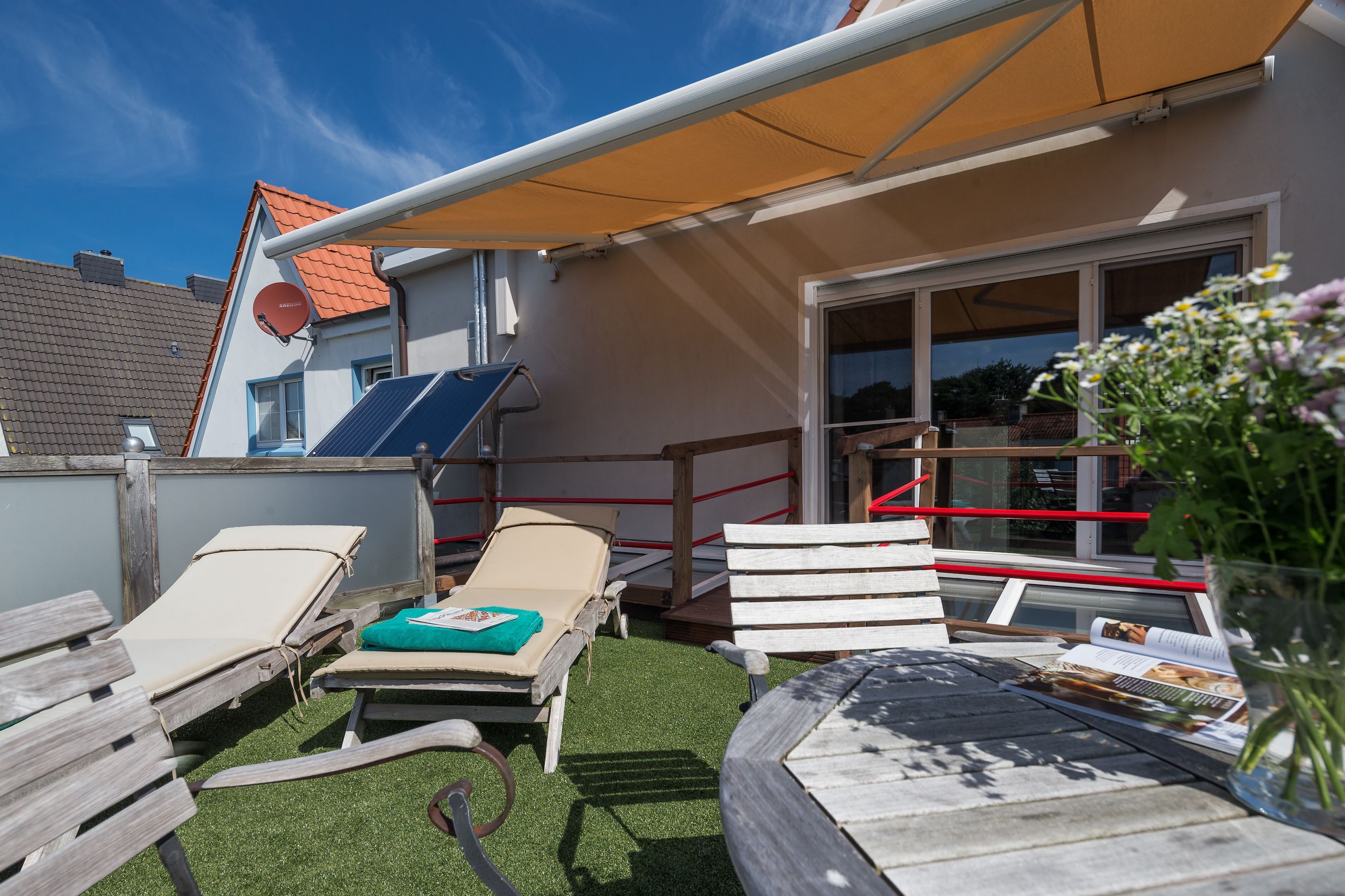 Herzstück der Wohnung ist der offene Wohn- und Essbereich, in dem sich ein hochwertig ausgestatteter Küchenbereich mit Induktionsherd, amerikanischer Theke und direktem Zugang zur 18 Quadratmeter großen Dachterrasse befindet. Ob entspanntes Frühstück in der Morgensonne oder ein Sundowner mit Blick über die Dächer Norderneys die Sitzgruppe, Sonnenliege und Markise machen diese Terrasse zu Ihrem Lieblingsplatz.