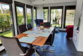Das Ferienhaus ist ausgestattet mit: Wohnbereich mit Wohnecke mit TV, Blu Ray Player und Internetradio. Essbereich für alle Personen im Wintergarten. Voll ausgestatteter Küche mit Backofen, Herd, Geschirrspüler, Kühlschrank, Mikrowelle, Kaffeemaschine, Toaster und Wasserkocher. 3 Schlafbereiche, ein Schlafzimmer im Obergeschoss mit Doppelbett (180x200), ein Schlafzimmer im Erdgeschoss mit Doppelbett (180x200) und einem Pflegebett (90x200) und ein Schlafbereich mit Schlafcouch für eine Person im Wintergarten. Dieser kann mit elektrischen Jalousien verdunkelt werden. Im Obergeschoss finden Sie ein ein Bad mit Doppelwaschbecken, zusätzlich auch ein rollstuhlgerechtes Bad im Erdgeschoss mit Waschtisch, Dusche und WC und ein Bad mit Dusche und WC. Auf der gemütlichen Terrasse mit Terrassenmöbeln, kann man den Urlaubsabend sehr schön ausklingen lassen. Über den barrierefreien Nebeneingang ist ein rollstuhlgerechtes Duschbad und ein Schlafzimmer mit einem Pflegebett (90x200) mit Bettgalgen und einem Doppelbett (180x200) zu erreichen. Die Durchgangsbreite der Türen des Verbindungsraumes zwischen Bad/Eingangsbereich und Schlafraum beträgt 84 cm. Der Rollstuhlfahrer gelangt über die Terrasse zwischen Schlafbereich und Wintergarten in den Wohnbereich. Da der Küchenbereich 3 Stufen höher als der Wohnbereich ist, benötigt der Rollstuhlfahrer eine Begleitperson.