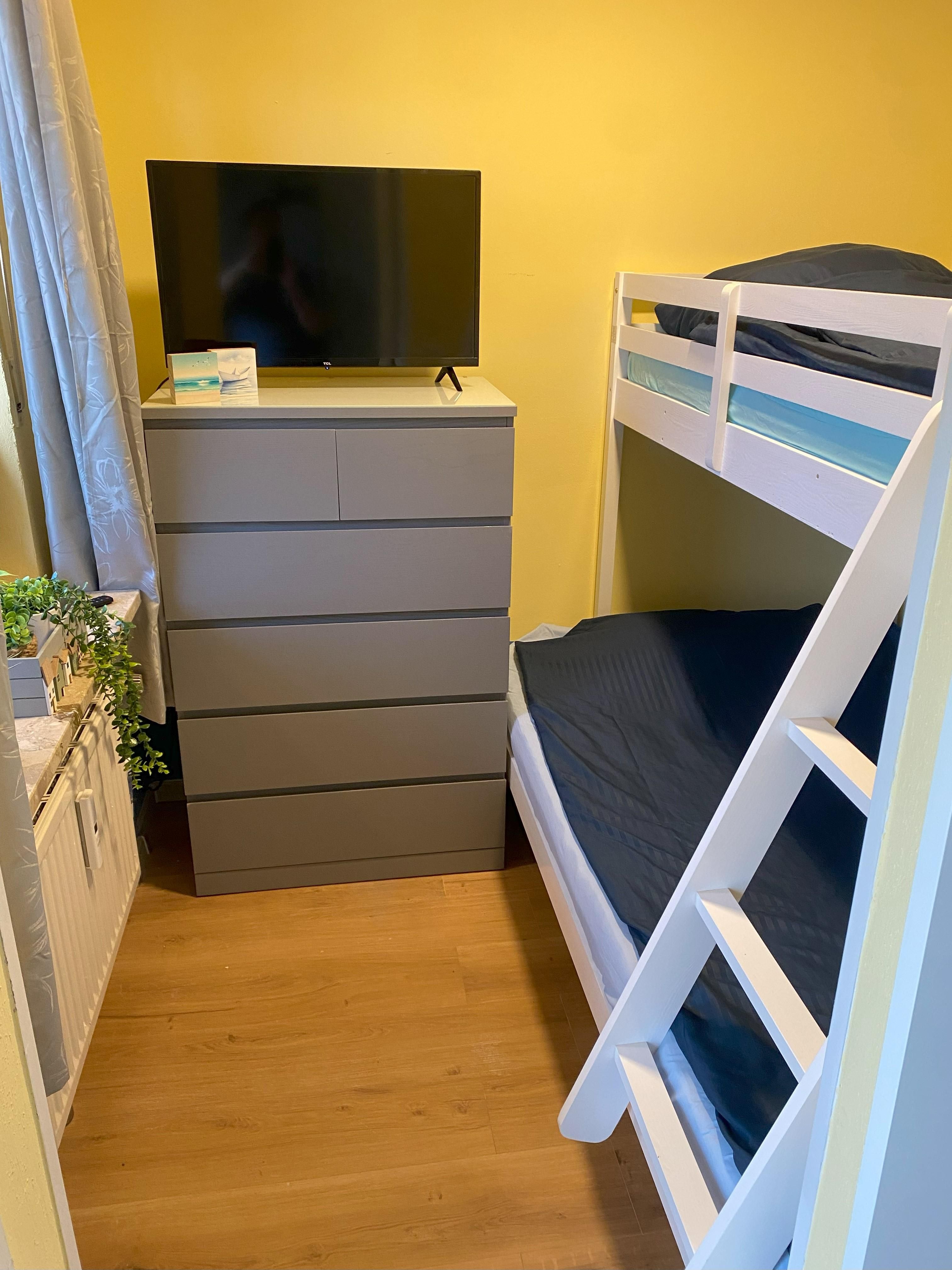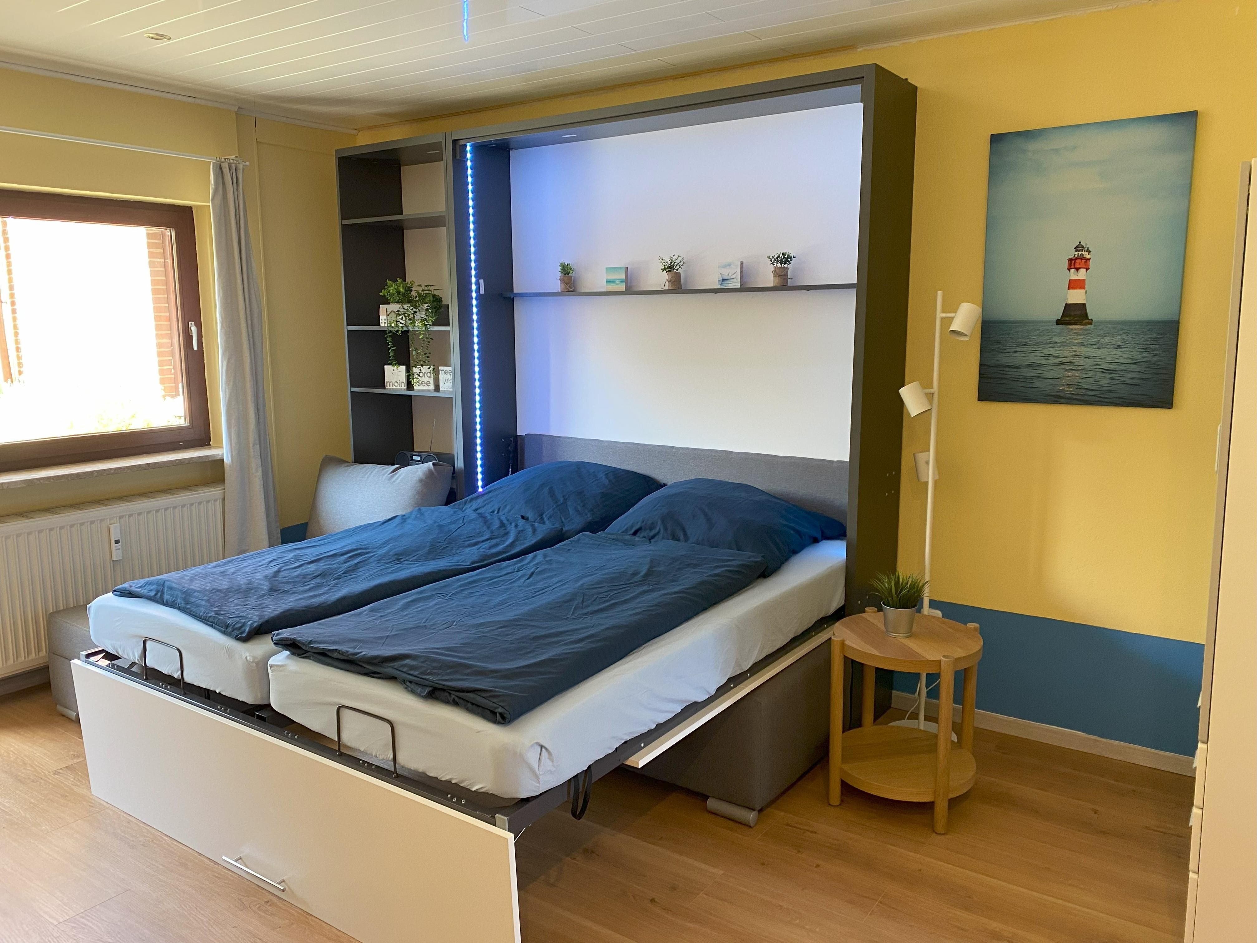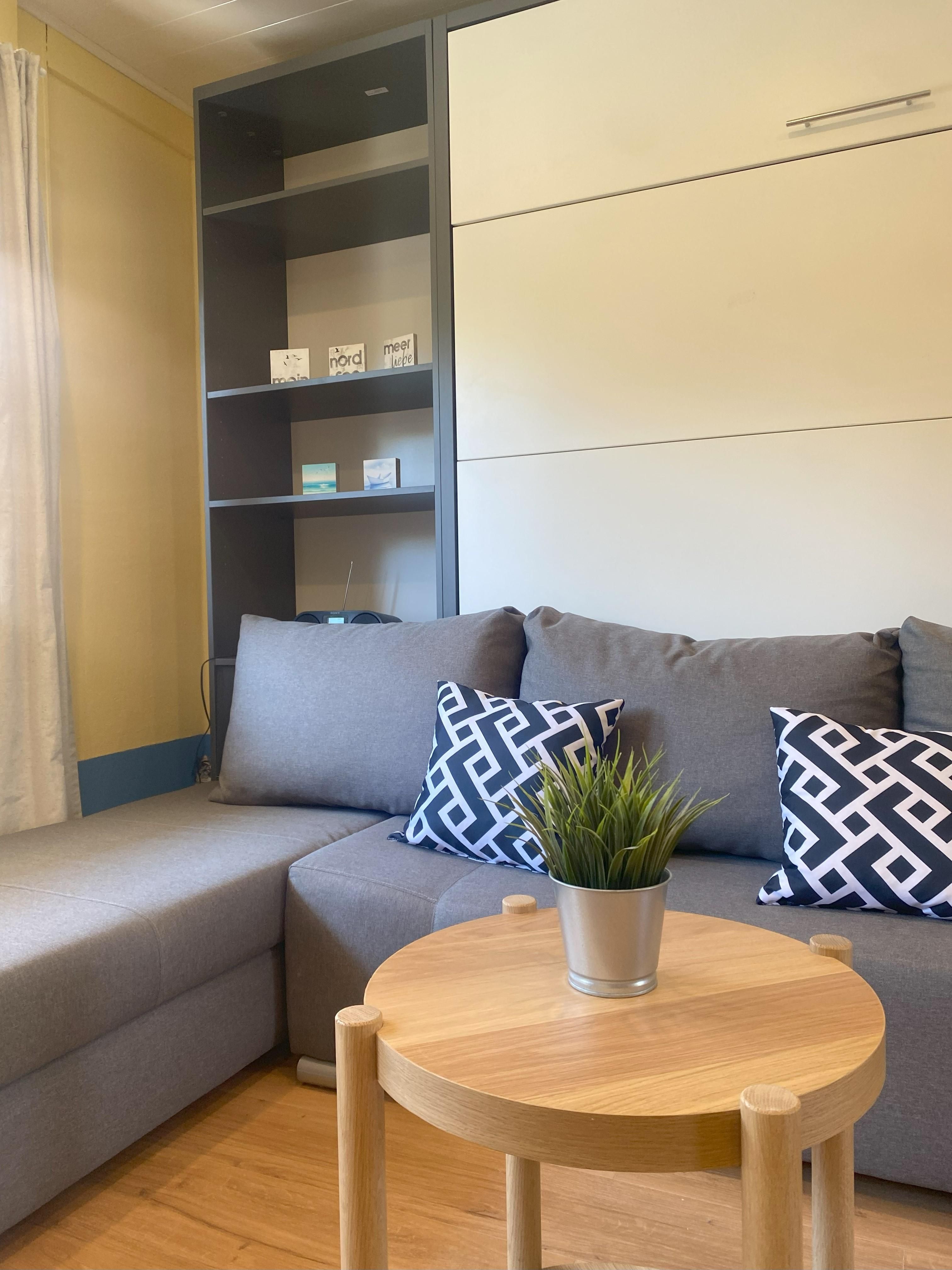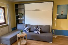 Die Betten verteilen sich auf 2 Räume, es gibt ein kleines Schlafzimmer mit Queensize-Doppelbett und eigenem TV sowie ein bequemes Doppel-Schlafsofa mit dem Maß 140/200 im Wohnzimmer. Bei Bedarf ist ein Baby-Reisebett samt Matratze vorhanden (ohne Zusatzkosten), auch ein Hochstuhl kann gerne bereitgestellt werden.