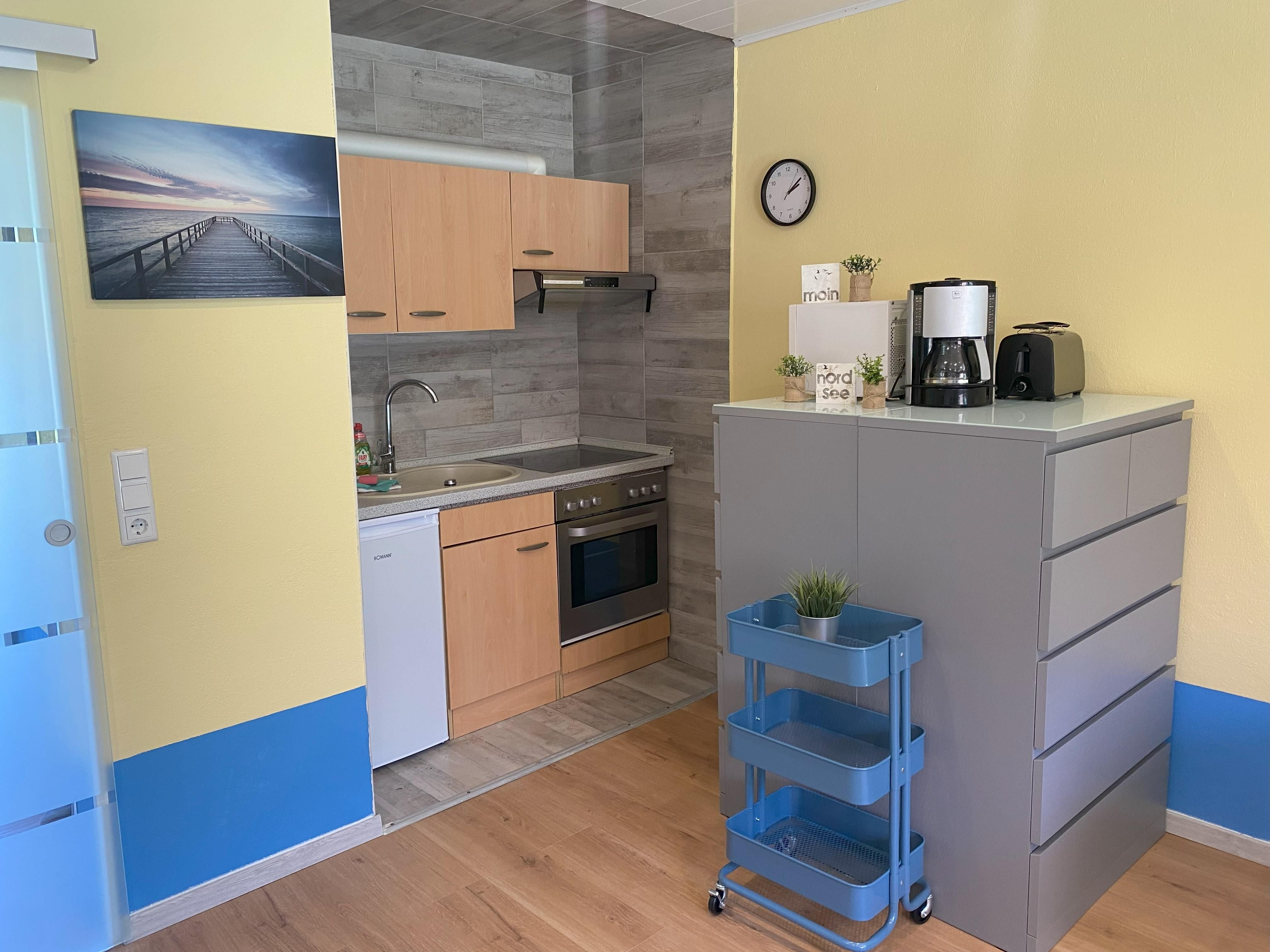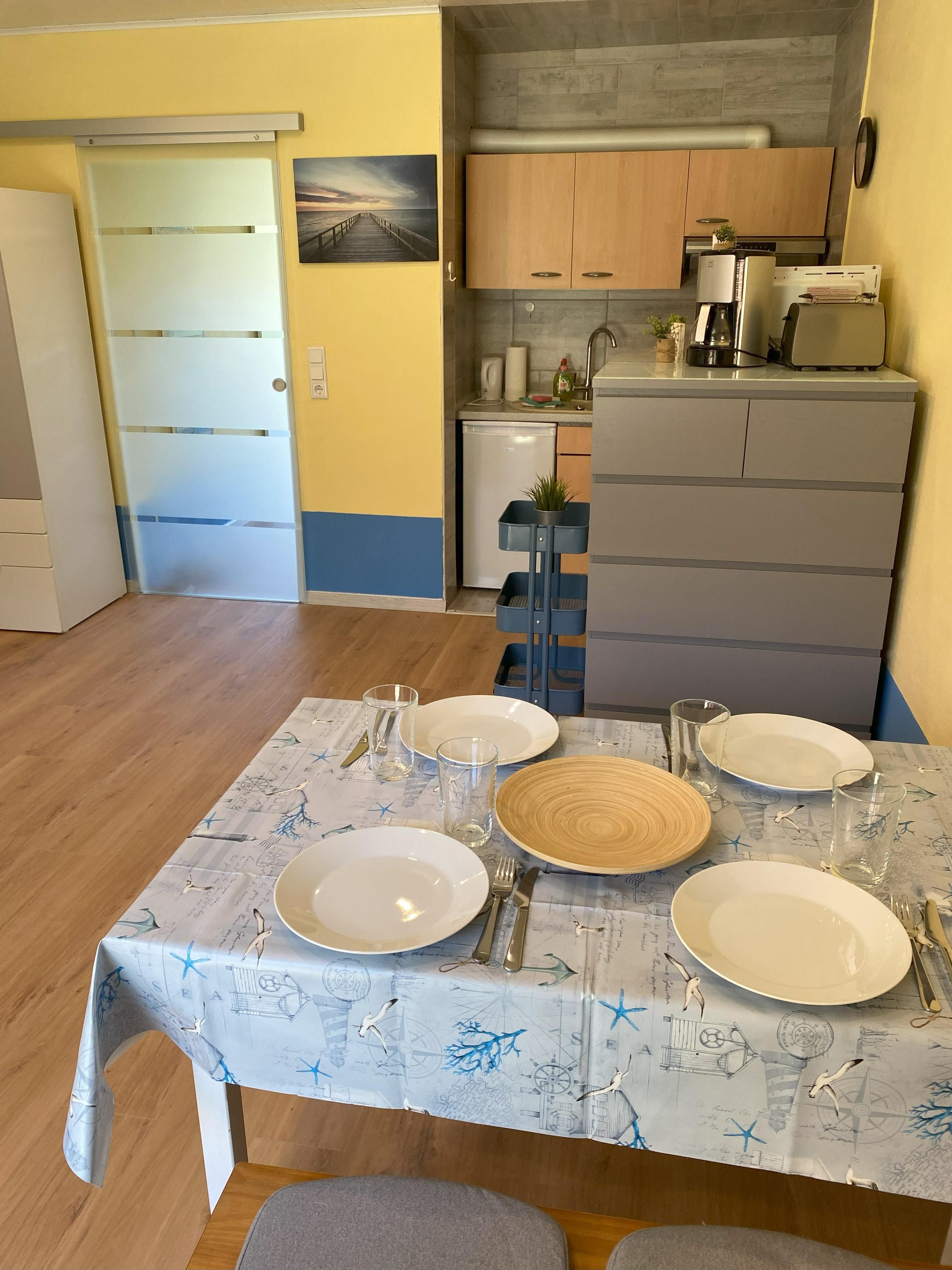 Zentrum der Wohnung ist der offene Wohn-/Ess-/Küchenbereich, hier lassen sich gemütliche Stunden mit den Liebsten verbringen. Dieser Bereich hat frisch einen warmen maritimen Touch erhalten durch entsprechende Farbgebung sowie neue Möblierung und Lampen.