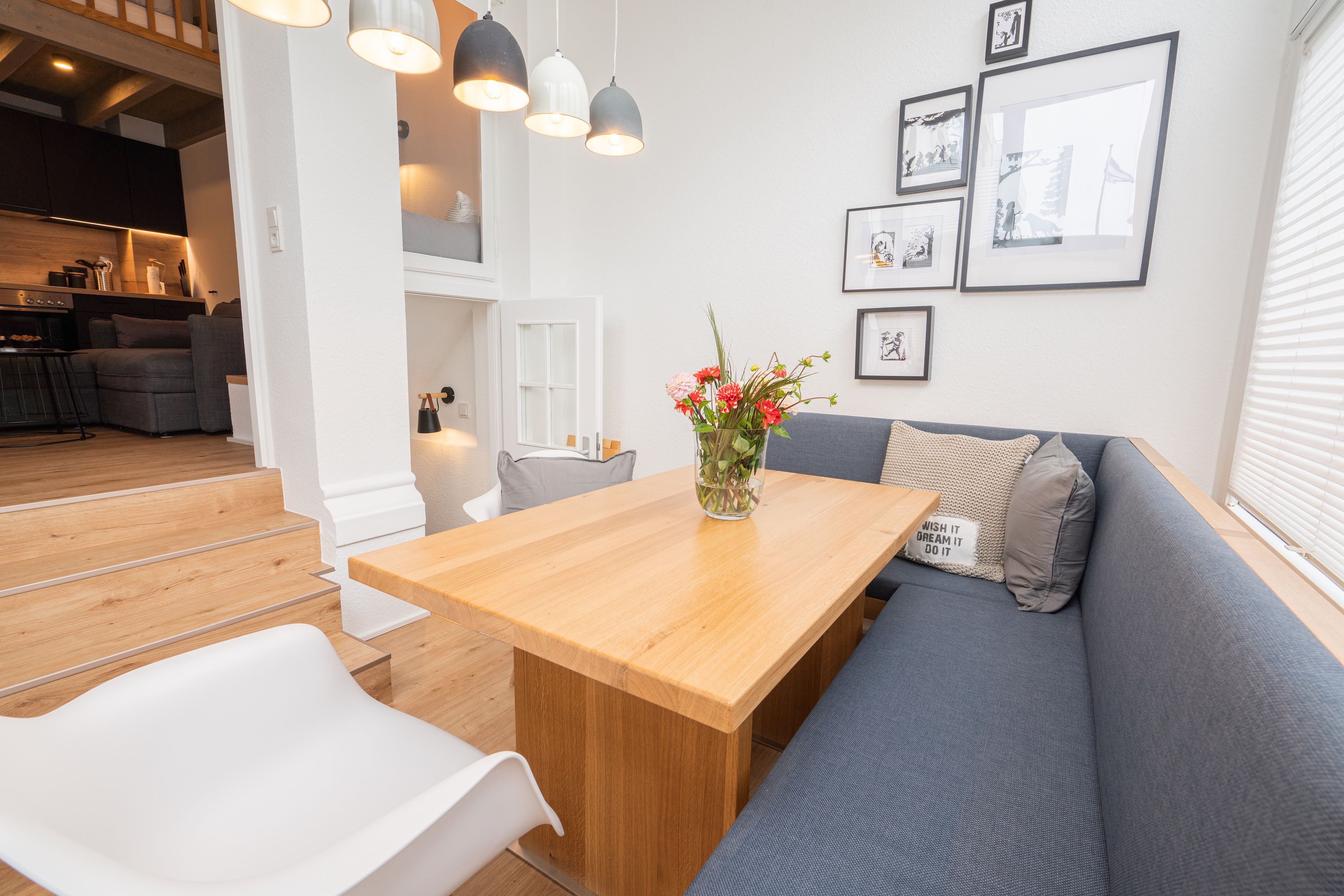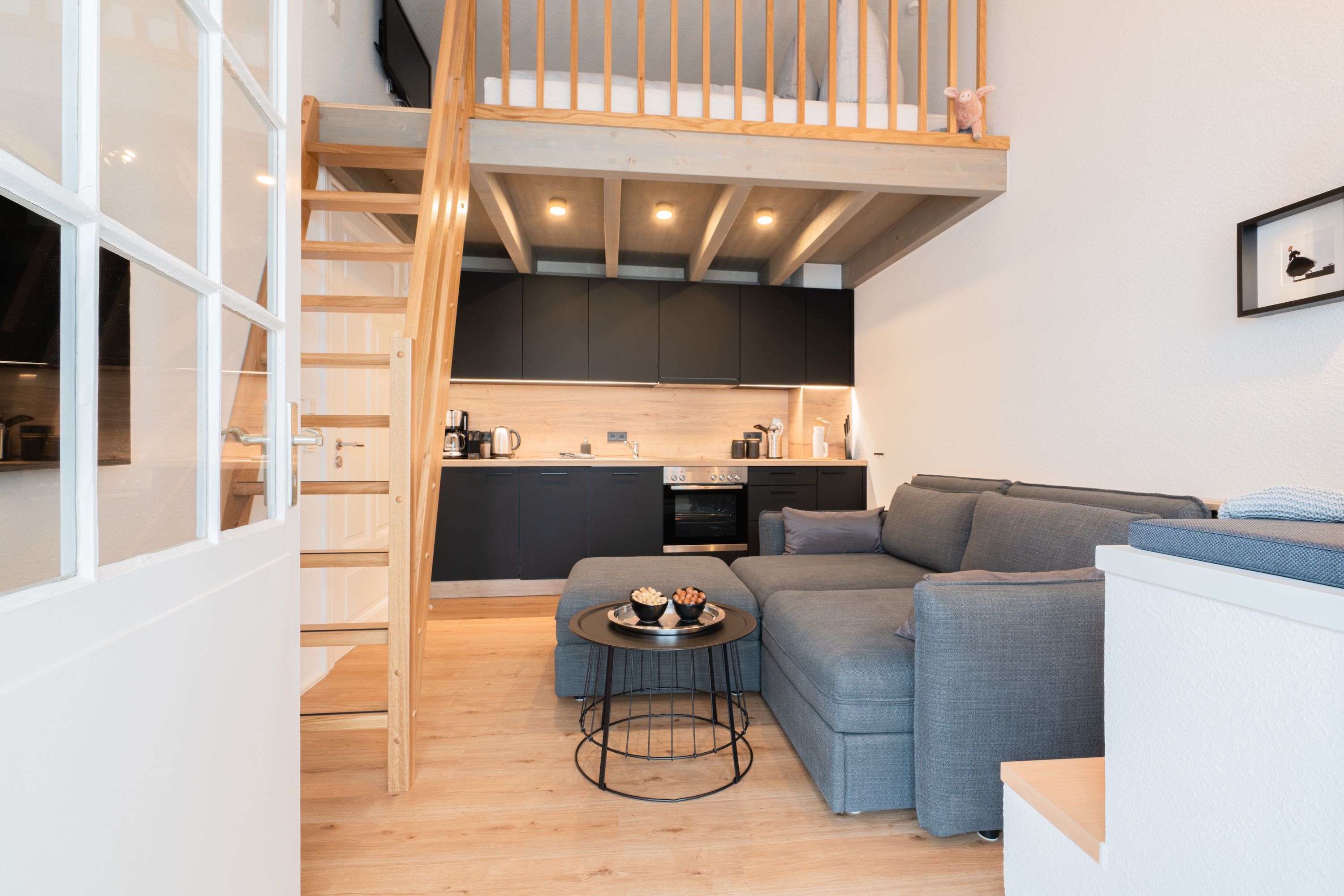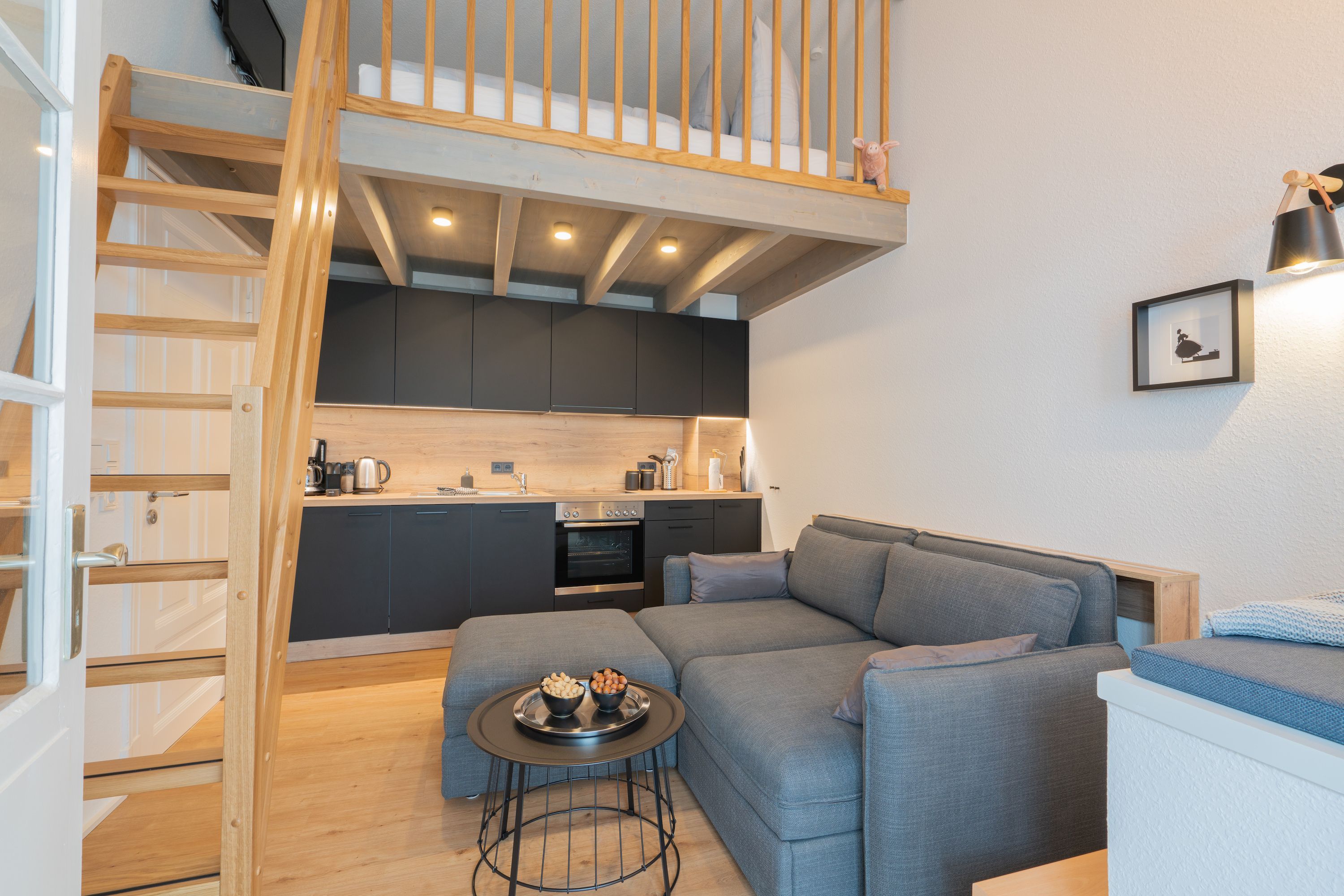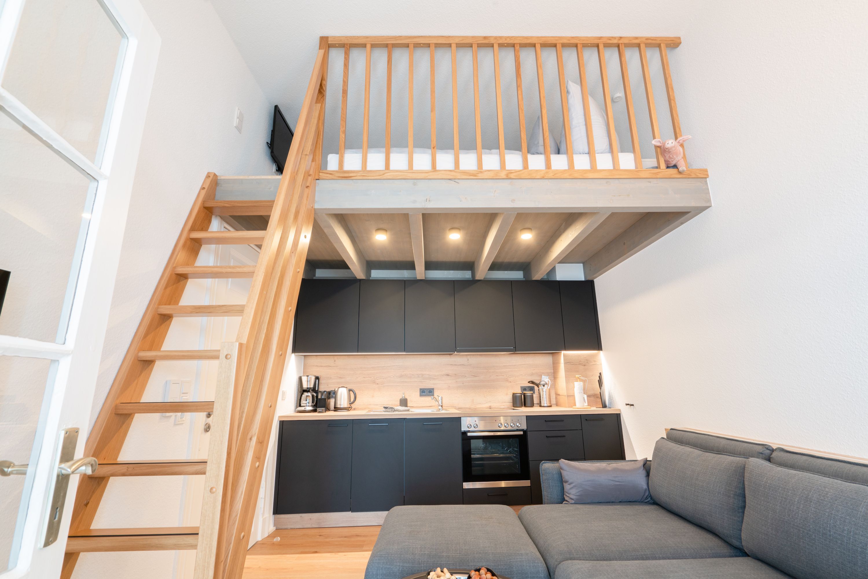 Die 42m2 große Ferienwohnung mein Meerchen wurde 2021 komplett saniert. Sie bietet ein gemütliches Urlaubserlebnis auf 4 Ebenen! Hinter der Eingangstür verbirgt sich der gemütliche Wohnbereich mit Couch, TV und angrenzender Küchenzeile. Ein echtes Highlight des Apartements ist das individuell eingebaute Hochbett im Wohnbereich. Zu diesem gelangen Sie über eine feste Treppe (Kinder sollten mindestens 6 Jahre bzw. kletterfest sein). Dort gibt es zwei 80x200cm Matratzen und einen TV für gemütliche Ruhezeiten. Im Wohnbereich ist zudem eine kleine Empore als gemütlicher Lesesitz vor einem innenliegenden Fenster eingerichtet. Vom Wohnbereich geht es über eine Treppe (4 Stufen) in den Erker der Wohnung. Am geräumigen Esstisch kann man gemeinsam essen und durch die Fenster des Treiben auf der Friedrichstraße beobachten. Alternativ kann man natürlich mit geschlossenen Plissees die Zeit einfach unter sich geniessen. Das innenliegende Schlafzimmer erreichen Sie von dort über eine weitere Treppe. Dort gibt es ein Doppelbett (180x200cm) und einen dritten Fernseher. Von diesem Raum abgehend gibt es ein kleines Zimmerchen mit Kleiderschrank und ein klitzekleines Badezimmer durch die praktische Schiebetür (Spiegel) kann man auf Wunsch einen der beiden Räume schließen. Das kleine, moderne Duschbad bietet Waschbecken und Dusche. Von dort geht eine Tür zum WC mit Abstellraum ab. Durch den ungewöhnlichen Schnitt hat die Ferienwohnung mein Meerchen sehr viel Charme, ist aber eher für Familien mit Kindern oder Freunde, die sich sehr gut kennen, geeignet.