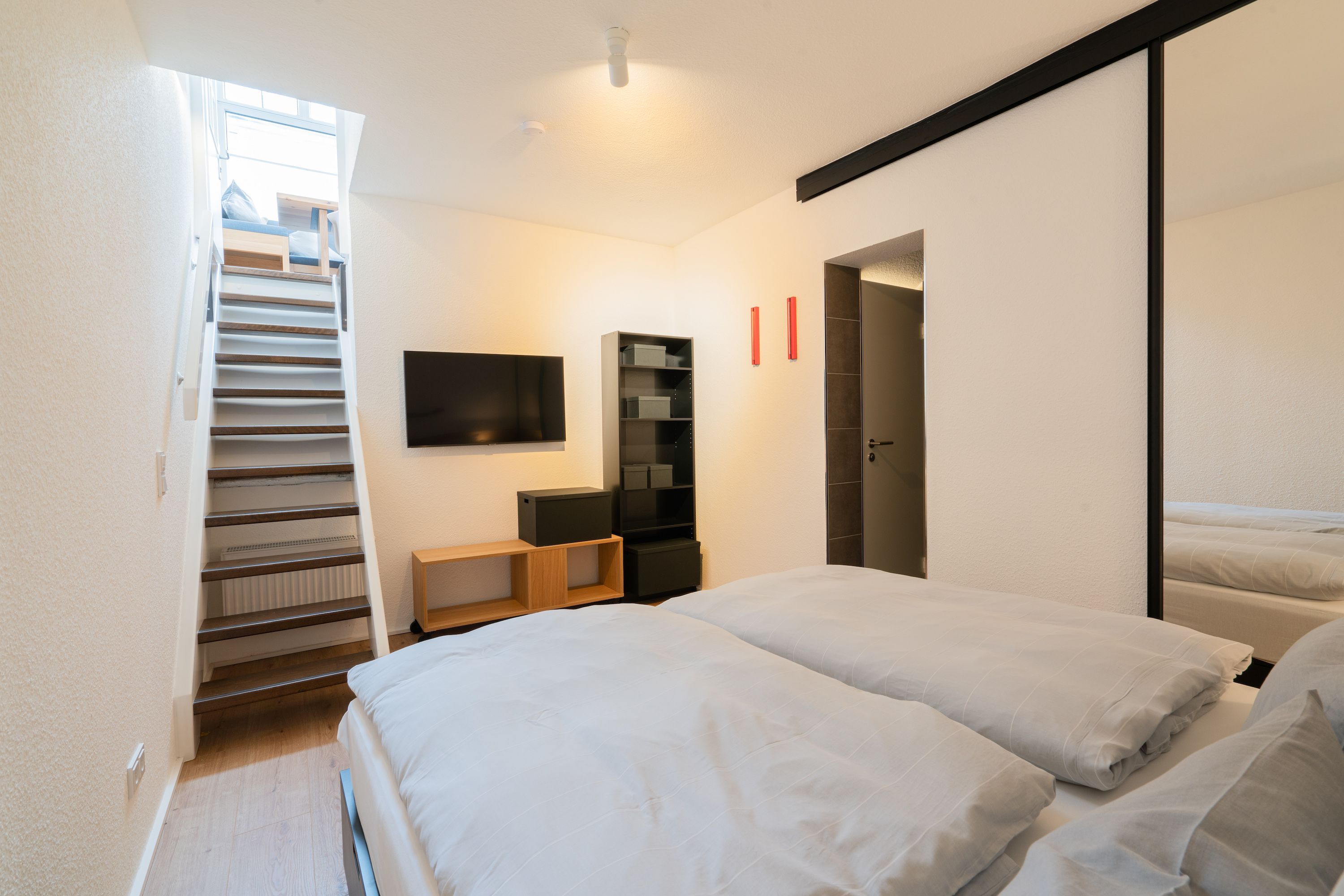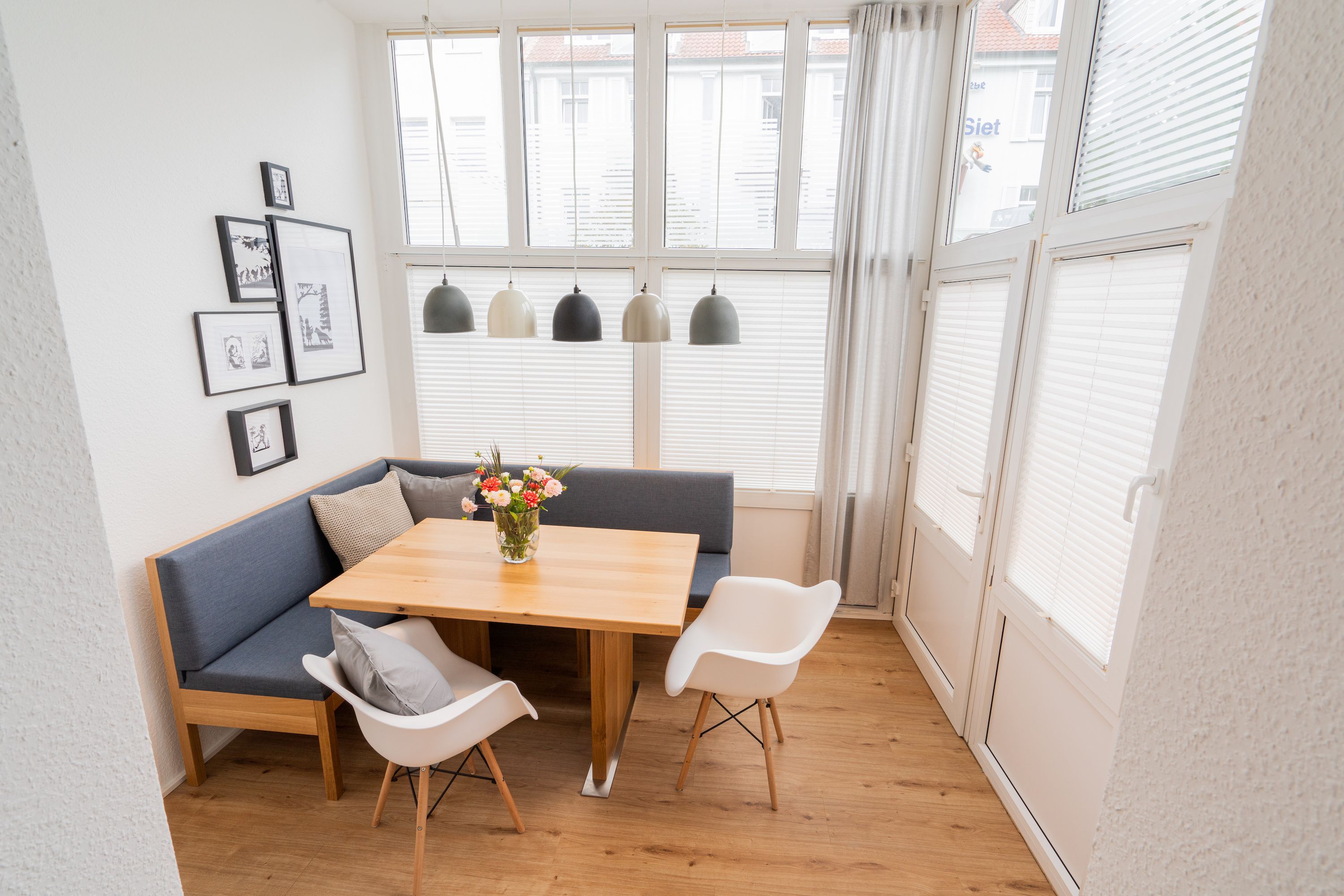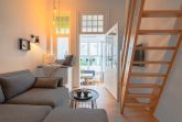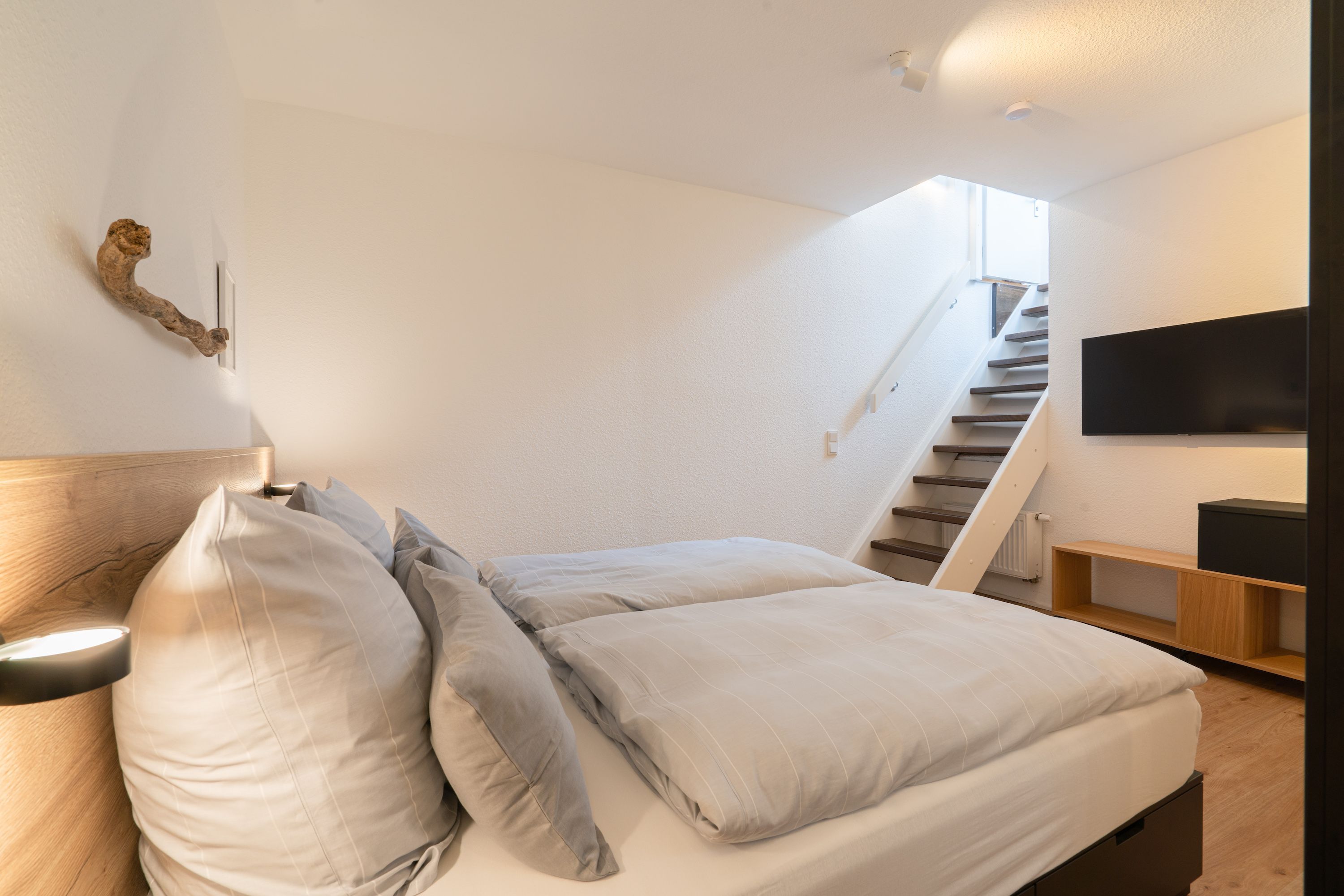 Die 42m2 große Ferienwohnung mein Meerchen wurde 2021 komplett saniert. Sie bietet ein gemütliches Urlaubserlebnis auf 4 Ebenen! Hinter der Eingangstür verbirgt sich der gemütliche Wohnbereich mit Couch, TV und angrenzender Küchenzeile. Ein echtes Highlight des Apartements ist das individuell eingebaute Hochbett im Wohnbereich. Zu diesem gelangen Sie über eine feste Treppe (Kinder sollten mindestens 6 Jahre bzw. kletterfest sein). Dort gibt es zwei 80x200cm Matratzen und einen TV für gemütliche Ruhezeiten. Im Wohnbereich ist zudem eine kleine Empore als gemütlicher Lesesitz vor einem innenliegenden Fenster eingerichtet. Vom Wohnbereich geht es über eine Treppe (4 Stufen) in den Erker der Wohnung. Am geräumigen Esstisch kann man gemeinsam essen und durch die Fenster des Treiben auf der Friedrichstraße beobachten. Alternativ kann man natürlich mit geschlossenen Plissees die Zeit einfach unter sich geniessen. Das innenliegende Schlafzimmer erreichen Sie von dort über eine weitere Treppe. Dort gibt es ein Doppelbett (180x200cm) und einen dritten Fernseher. Von diesem Raum abgehend gibt es ein kleines Zimmerchen mit Kleiderschrank und ein klitzekleines Badezimmer durch die praktische Schiebetür (Spiegel) kann man auf Wunsch einen der beiden Räume schließen. Das kleine, moderne Duschbad bietet Waschbecken und Dusche. Von dort geht eine Tür zum WC mit Abstellraum ab. Durch den ungewöhnlichen Schnitt hat die Ferienwohnung mein Meerchen sehr viel Charme, ist aber eher für Familien mit Kindern oder Freunde, die sich sehr gut kennen, geeignet.