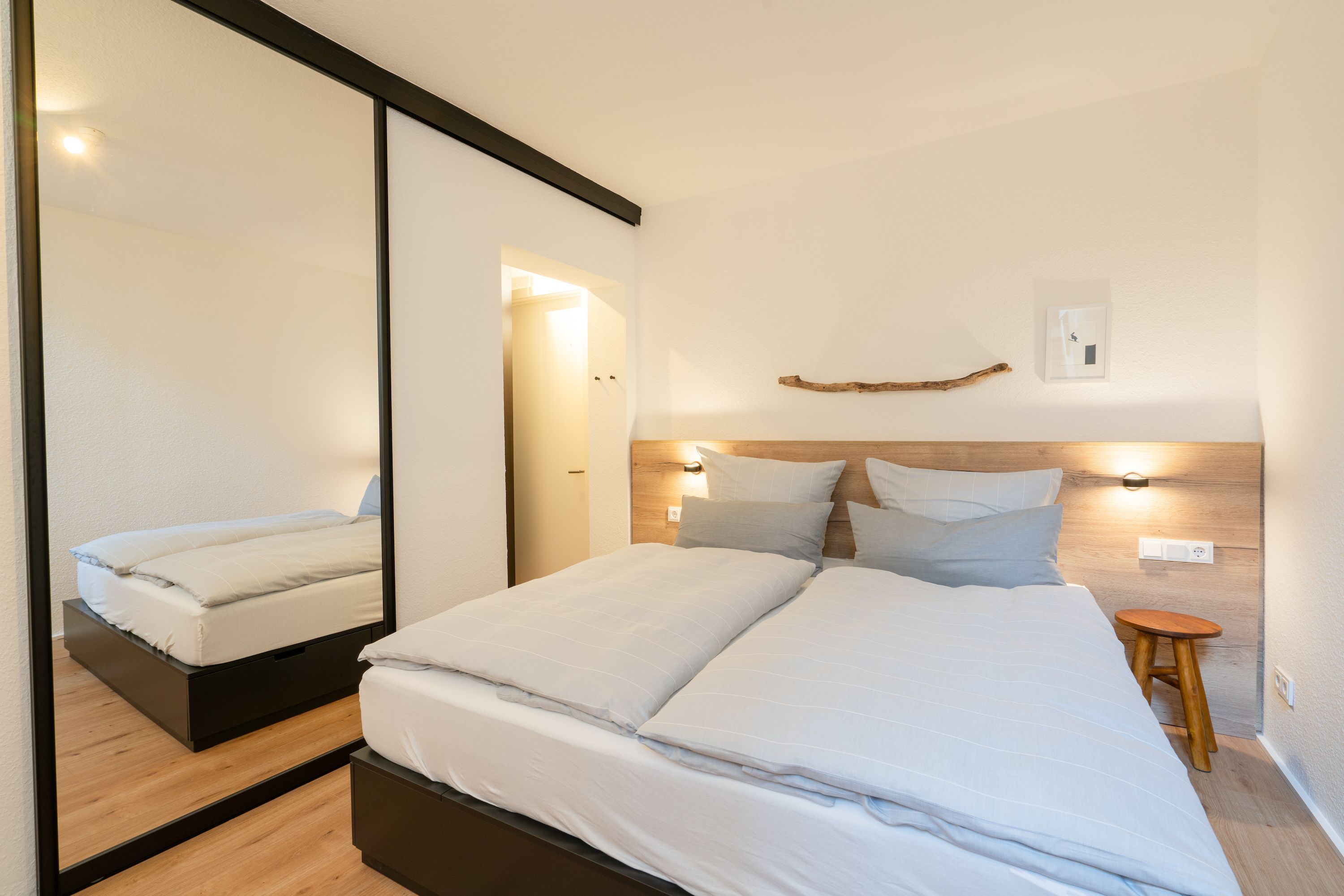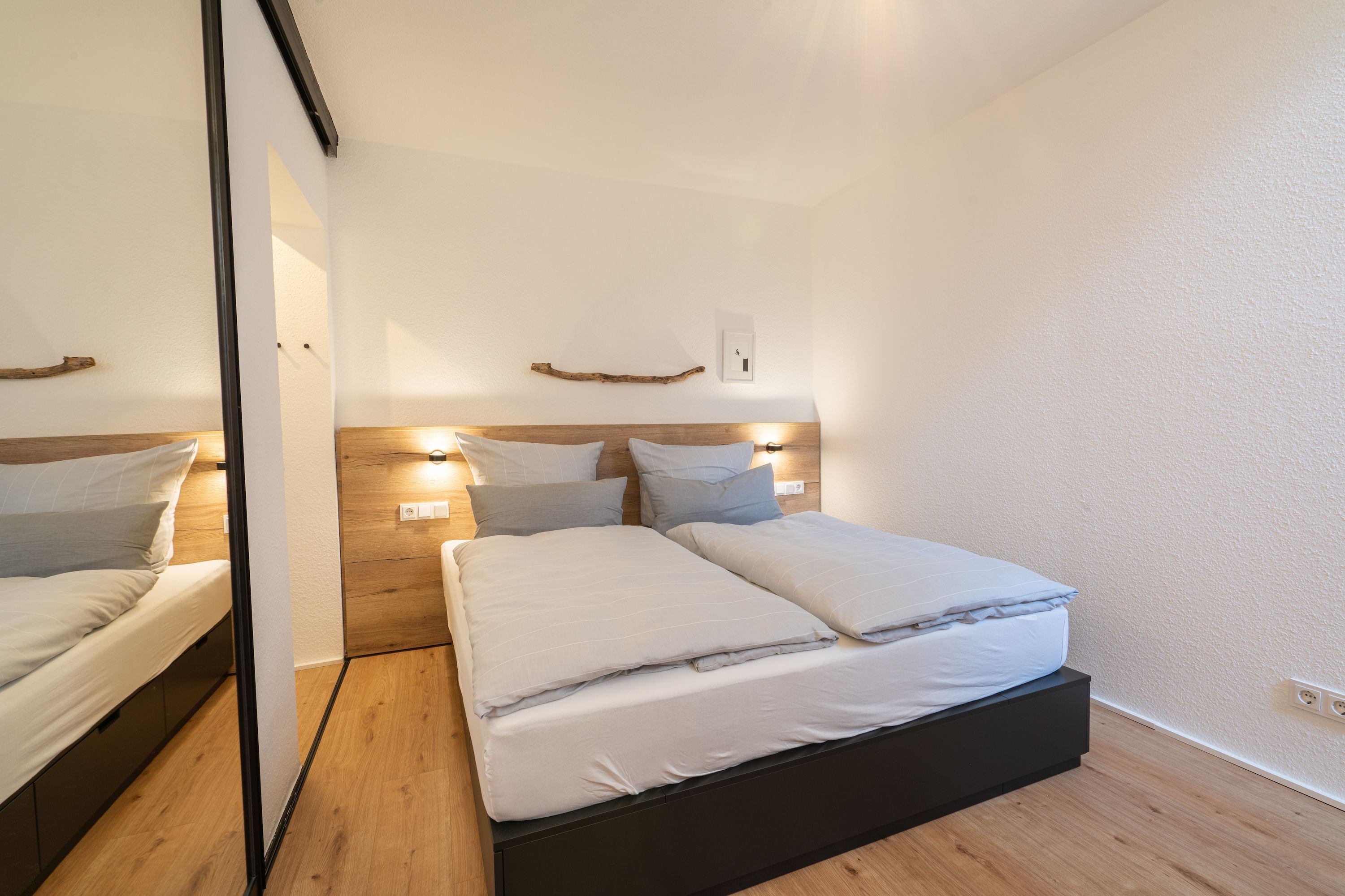 Die 42m2 große Ferienwohnung „mein Meerchen“ wurde 2021 komplett saniert. Sie bietet ein gemütliches Urlaubserlebnis auf 4 Ebenen! Hinter der Eingangstür verbirgt sich der gemütliche Wohnbereich mit Couch, TV und angrenzender Küchenzeile. Ein echtes Highlight des Apartements ist das individuell eingebaute Hochbett im Wohnbereich. Zu diesem gelangen Sie über eine feste Treppe (Kinder sollten mindestens 6 Jahre bzw. kletterfest sein). Dort gibt es zwei 80x200cm Matratzen und einen TV für gemütliche Ruhezeiten. Im Wohnbereich ist zudem eine kleine Empore als gemütlicher Lesesitz vor einem innenliegenden Fenster eingerichtet. Vom Wohnbereich geht es über eine Treppe (4 Stufen) in den Erker der Wohnung. Am geräumigen Esstisch kann man gemeinsam essen und durch die Fenster des Treiben auf der Friedrichstraße beobachten. Alternativ kann man natürlich mit geschlossenen Plissees die Zeit einfach „unter sich“ geniessen. Das innenliegende Schlafzimmer erreichen Sie von dort über eine weitere Treppe. Dort gibt es ein Doppelbett (180x200cm) und einen dritten Fernseher. Von diesem Raum abgehend gibt es ein kleines Zimmerchen mit Kleiderschrank und ein klitzekleines Badezimmer durch die praktische Schiebetür (Spiegel) kann man auf Wunsch einen der beiden Räume schließen. Das kleine, moderne Duschbad bietet Waschbecken und Dusche. Von dort geht eine Tür zum WC mit Abstellraum ab. Durch den ungewöhnlichen Schnitt hat die Ferienwohnung „mein Meerchen“ sehr viel Charme, ist aber eher für Familien mit Kindern oder Freunde, die sich sehr gut kennen, geeignet.