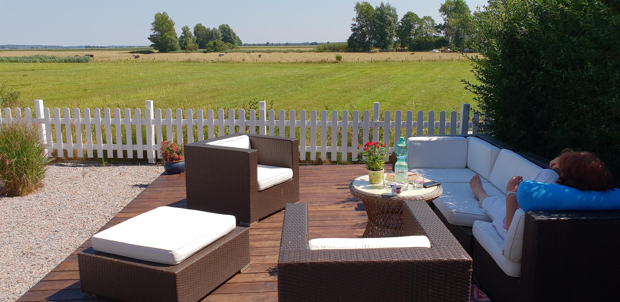 Sie ist mit zwei Schlafzimmern sowie einem großen Wohnzimmer mit Schlafsofa und einem großzügigen Essbereich ausgestattet. Vom Wohnzimmer erfolgt der Zugang zur Holzterrasse mit Blick über die weiten Felder. Die hochwertig eingerichtete Küche erfüllt viele Wünsche. Eine weitere Terrasse bietet Ihnen eine entspannte Aussicht auf die Treene. Von hier können Sie die Sonnenuntergänge und zu vorgerückter Stunde auch sternenklare Nächte genießen.