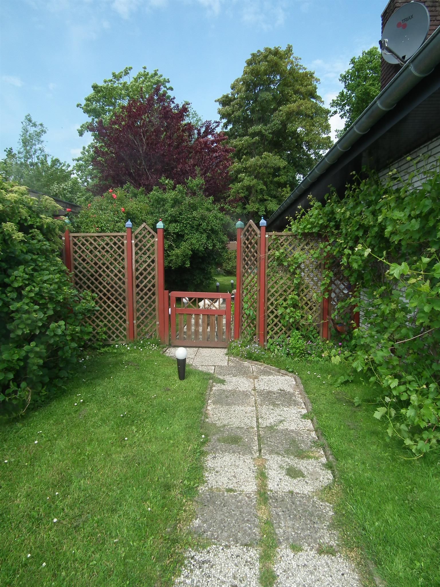 Neben einer großzügigen Terrasse gehört auch ein umzäunter Garten mit zum Grundstück.