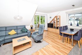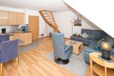 Im 1. OG kommen Sie über den Flur direkt in den hellen Wohn- und Essbereich mit einer gut ausgestatteten Einbauküche, einem Essbereich für 4 Personen und dem Zugang zum Balkon. Eine mobile Tischleuchte, mit WiFi Speaker und Bluetooth Lautsprecher lässt Sie Ihre eigenen Musiklisten abspielen. Vom Flur aus gelangen Sie in das große Duschbad mit WC und Waschmaschine, sowie ins Schlafzimmer mit Doppelbett und einem großen Kleiderschrank. Vom Wohnbereich, mit einer gemütlichen und hochwertigen Eckcouch und einem TV Sessel, führt Sie eine gut begehbare Holztreppe ins Dachgeschoss. Hier befindet sich ein kleineres Schlafzimmer mit einem Doppelbett. Ebenfalls befindet sich auf dieser Etage ein 2. Duschbad mit WC. Wir wünschen Ihnen einen schönen Urlaub.