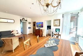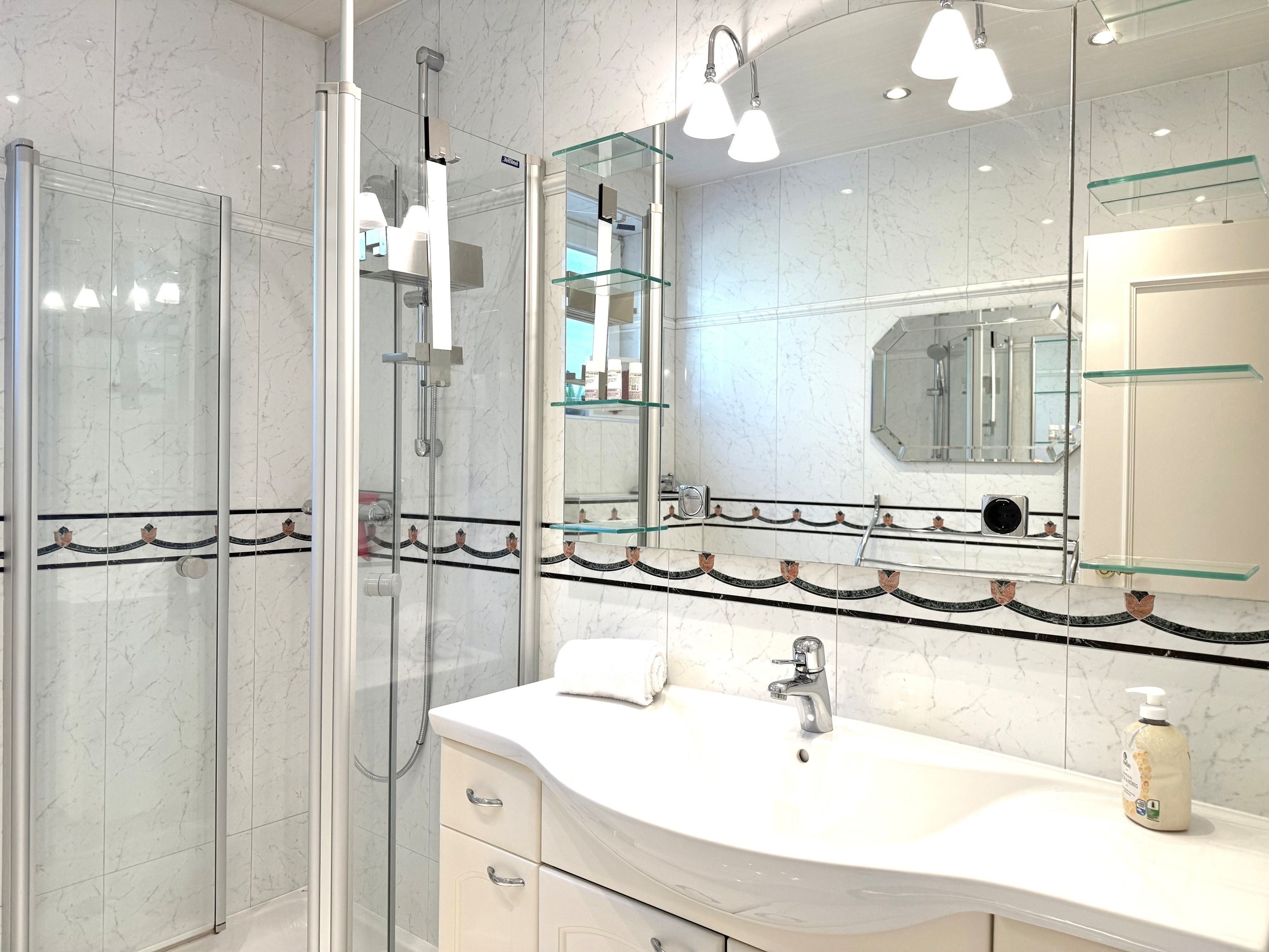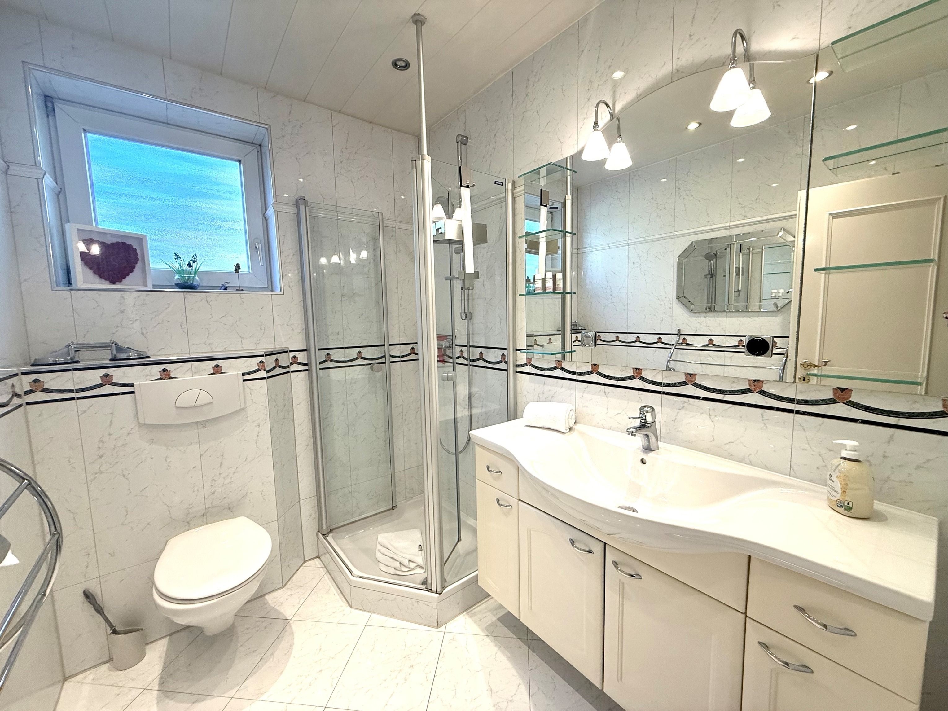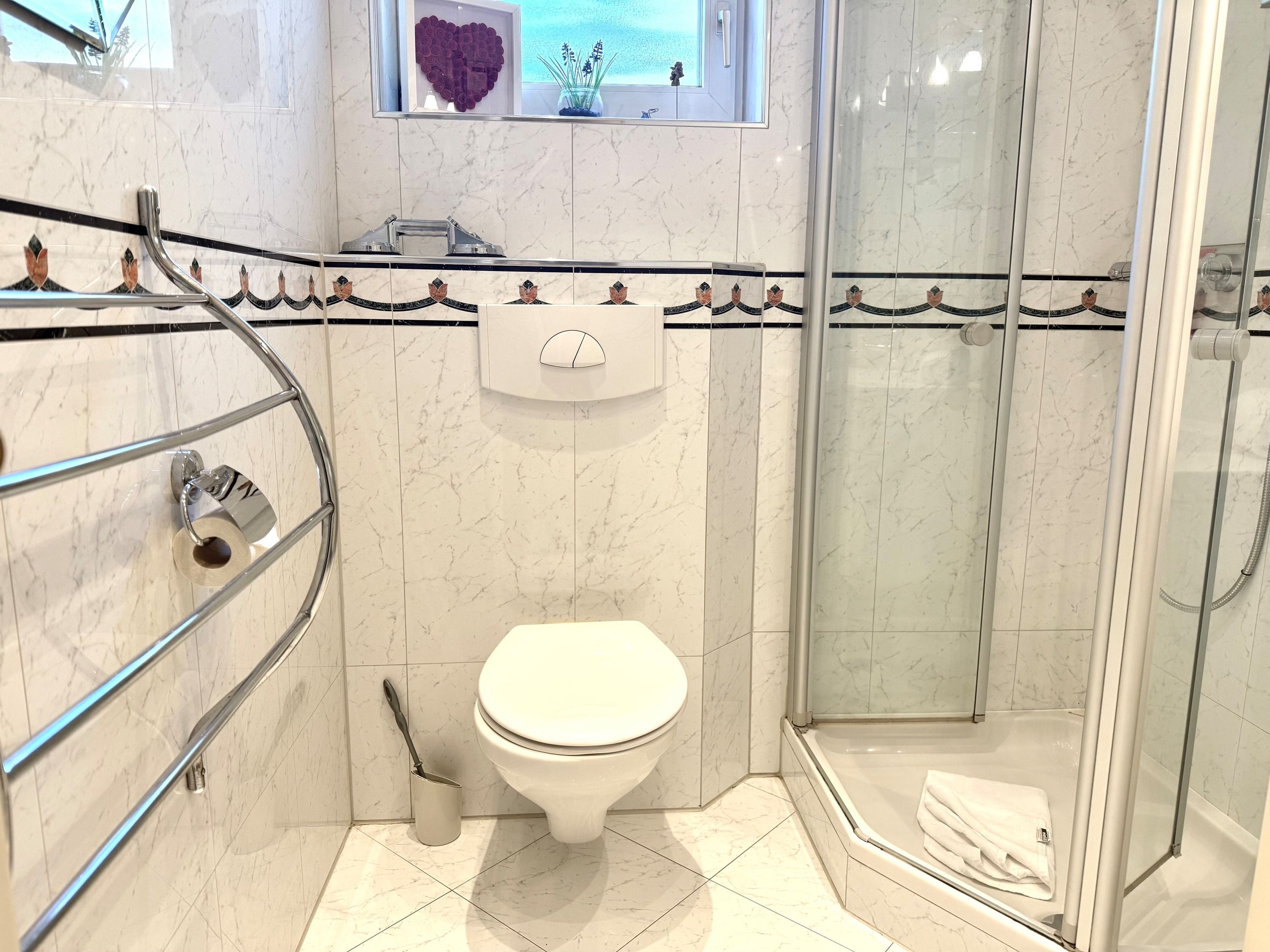 Richtige Urlaubsstimmung kommt auf der schönen Terrasse der Ferienwohnung auf. Im Badezimmer finden Sie eine Dusche und einen Haartrockner.