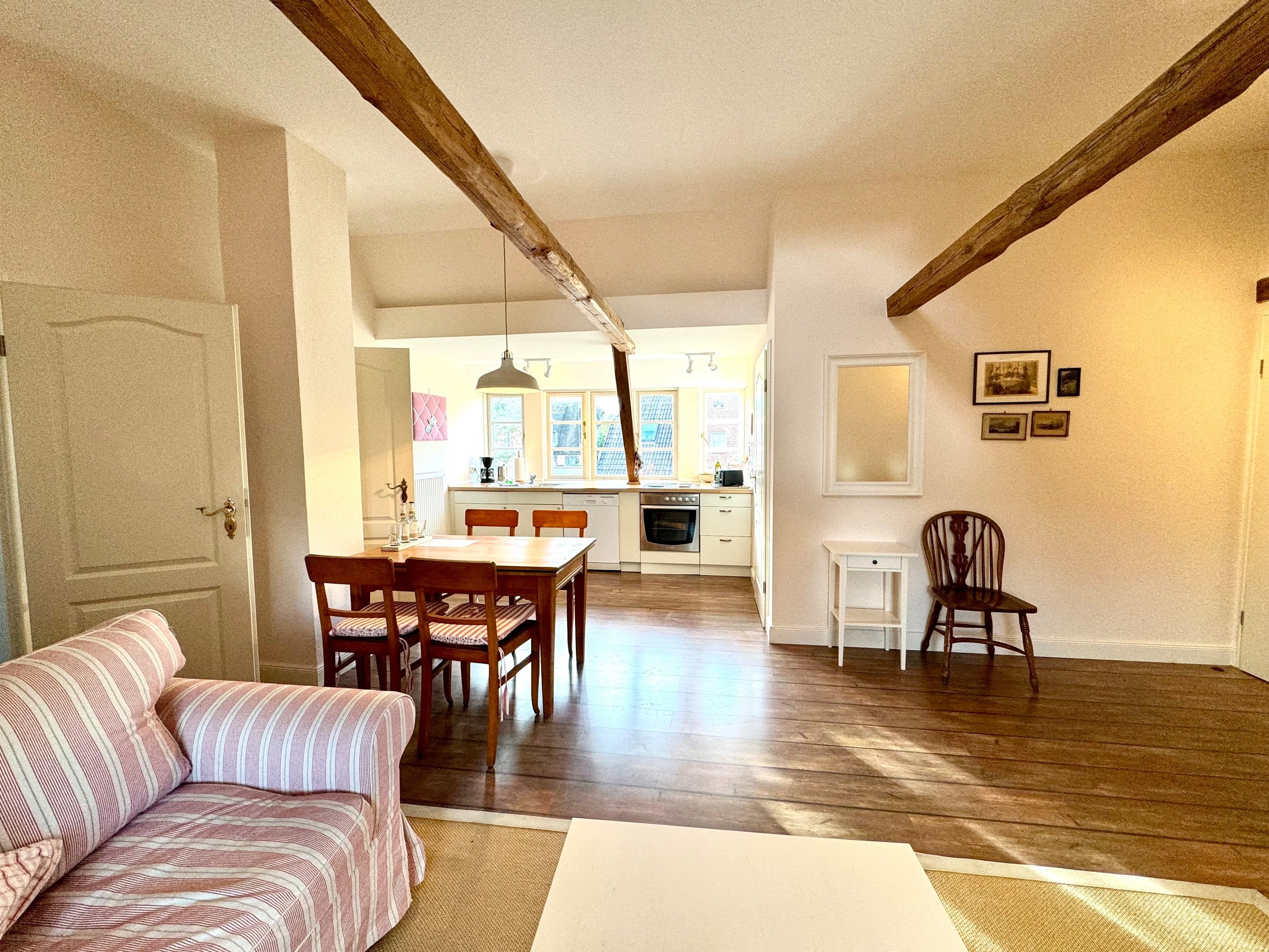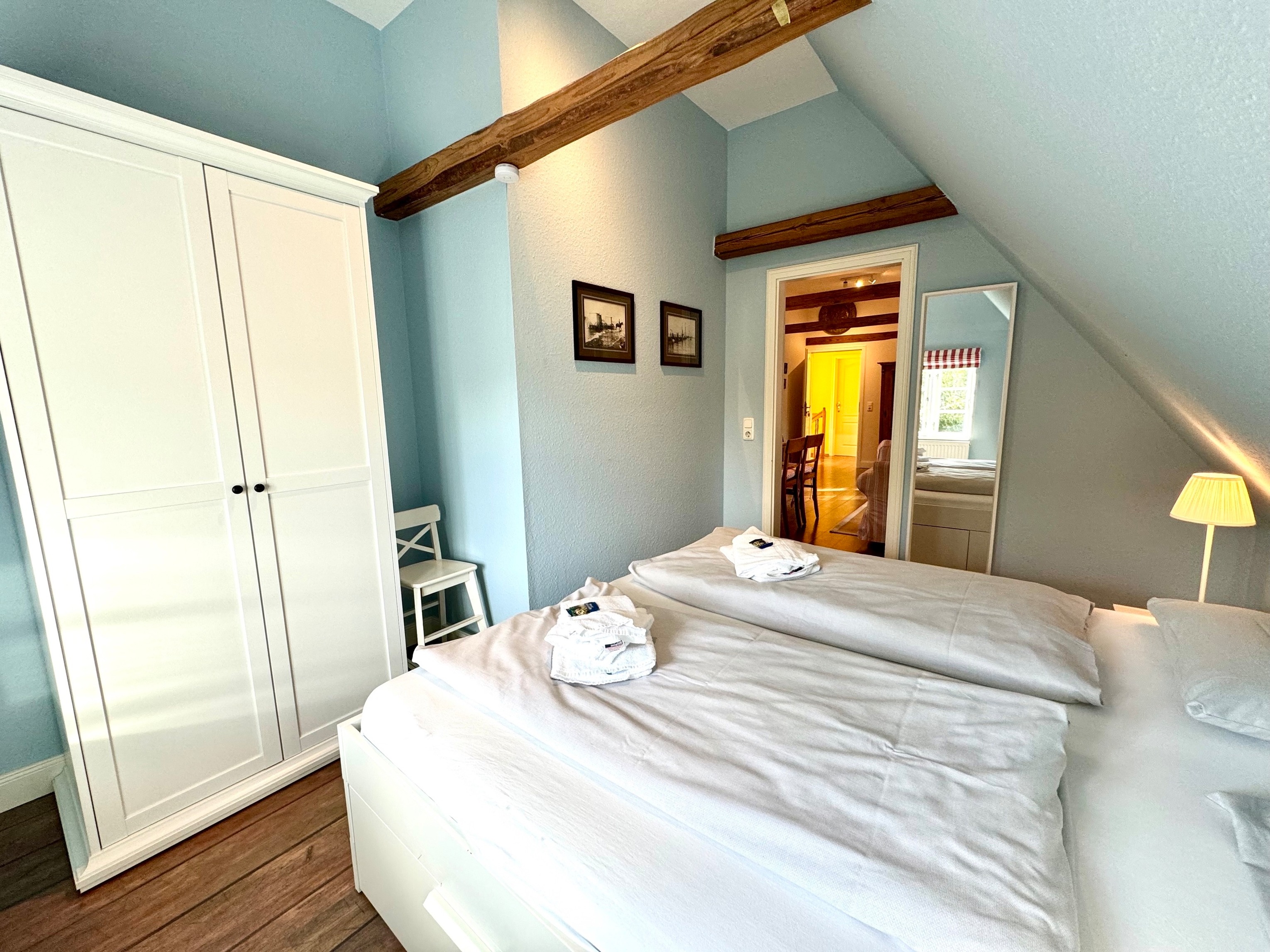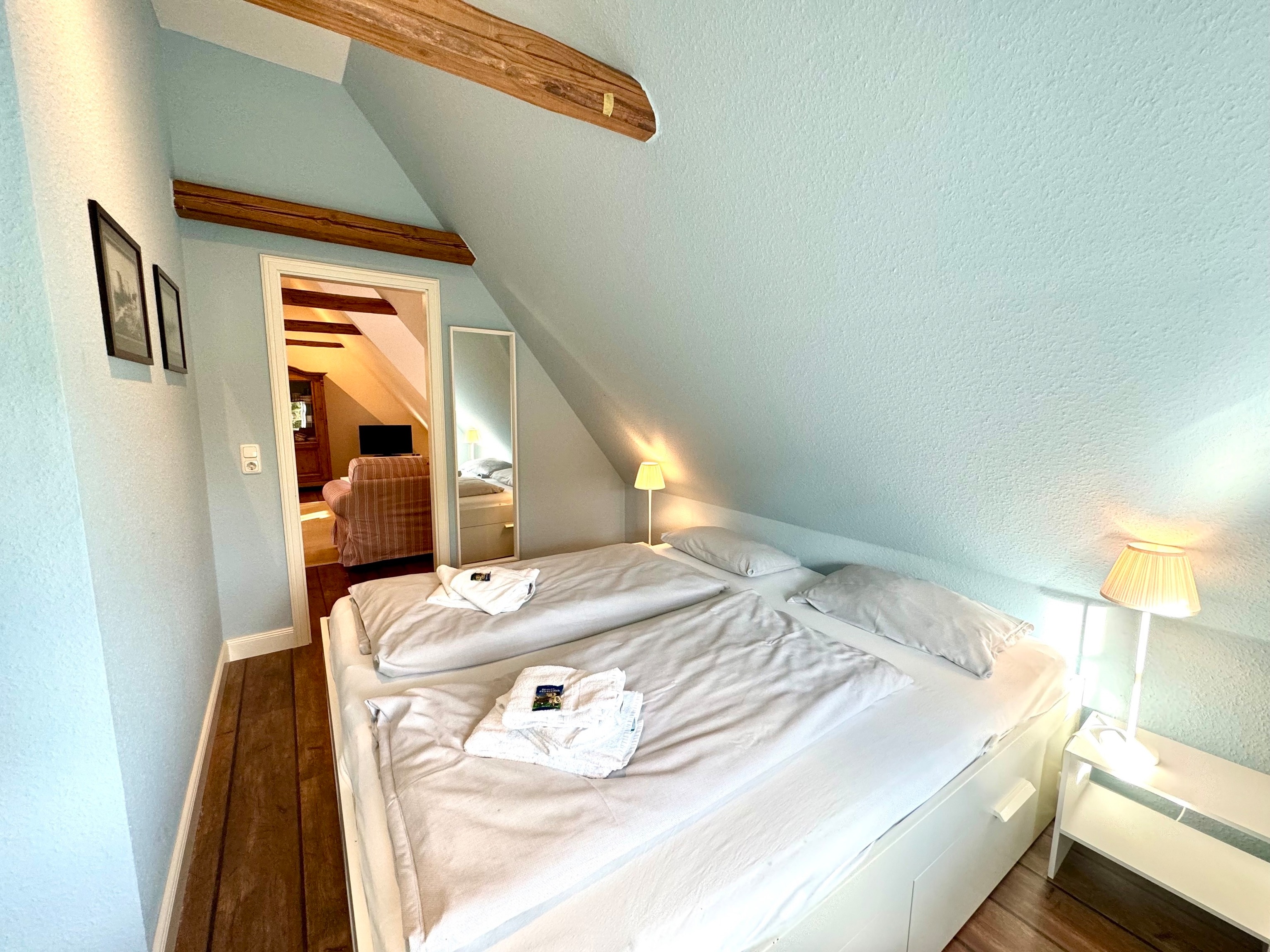 Die Große Wohnung liegt im 1. Obergeschoss. Durch den Friesengiebel ist die Wohnung groß und hell. Der Wohnraum verfügt über ein gemütliches Wohnzimmer und einem Esstisch. Aus dem Fenster schaut man in den Garten und über das ganze Dorf. Die Küche ist voll ausgestattet mit Backofen und Geschirrspüler. Auch ein alter Geschirrschrank, ein TV, eine Musikanlage und ein WLAN-Anschluss sind vorhanden. Das Badezimmer ist mit Dusche, Waschbecken und WC ausgestattet. Ein Schlafzimmer verfügt über ein Doppelbett, das andere über zwei Einzelbetten, welche jedoch auch zusammengeschoben werden können. Die Schlafzimmer sind hell und freundlich und verfügen über Kleiderschränke. Ein nettes Essen oder einen schönen Tee kann man gut im eigenen Garten genießen.