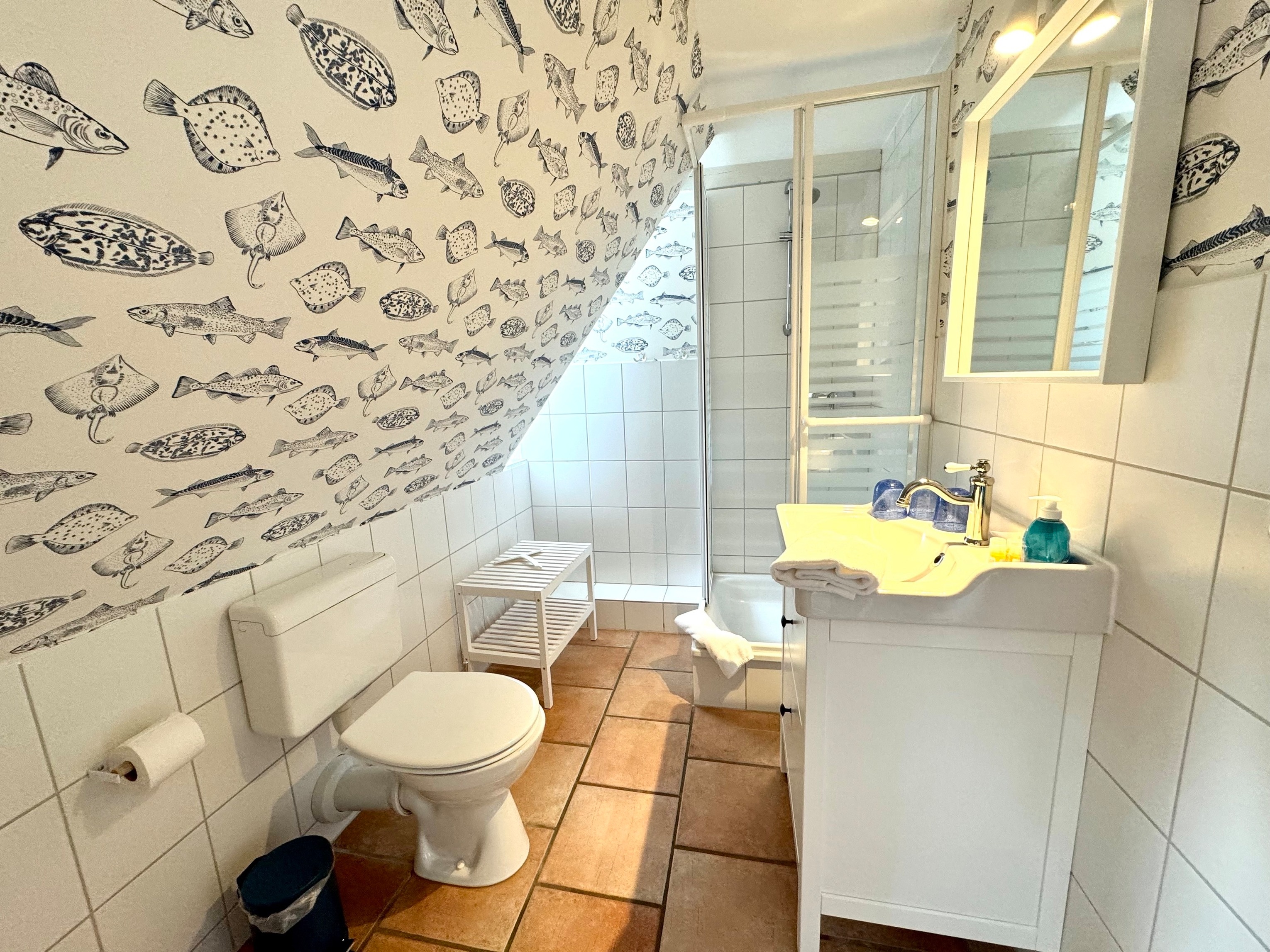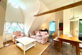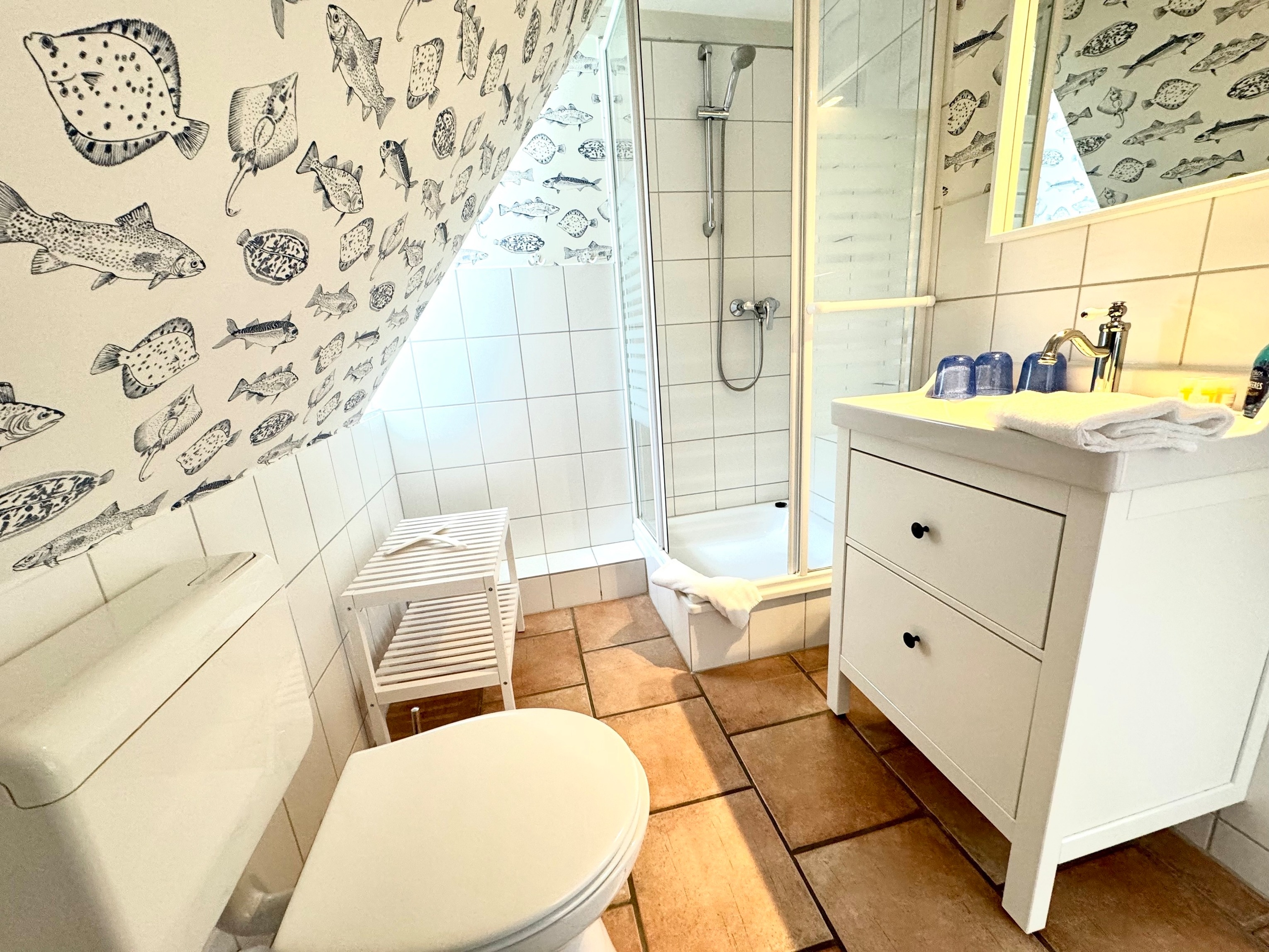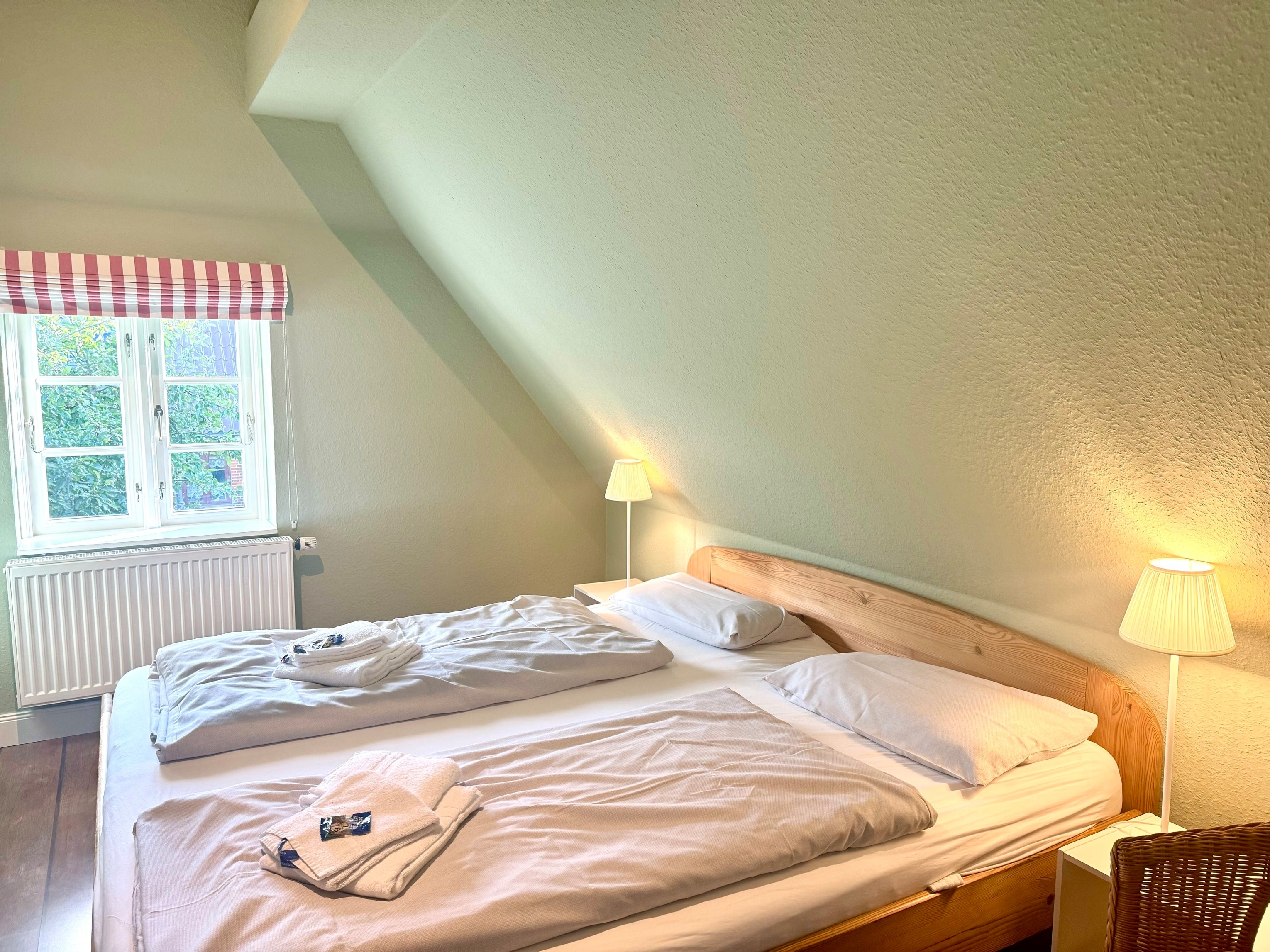 Die Große Wohnung liegt im 1. Obergeschoss. Durch den Friesengiebel ist die Wohnung groß und hell. Der Wohnraum verfügt über ein gemütliches Wohnzimmer und einem Esstisch. Aus dem Fenster schaut man in den Garten und über das ganze Dorf. Die Küche ist voll ausgestattet mit Backofen und Geschirrspüler. Auch ein alter Geschirrschrank, ein TV, eine Musikanlage und ein WLAN-Anschluss sind vorhanden. Das Badezimmer ist mit Dusche, Waschbecken und WC ausgestattet. Ein Schlafzimmer verfügt über ein Doppelbett, das andere über zwei Einzelbetten, welche jedoch auch zusammengeschoben werden können. Die Schlafzimmer sind hell und freundlich und verfügen über Kleiderschränke. Ein nettes Essen oder einen schönen Tee kann man gut im eigenen Garten genießen.