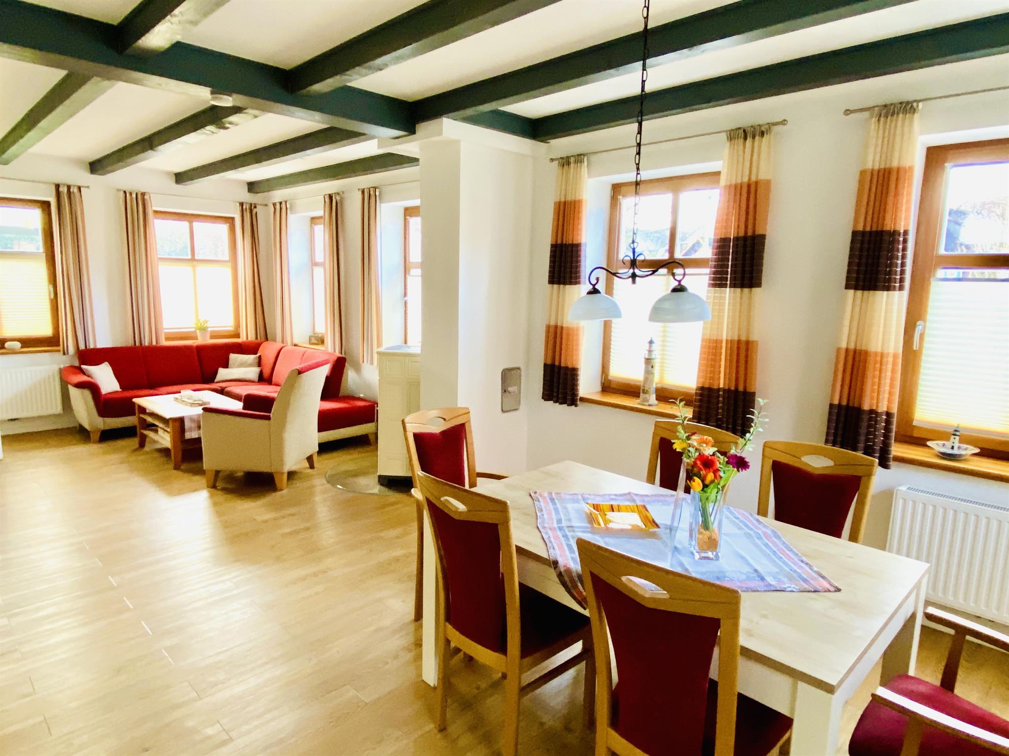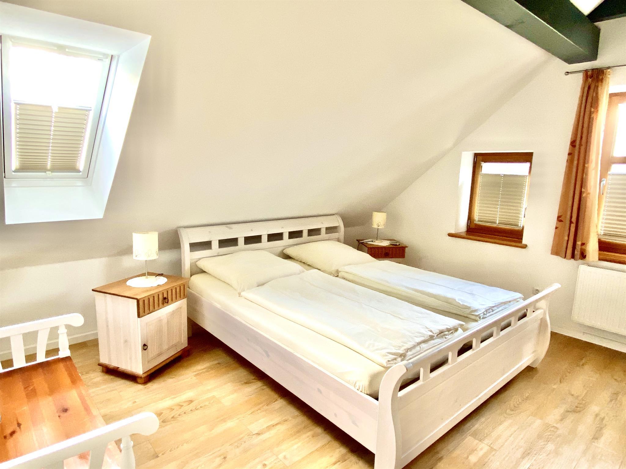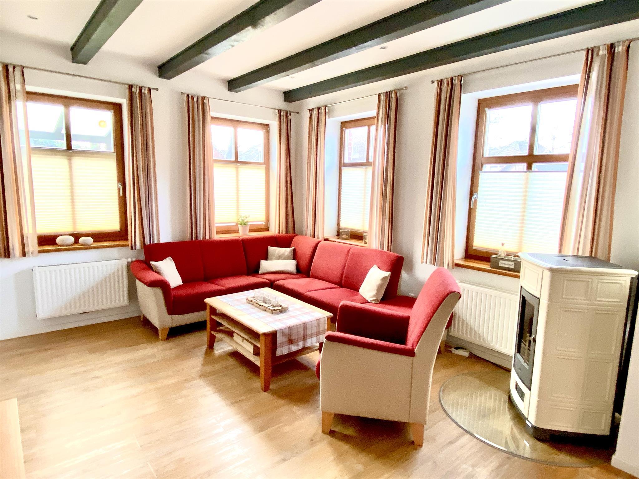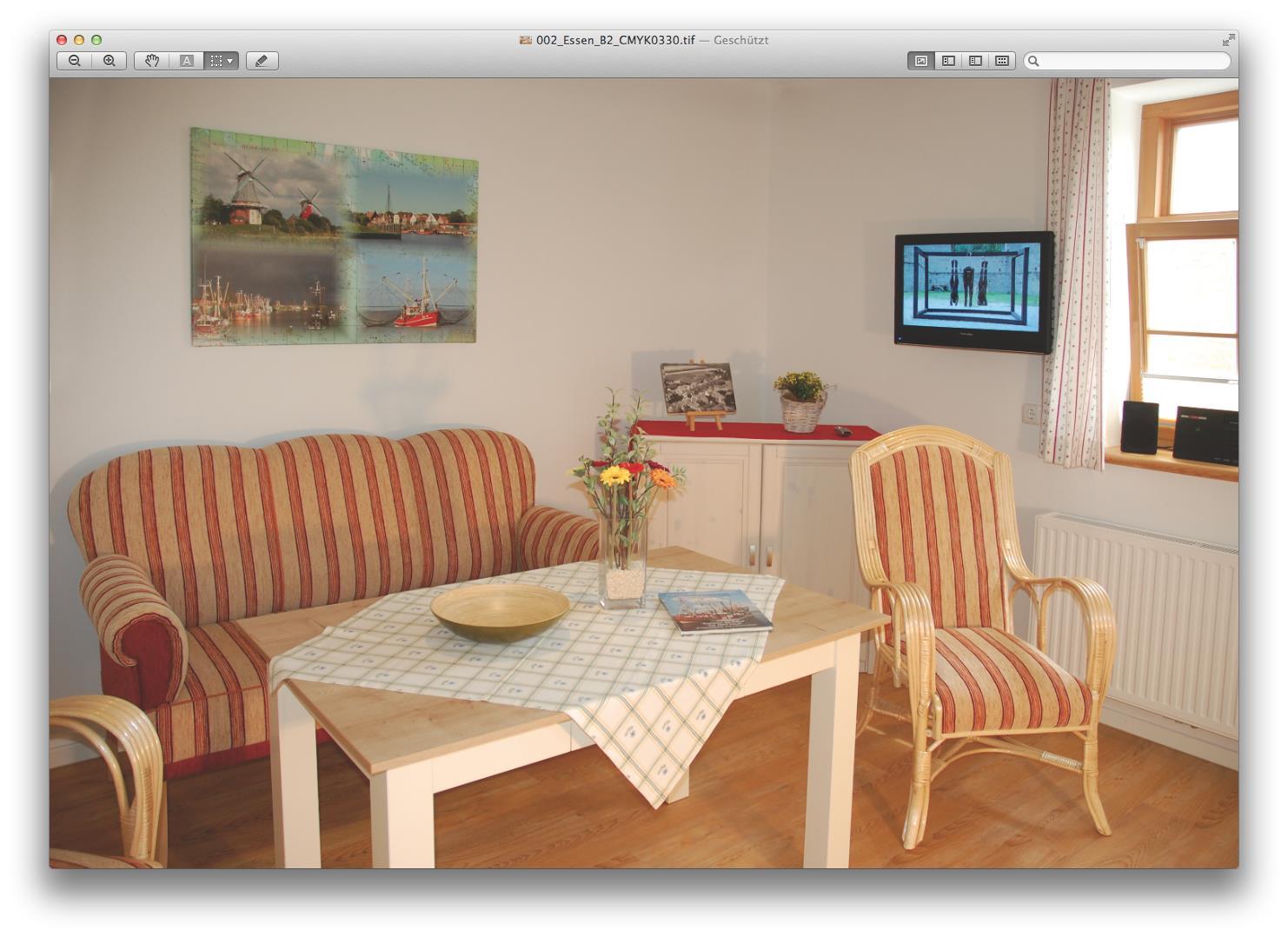 Die Wohnung 3 hat eine Wohnfläche von 90 m² und besteht aus einem großen Wohnzimmer mit Kamin, einer Essecke und Einbauküche, zwei Schlafzimmern mit TV und zwei Badezimmern. Auch diese Wohnung liegt direkt am Deich und ist nur 2 Minuten vom Ortskern entfernt.