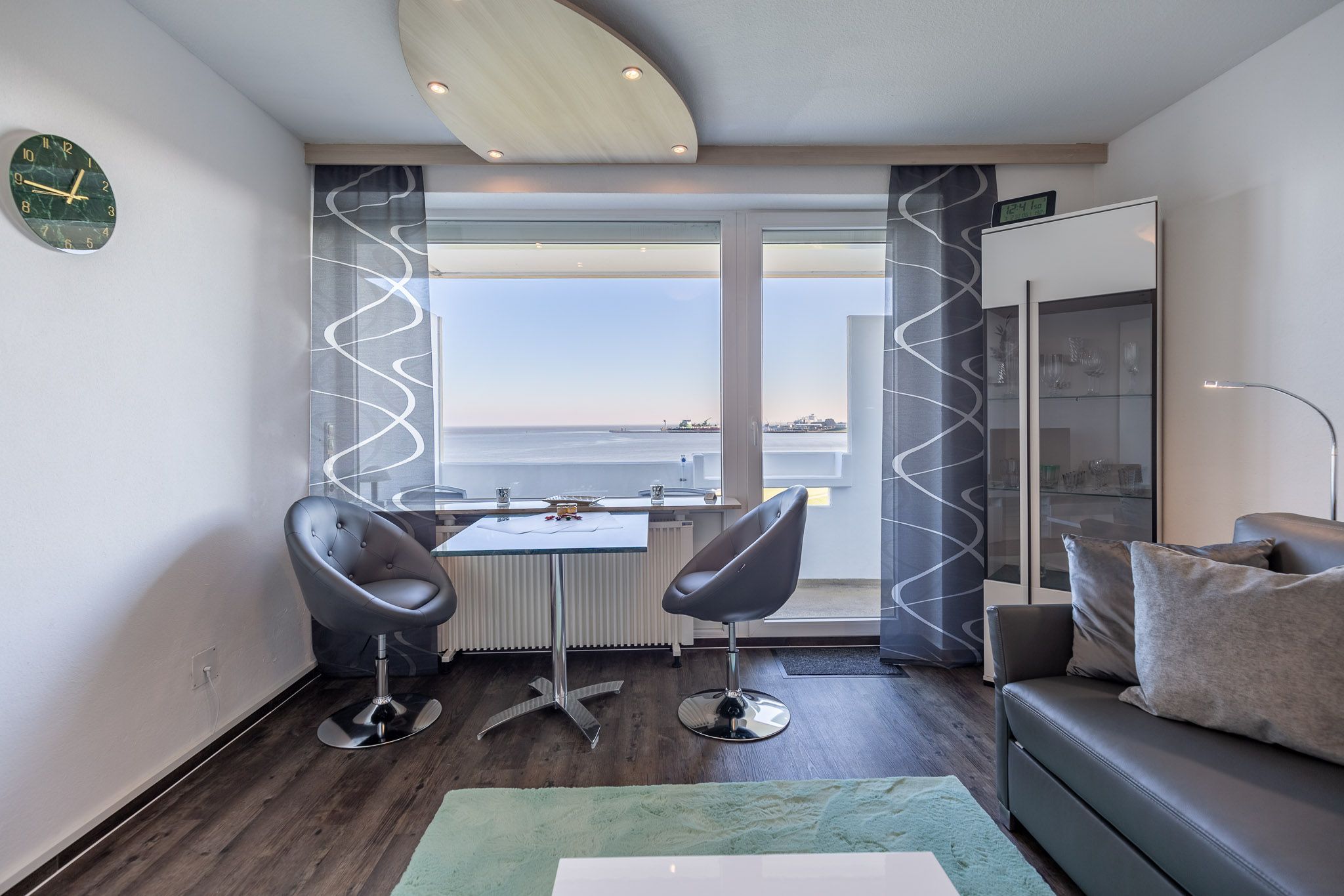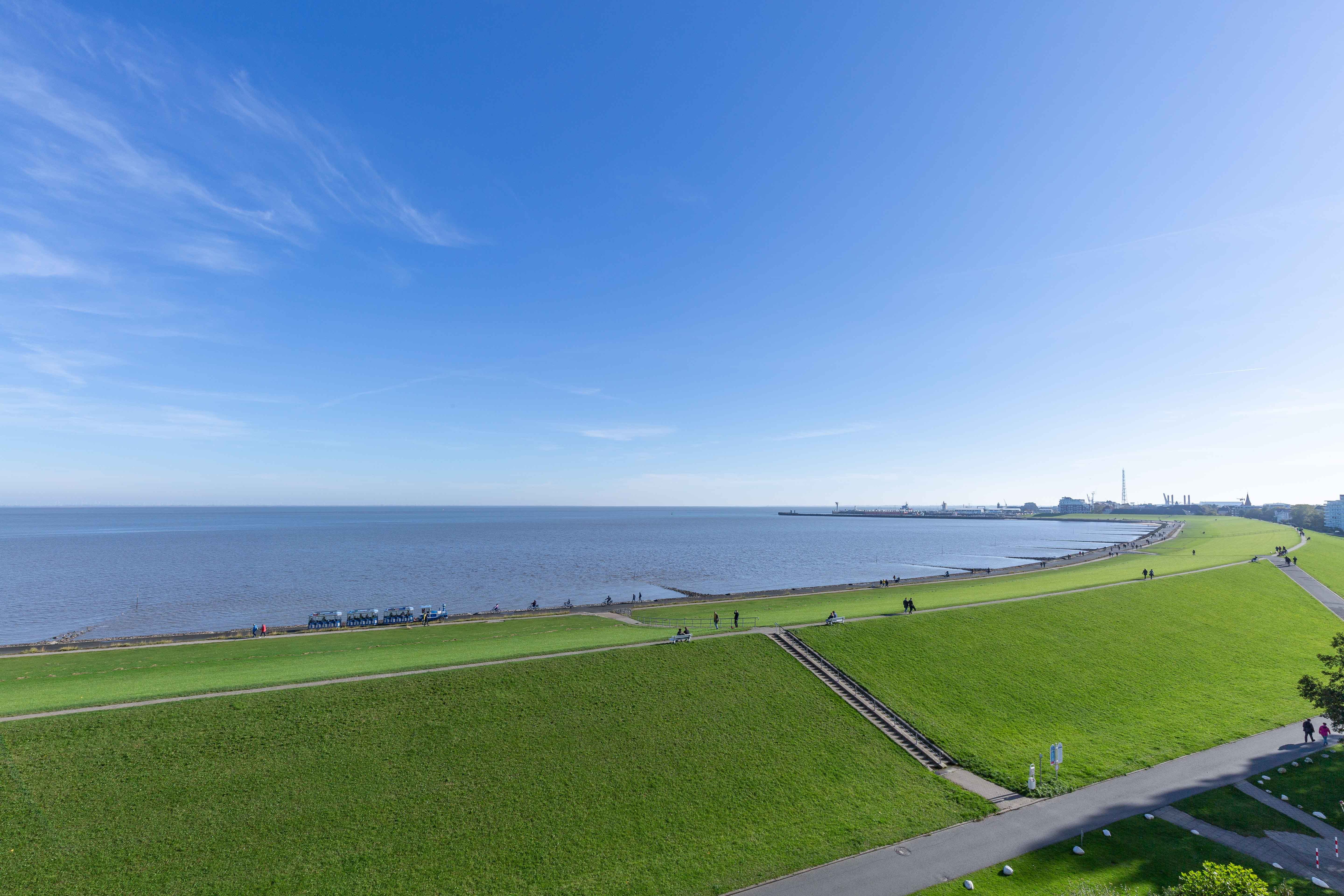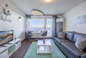 Aufwachen mit einzigartigem Meerblick. Frühstück hoch über der Elbe. Weiter Blick, warme Farben und gemütliches Ambiente verleihen der 35 m² Ferienwohnung in der 6. Etage eine besondere Note. Die Wohnung ist optimal für eine Belegung mit 2-3 Personen. Nach einem langen und erlebnisreichen Tag können Sie sich bei dem traumhaften Ausblick auf die vorbeifahrenden Schiffe entspannen. Hierzu eignen sich der Esstisch direkt am Fenster oder der Balkon bei Sonnenschein. Eine kleine, komplett ausgestattete Küchenzeile ist im Wohnbereich integriert.