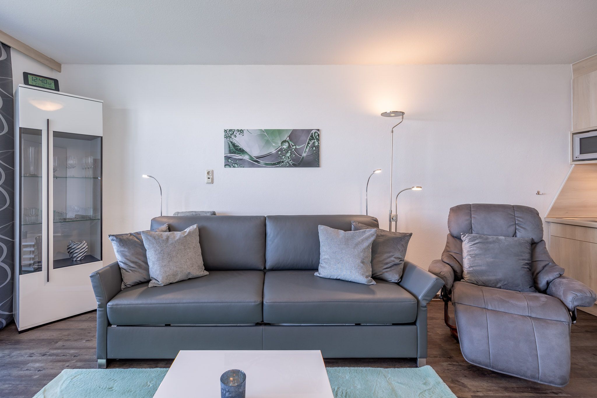 Das Schlafsofa (180x200) mit Komforthöhe bietet am Tage einen gemütlichen Platz zum verweilen, zusätzlich bietet ein Relax Sessel platz zum Blick in die Ferne schweifen und die vorbeifahrenden Schiffe zu beobachten. Elektrische Außenjalousien gewährleisten, dass Sie nicht von der Morgensonne geweckt werden. Außerdem bietet ein separates Einzelbett (90x200) im Vorraum eine vom Wohnbereich abgetrennte Schlafmöglichkeit. Das Bad mit Dusche und WC verfügt über ein Fenster zum Belüften.