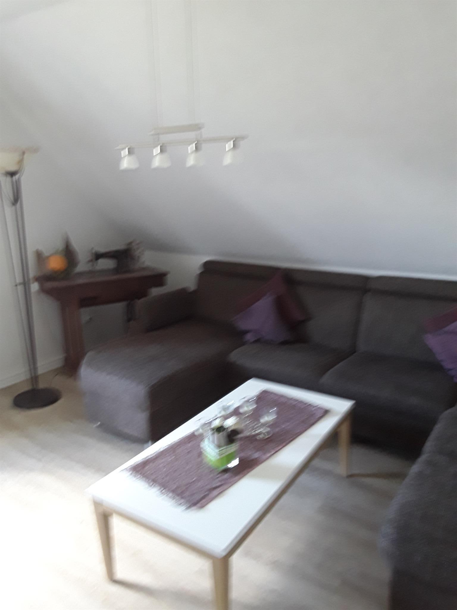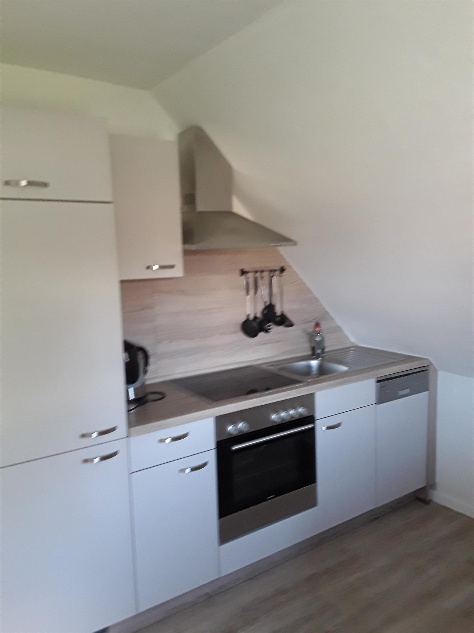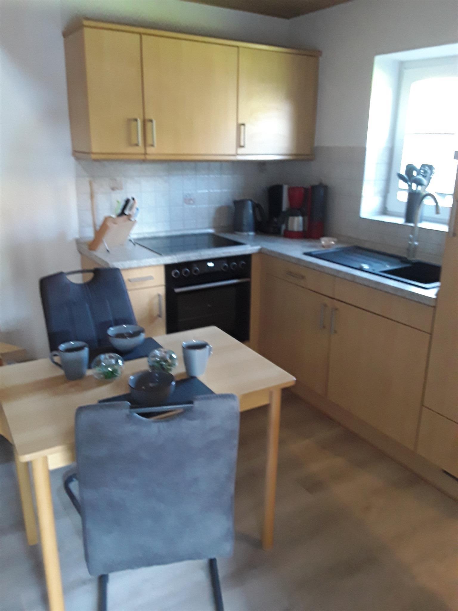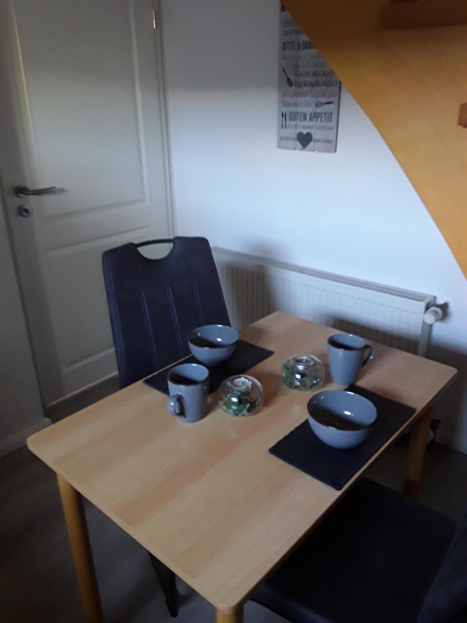 Diese Ferienwohnung bietet auf ca. 50 qm Wohnfläche auf zwei Etagen (Erd- und 1. Obergeschoss) ein gemütliches Wohnzimmer , einen Schlafraum mit Doppelbett, eine sehr gut ausgestattete separate Einbauküche (4 Platten-Herd mit Backofen, Dunstabzugshaube, Kühlschrank, Kaffeemaschine, Wasserkocher, Eierkocher, Toaster, Geschirr, Kochtöpfe) und Esstisch, und ein Bad mit Dusche, Waschbecken, WC, Fön.