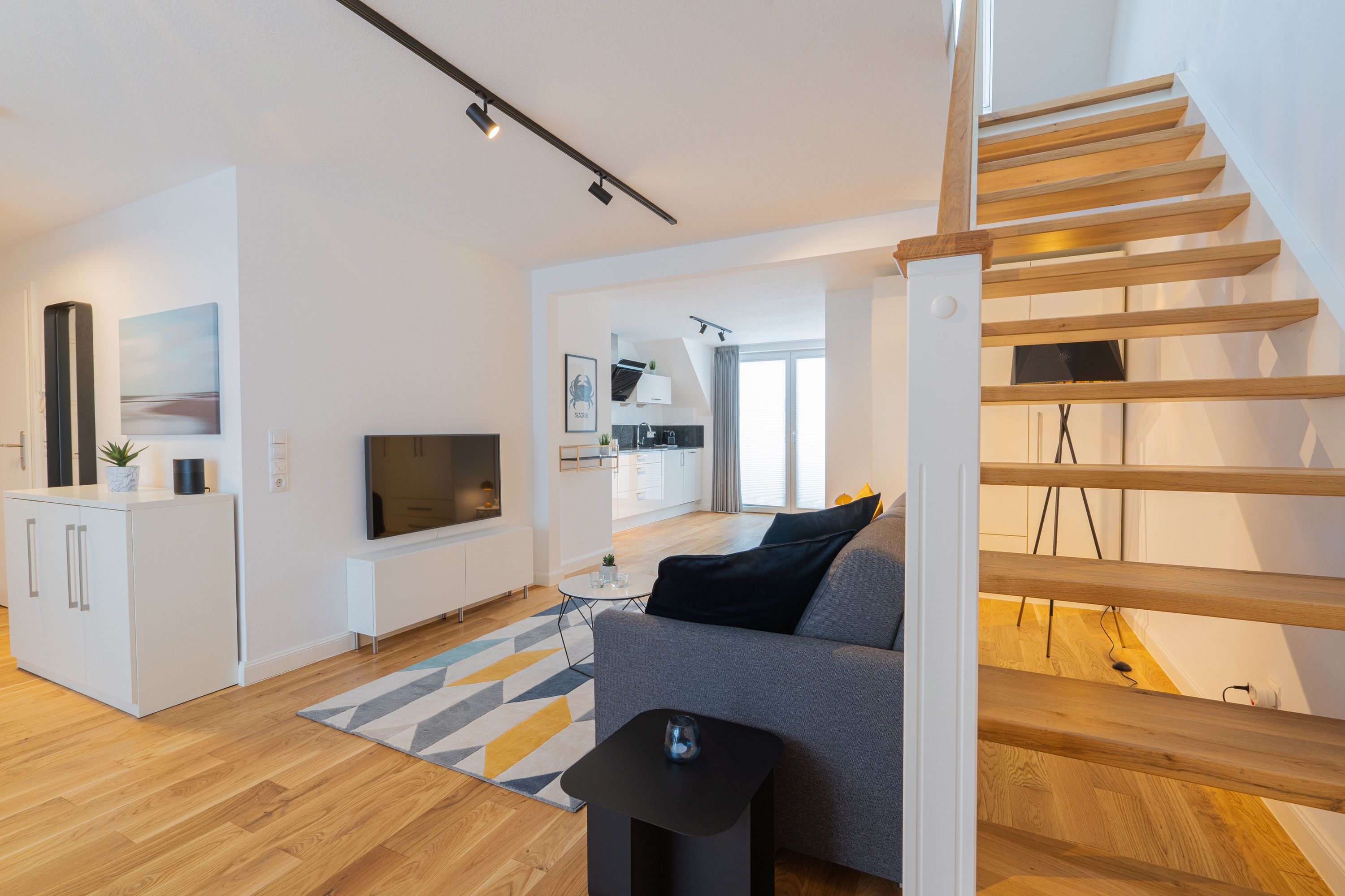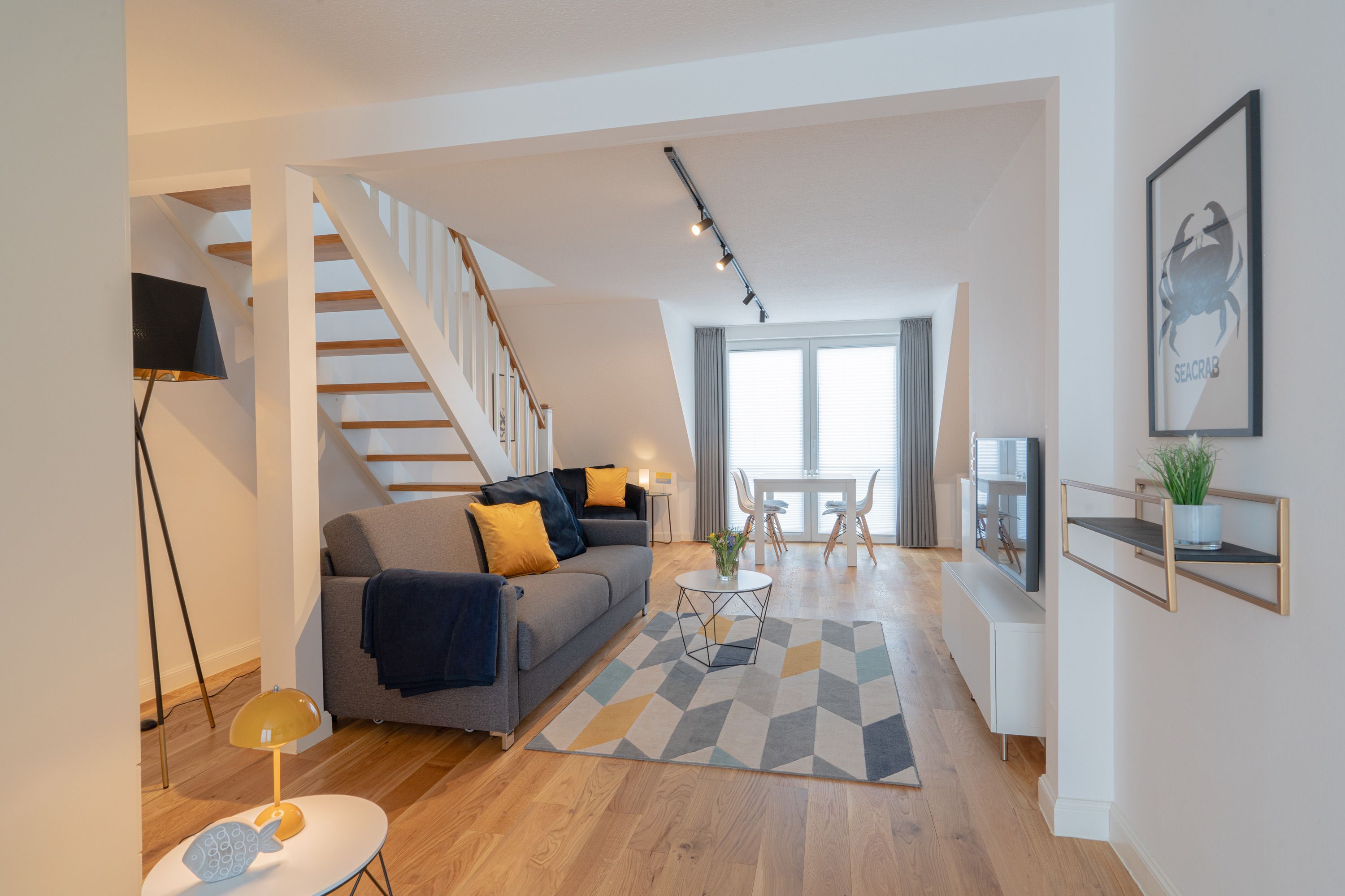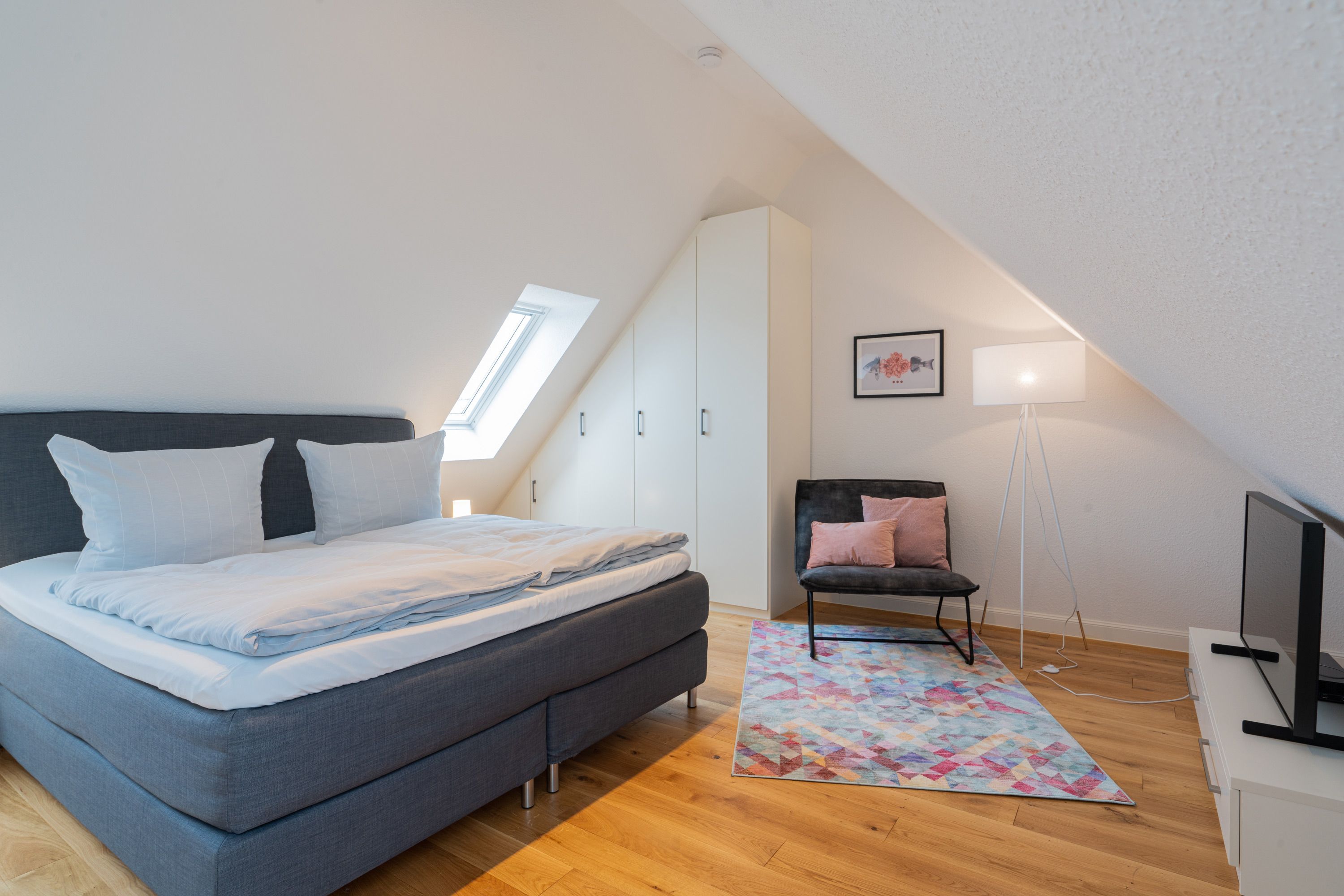 Unser Lighthouse 5 ist ein helles, freundliches Appartement mit Echtholzparkett, separatem Schlafzimmer im Dachgeschoss,