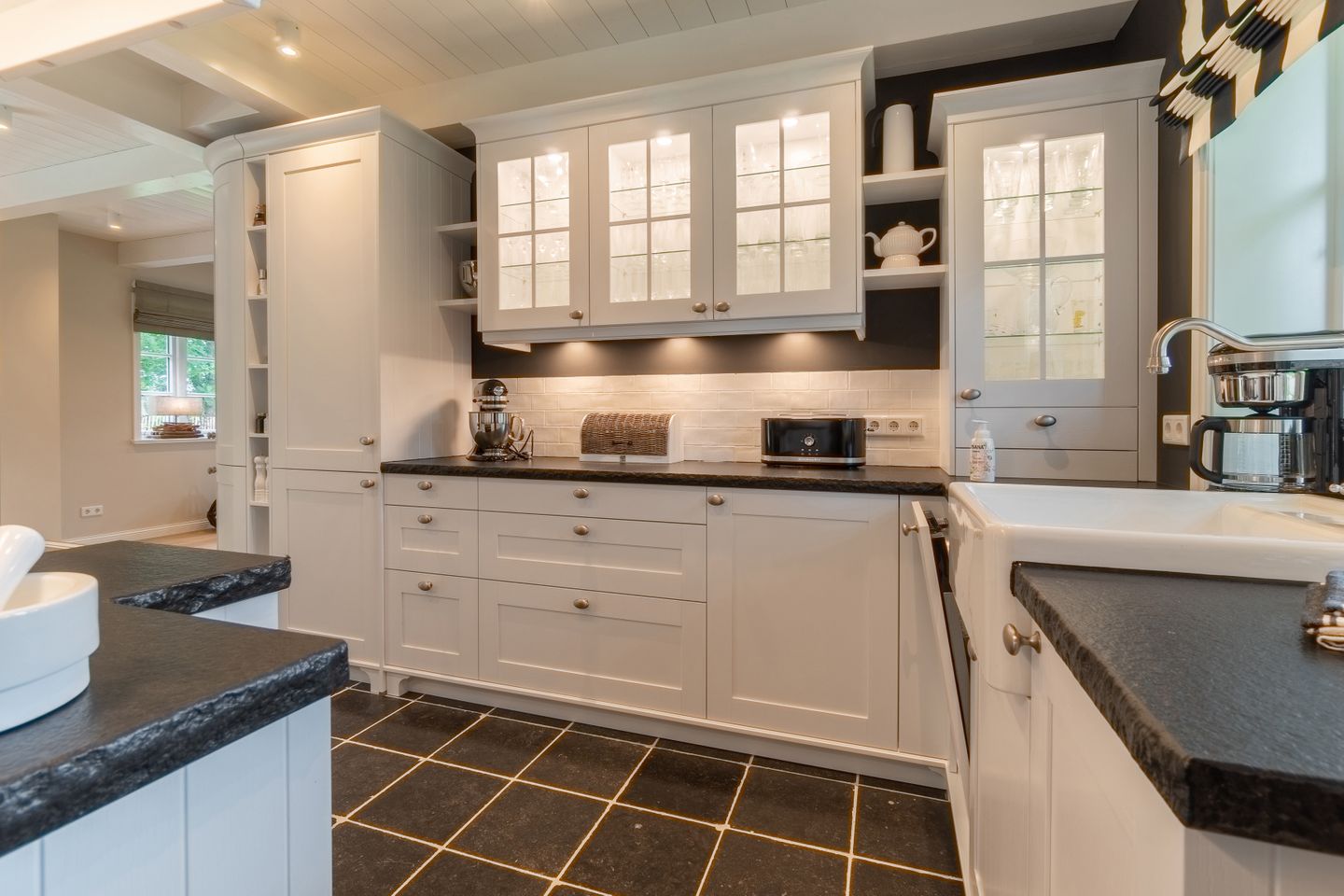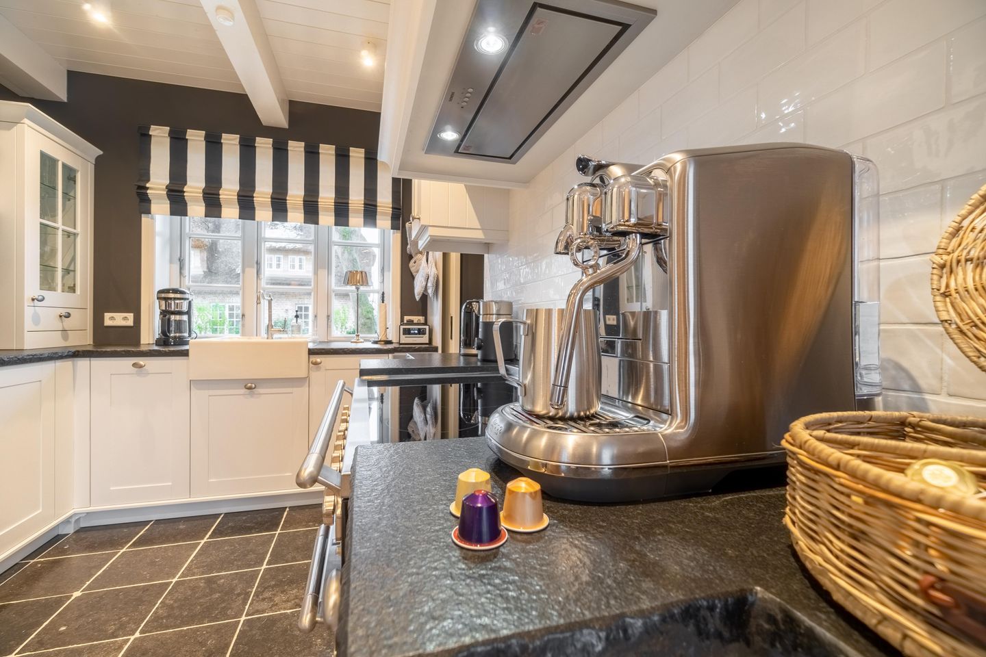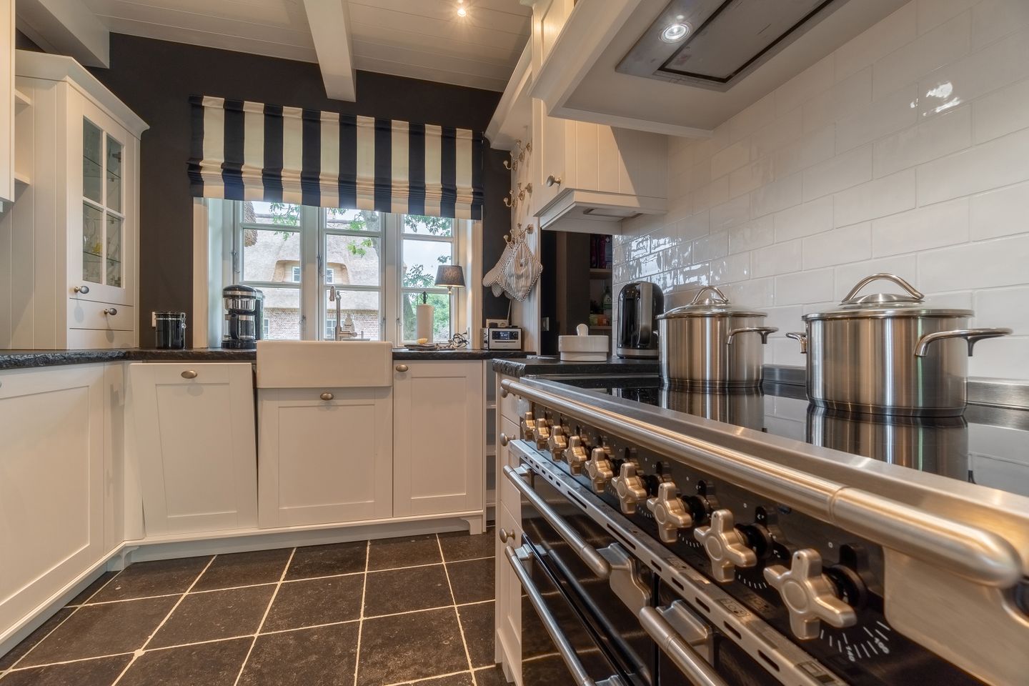 Im Erdgeschoss befinden sich der großzügige Wohn- und Essbereich mit offener Küche, eines der drei Schlafzimmer, ein Bad mit bodengleicher Dusche und ein Hauswirtschaftsraum. Der offene Wohn-, Ess- und Küchenbereich bildet das Herzstück des Hauses. Der Original Mylin-Kachelofen sorgt auch an kühleren Tagen für eine wohlige Atmosphäre - und an warmen Tagen ist er ein echter Hingucker! Die Küchenausstattung ist besonders vielfältig und gut. Neben der Kitchenaid mit reichlich Zubehör, einer Nespresso-Kaffeemaschine und Milchaufschäumer zählen wir den englischen Falcon Herd mit verschiedenen Ofen- und Backfunktionen sowie mit Induktionskochfeldern zu den Highlights des Ferienhauses Eva-Marie. Über den Essbereich gelangen Sie auf die Terrasse und in den Garten.