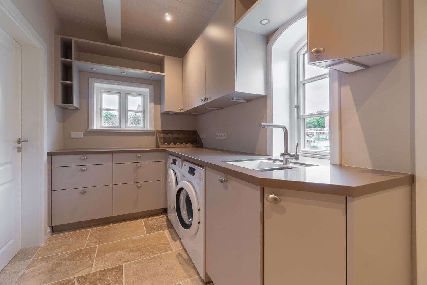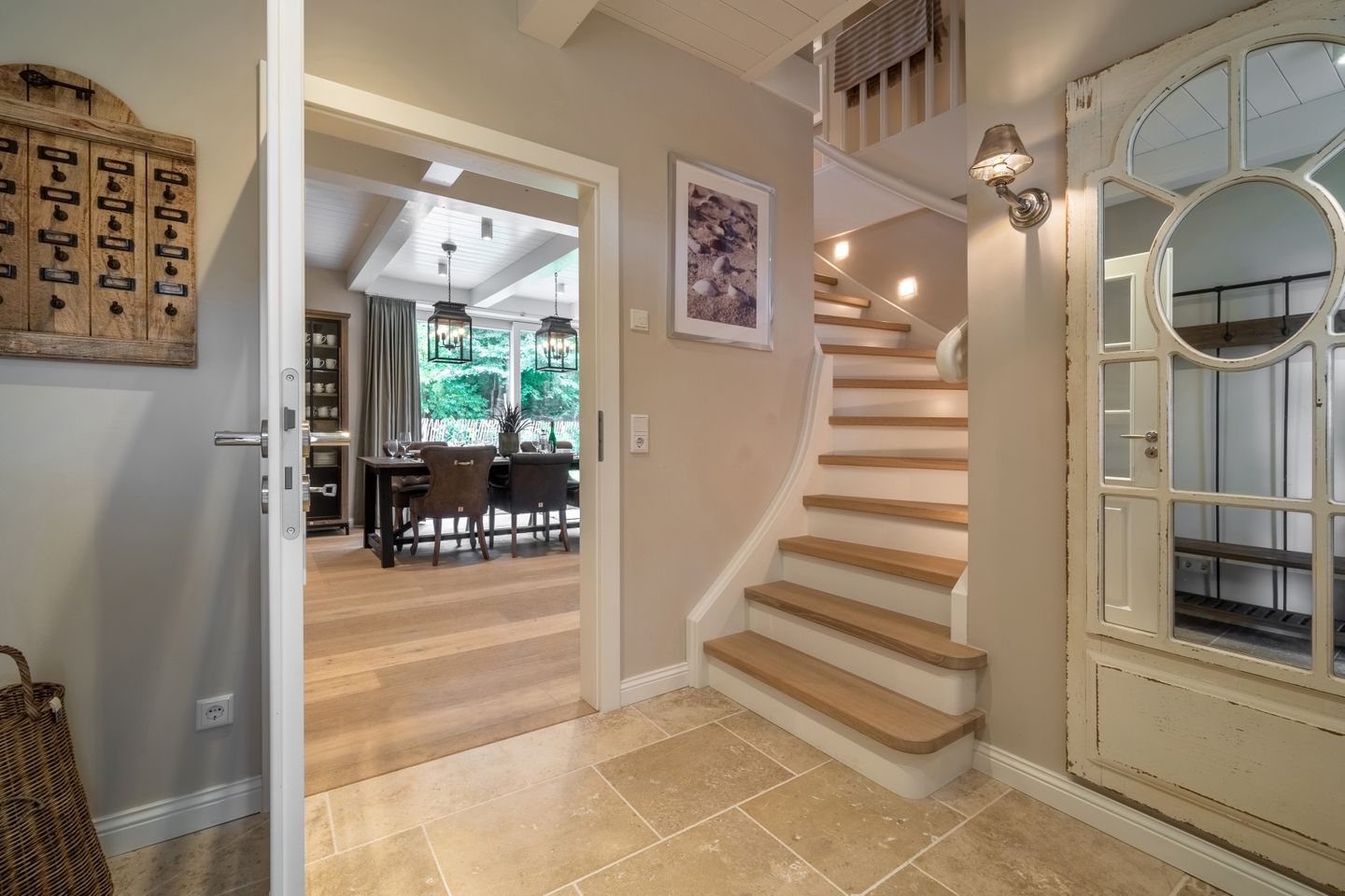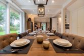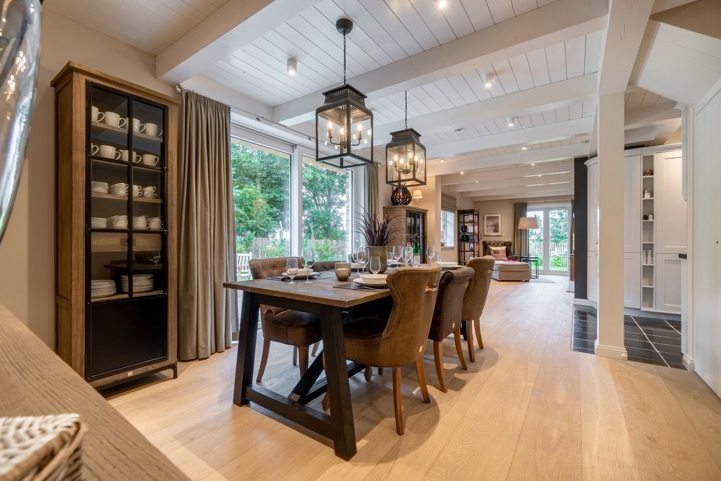 Im Erdgeschoss befinden sich der großzügige Wohn- und Essbereich mit offener Küche, eines der drei Schlafzimmer, ein Bad mit bodengleicher Dusche und ein Hauswirtschaftsraum. Der offene Wohn-, Ess- und Küchenbereich bildet das Herzstück des Hauses. Der Original Mylin-Kachelofen sorgt auch an kühleren Tagen für eine wohlige Atmosphäre - und an warmen Tagen ist er ein echter Hingucker! Die Küchenausstattung ist besonders vielfältig und gut. Neben der Kitchenaid mit reichlich Zubehör, einer Nespresso-Kaffeemaschine und Milchaufschäumer zählen wir den englischen Falcon Herd mit verschiedenen Ofen- und Backfunktionen sowie mit Induktionskochfeldern zu den Highlights des Ferienhauses Eva-Marie. Über den Essbereich gelangen Sie auf die Terrasse und in den Garten.