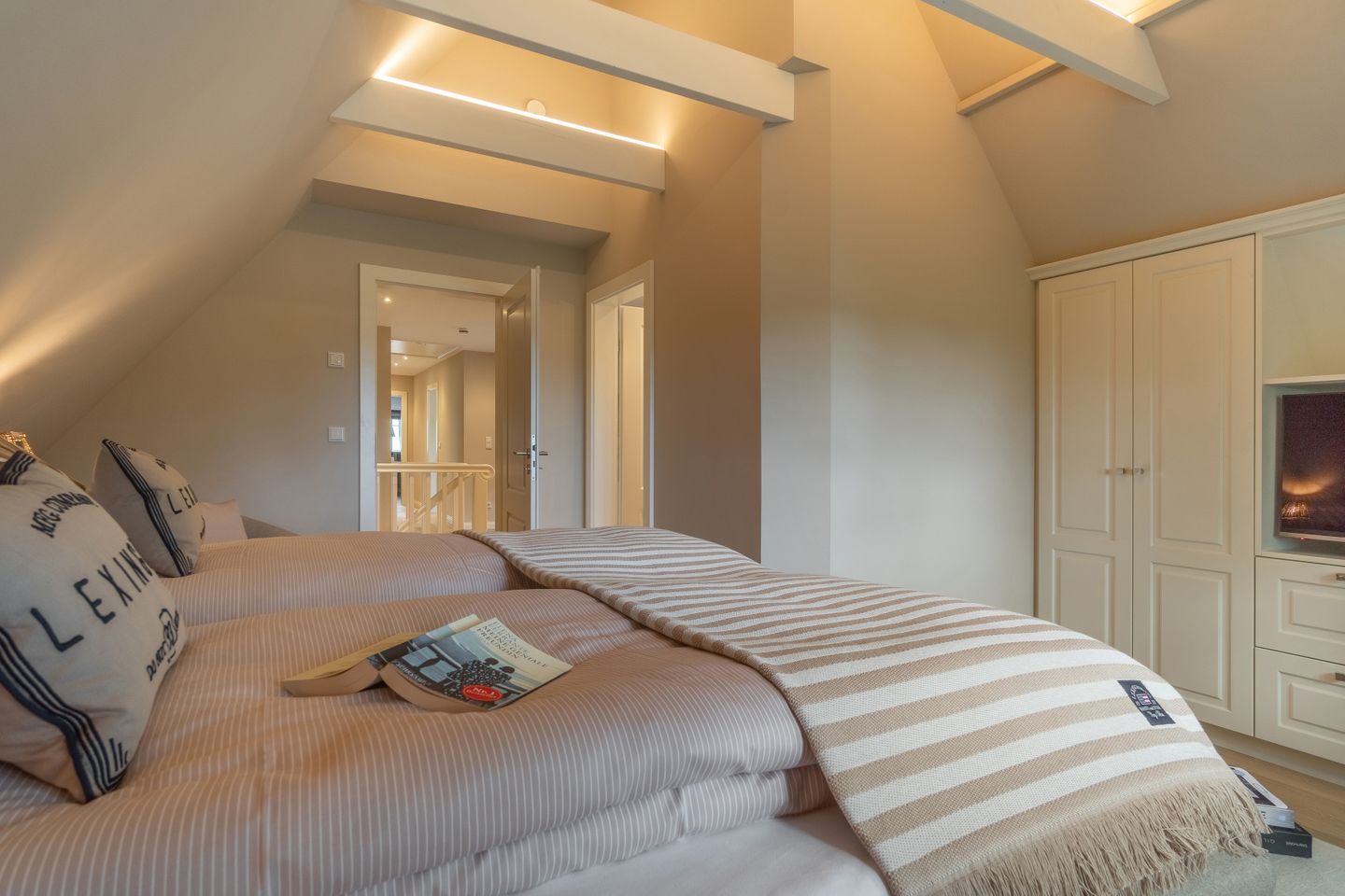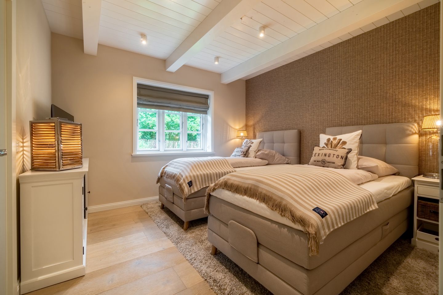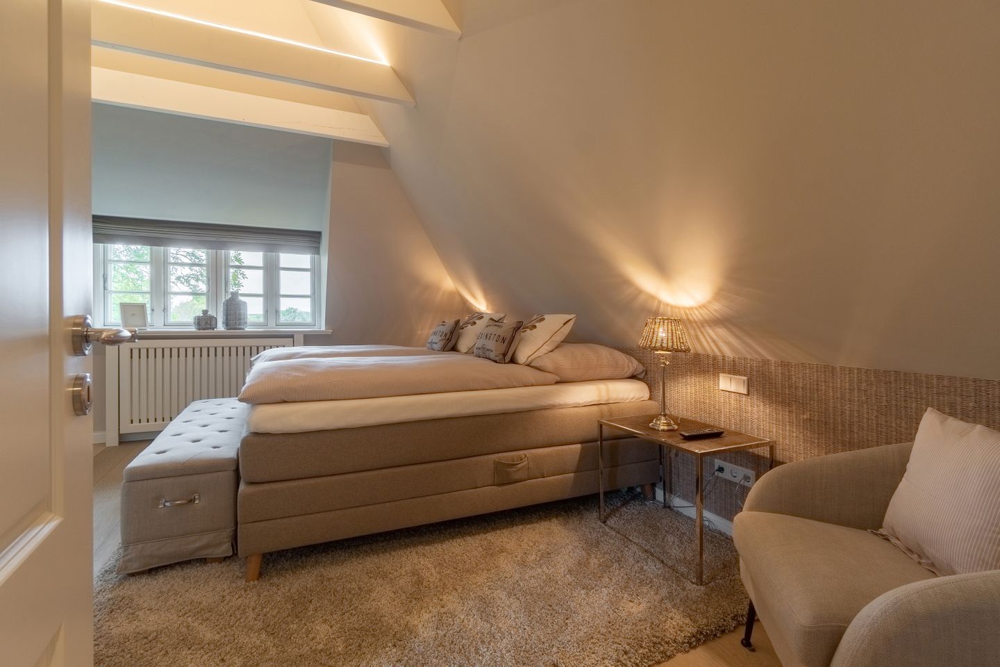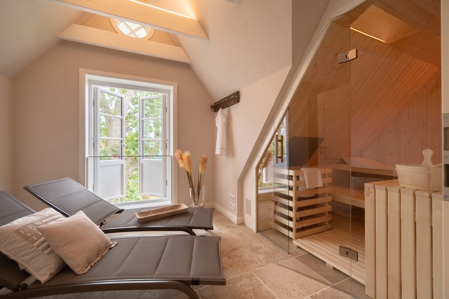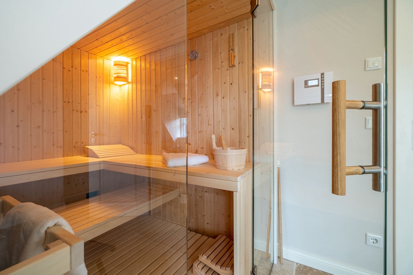 Im Obergeschoss befinden sich die beiden weiteren Schlafzimmer, zwei Bäder mit bodengleicher Dusche und der Ruheraum samt hauseigener Sauna. Sämtliche Betten verfügen über einen elektrisch verstellbaren Motorrahmen.