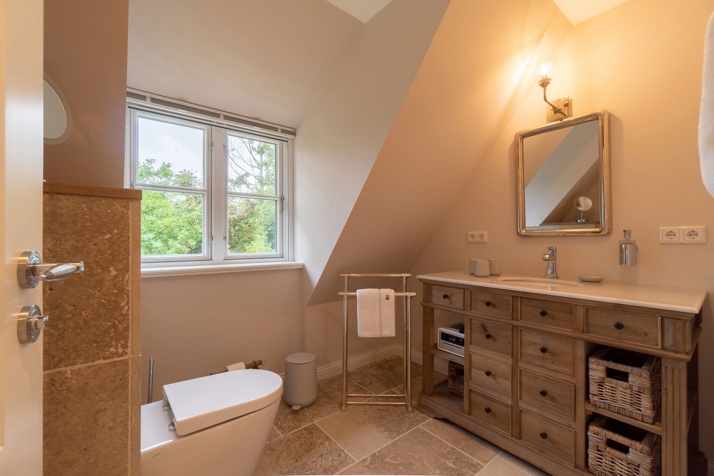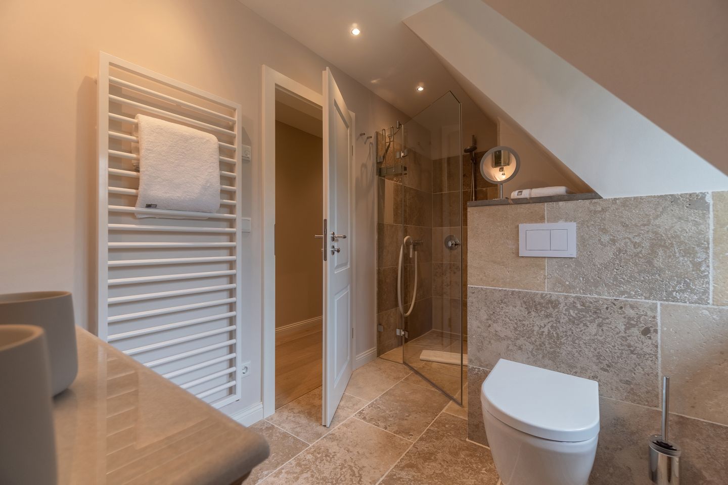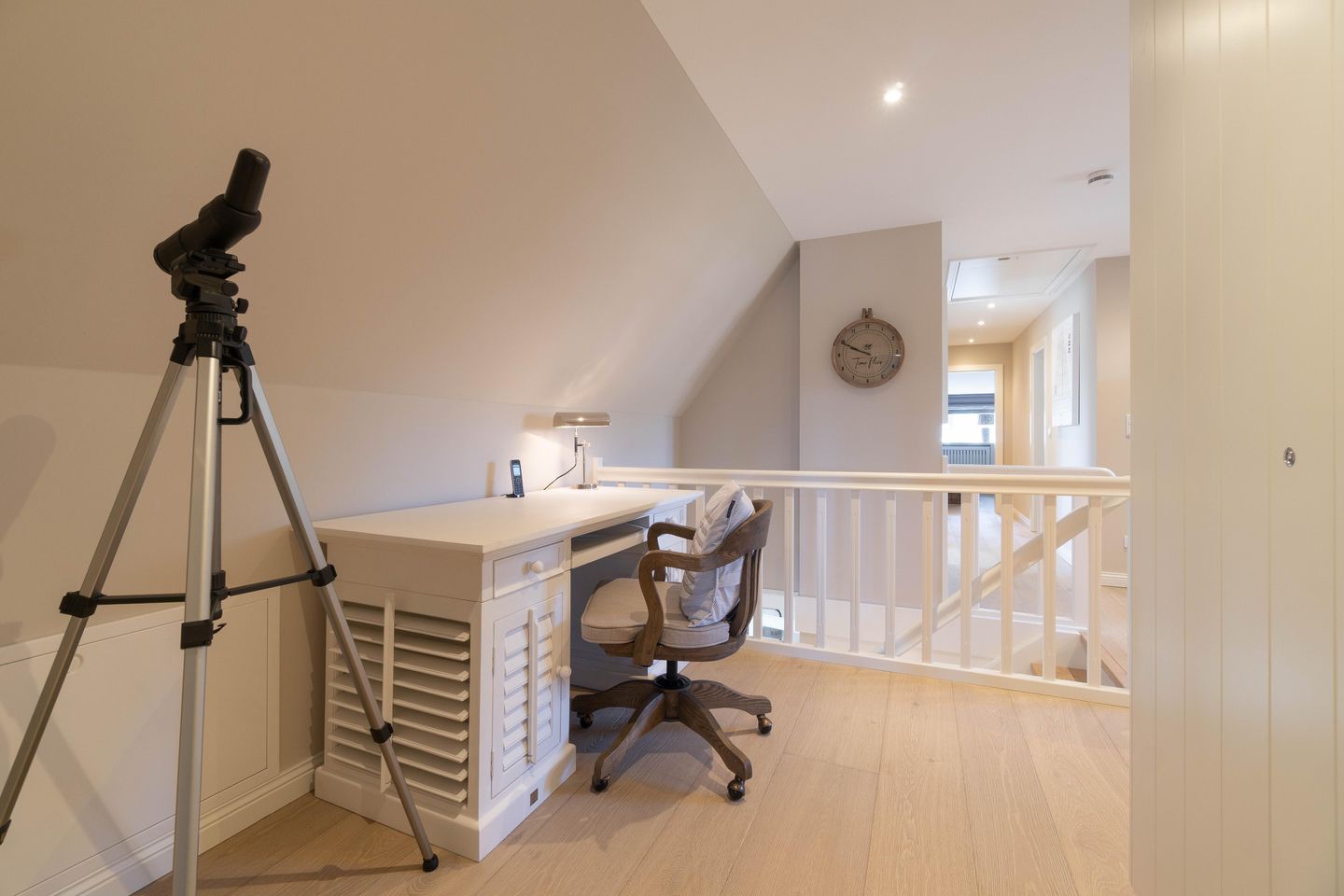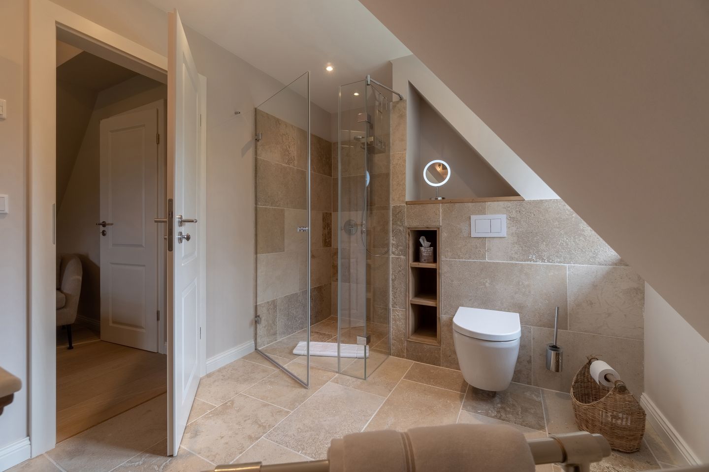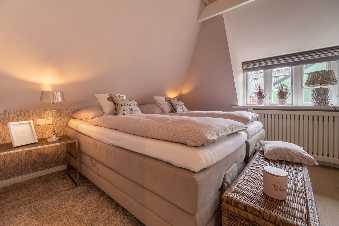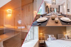 Im Obergeschoss befinden sich die beiden weiteren Schlafzimmer, zwei Bäder mit bodengleicher Dusche und der Ruheraum samt hauseigener Sauna. Sämtliche Betten verfügen über einen elektrisch verstellbaren Motorrahmen.