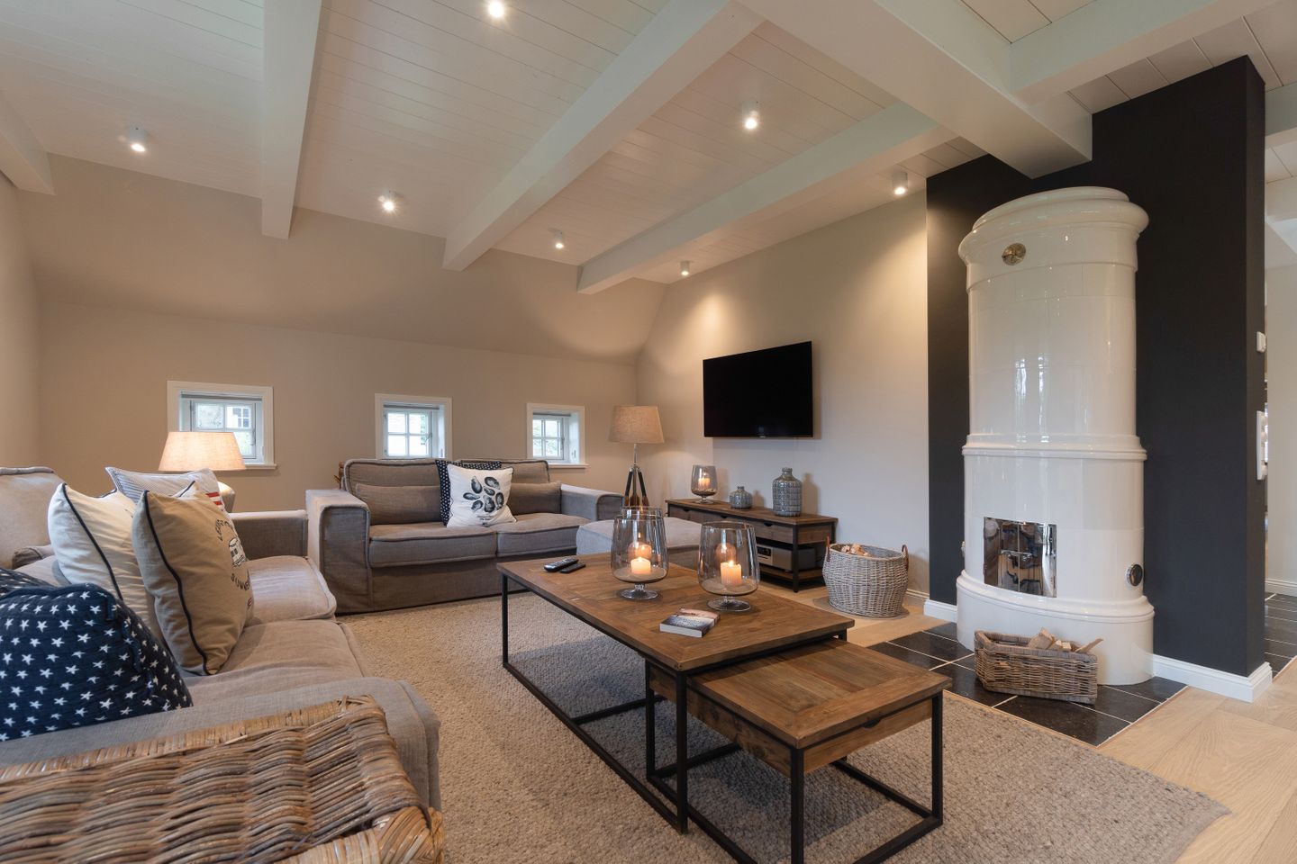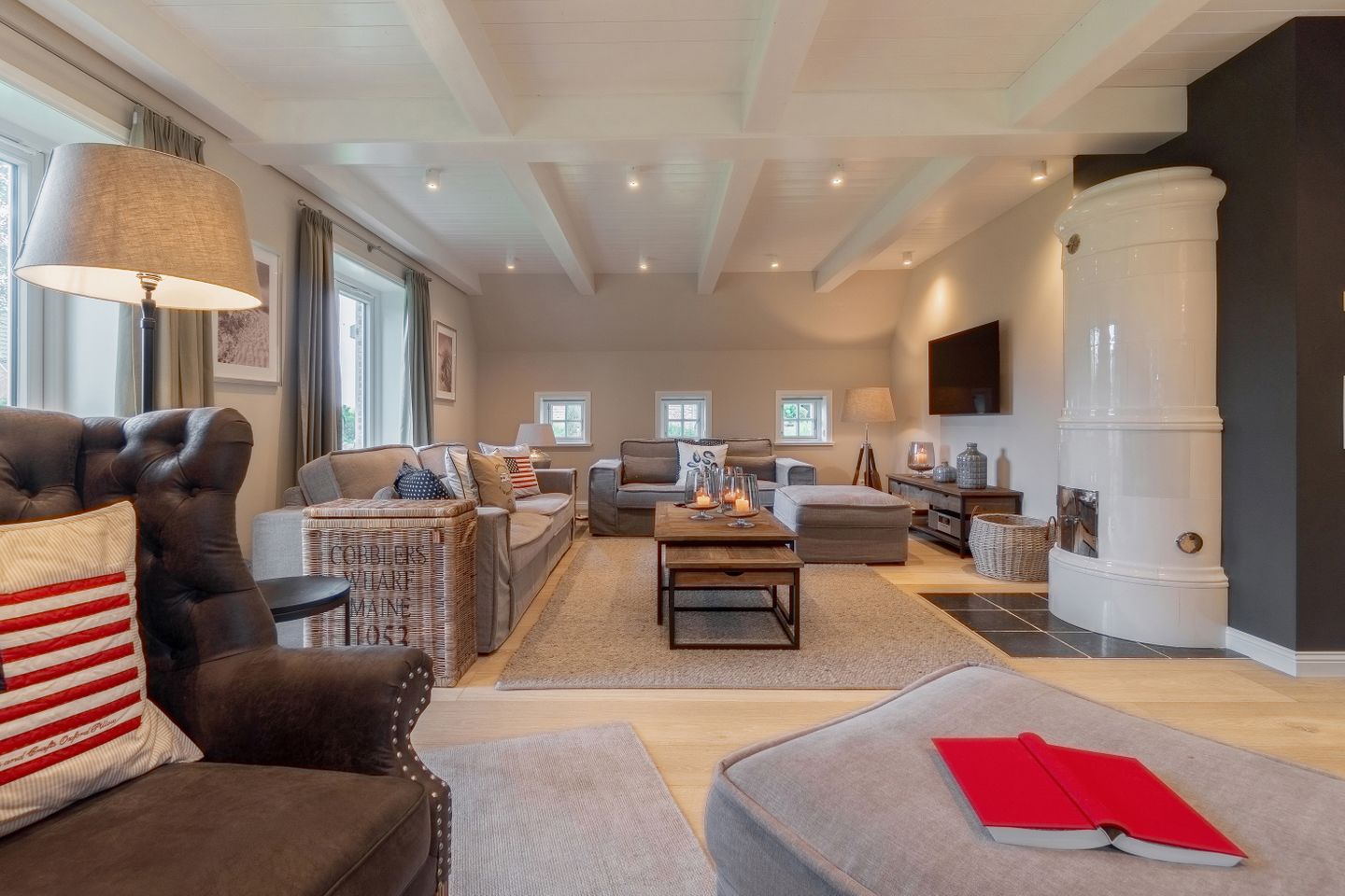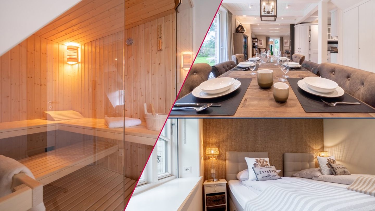 Zu den Highlights des exklusiv ausgestatteten Ferienhauses unter Reet zählen wir u. a. die hauseigene Sauna mit Ruheraum, den Original Mylin-Kachelofen sowie die exzellent ausgestattete Küche.