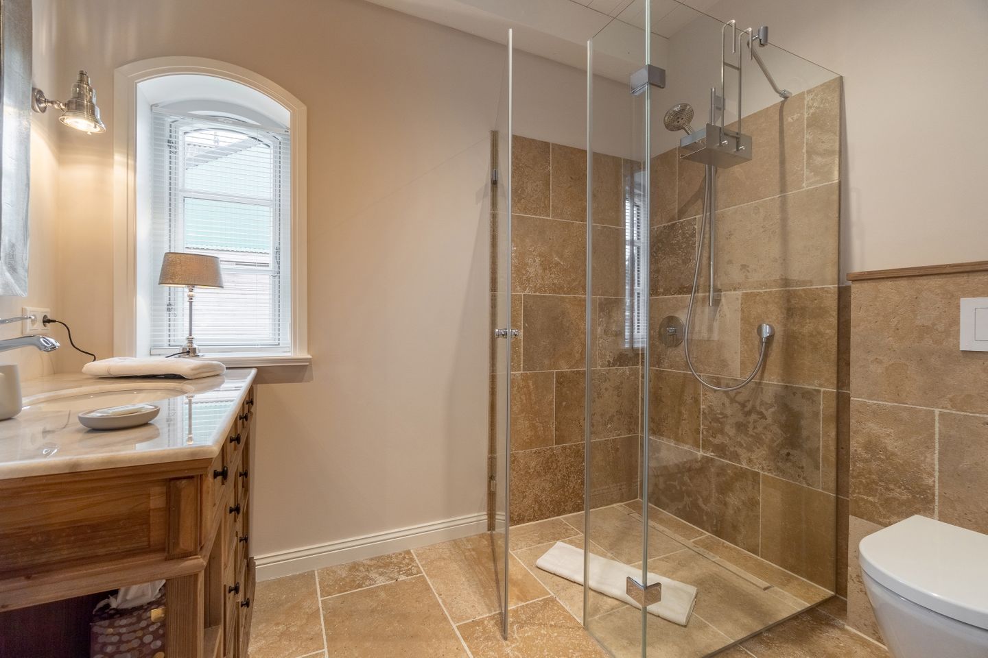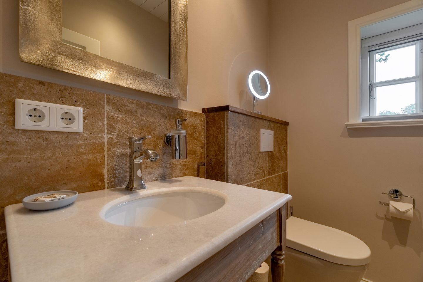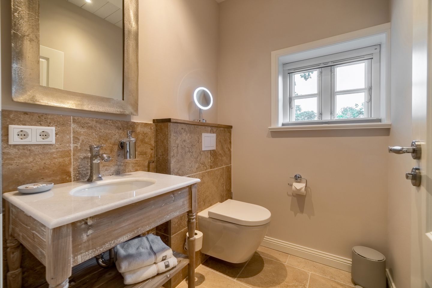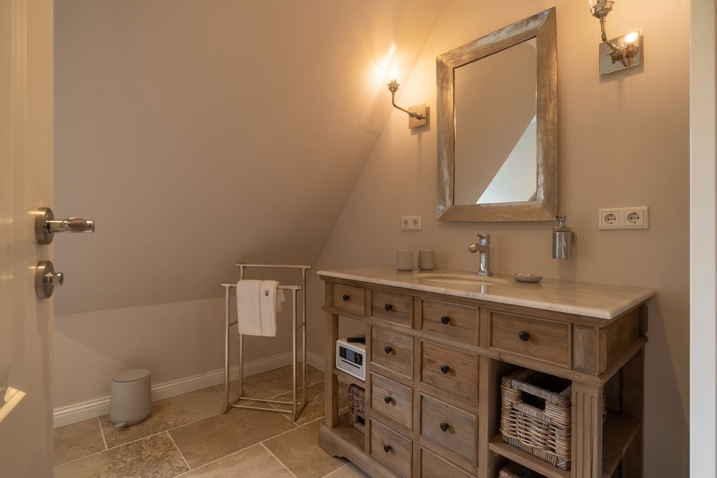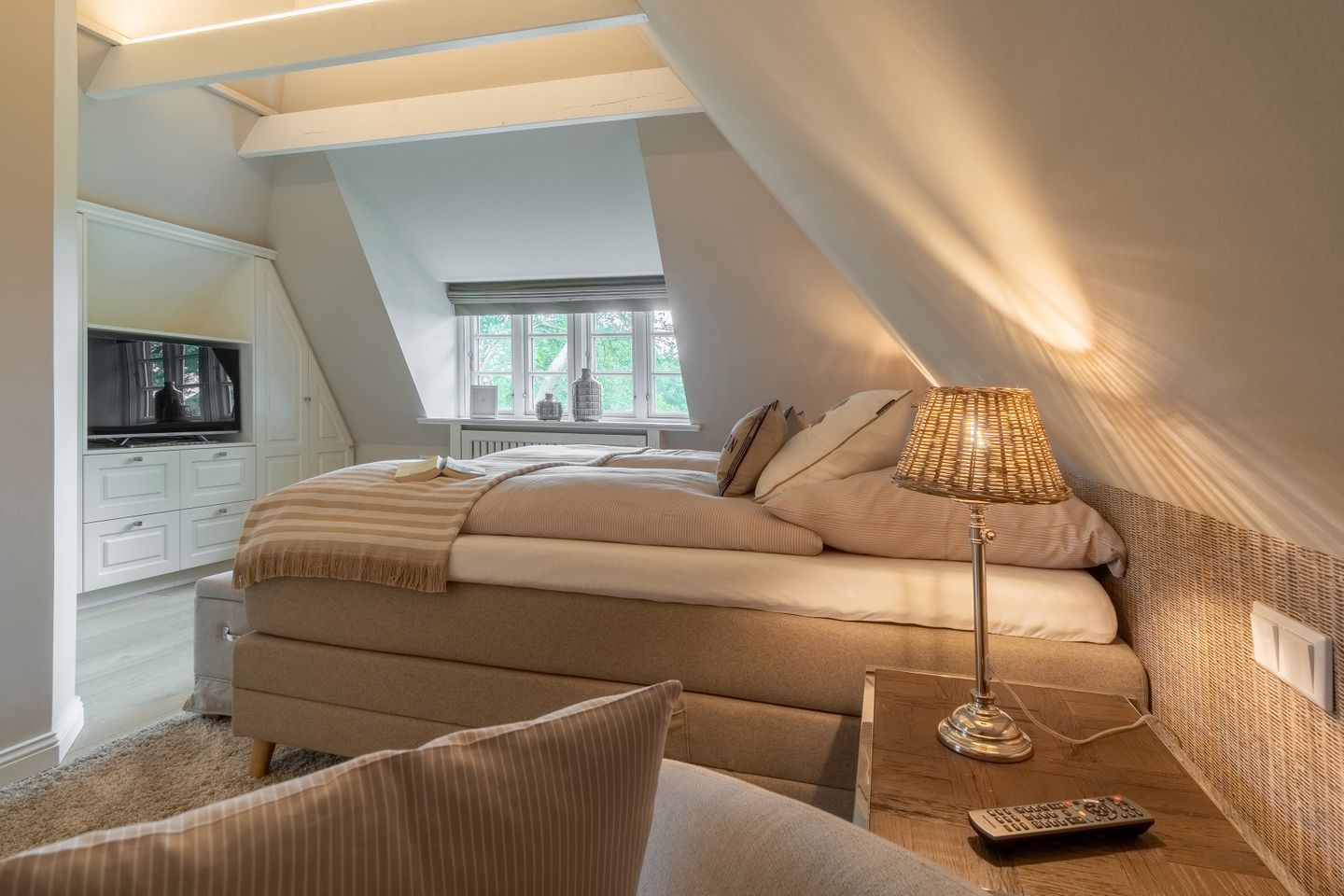 In allen Schlafräumen sowie im Wohnbereich befinden sich Smart-TVs mit Aufnahmefunktion zum zeitversetzten Fernsehen. In allen Bädern sowie im Wohnbereich stehen Sonoro Musikanlagen mit CD-Player, UKW-, DAB- und Internetradio bereit. Bei allen Betten im Haus handelt es sich um sehr wertige Boxspringbetten, welche über elektrische Motorrahmen verfügen. Die Bettwäsche und Handtücher stammen allesamt von Lexington.