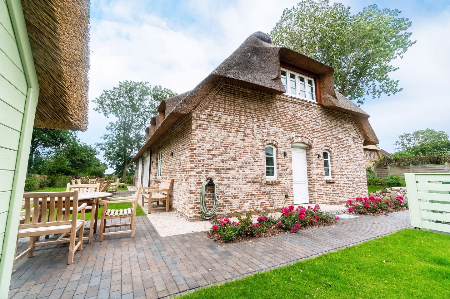 Der Außenbereich rundet das Angebot des Ferienhauses ab. Ein kleines Gartenhäuschen unter Reet steht Ihnen zur Verfügung, um E-Bikes sicher abzustellen und sie auch direkt aufladen zu können. Neben zwei Terrassenplätzen gehören auch vier Teakholz-Liegen zur Ausstattung der Außenanlage sowie zwei Sonnenschirme. Am PKW-Stellplatz finden Sie eine Ladesäule für E-Autos, die Sie während Ihres Aufenthaltes kostenlos benutzen dürfen.