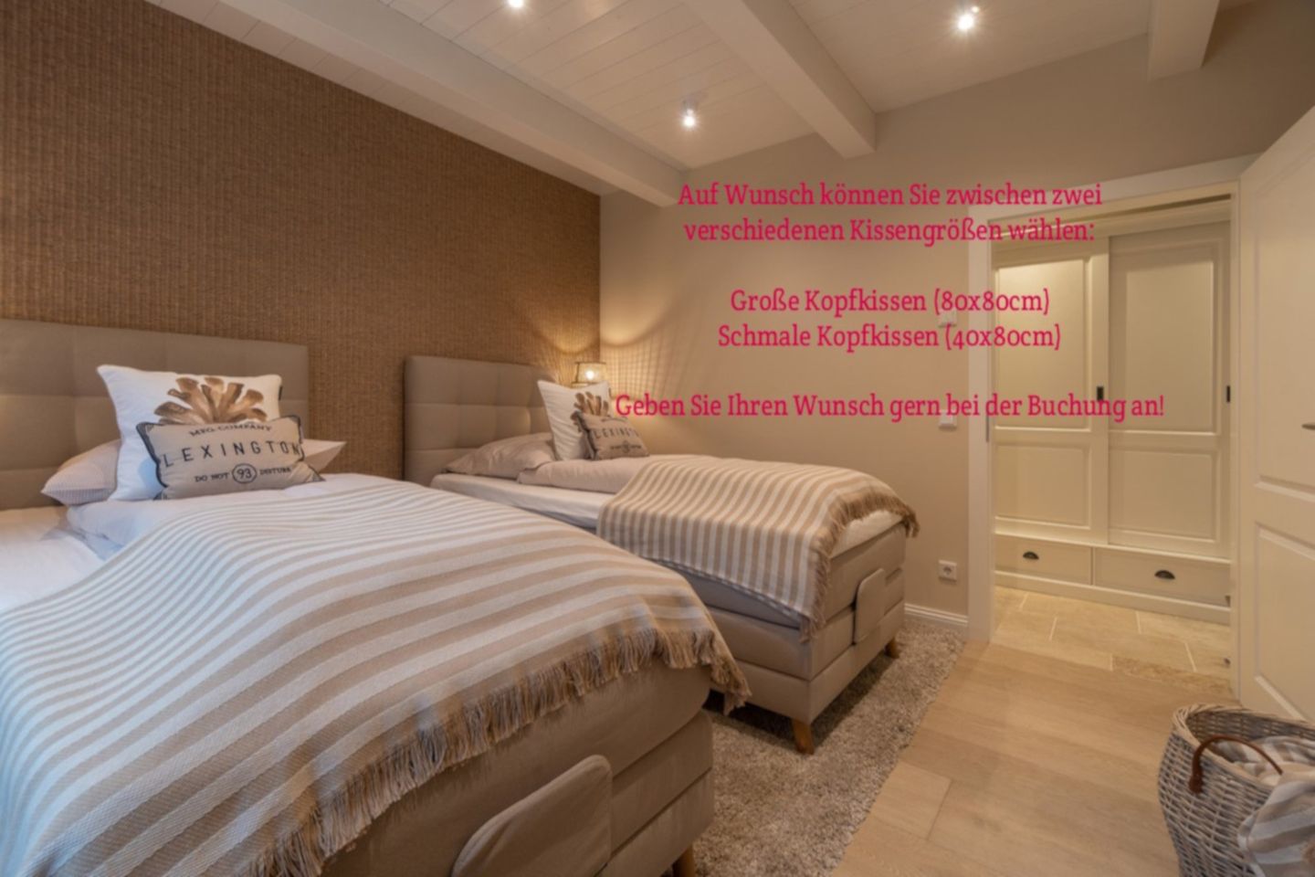Als Besonderheit ist hervorzuheben, dass Sie die Art des Kopfkissens auswählen können: Sie haben die Wahl zwischen einen 80x80cm Kopfkissen, oder eine schmaleren Variante mit 40x80cm Größe.