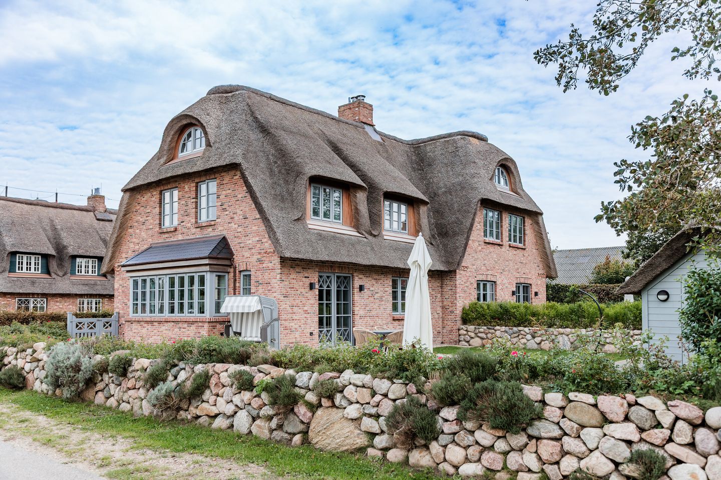 Strandnahes 5 Sterne Reetdachhaus mit seitlichem Meerblick, Garten, Sauna, Kamin.