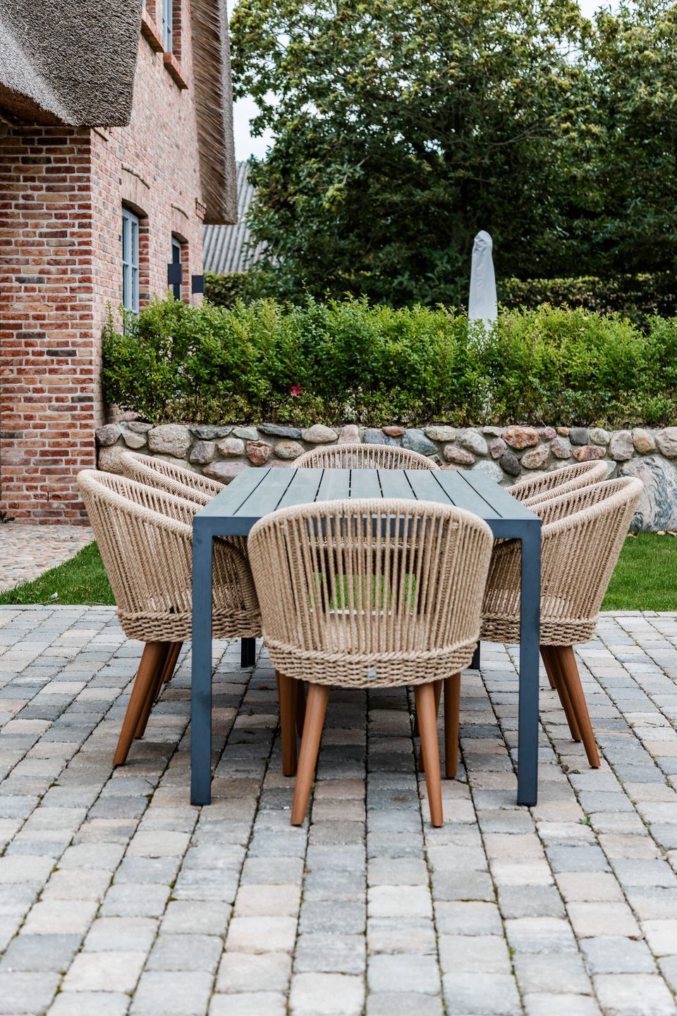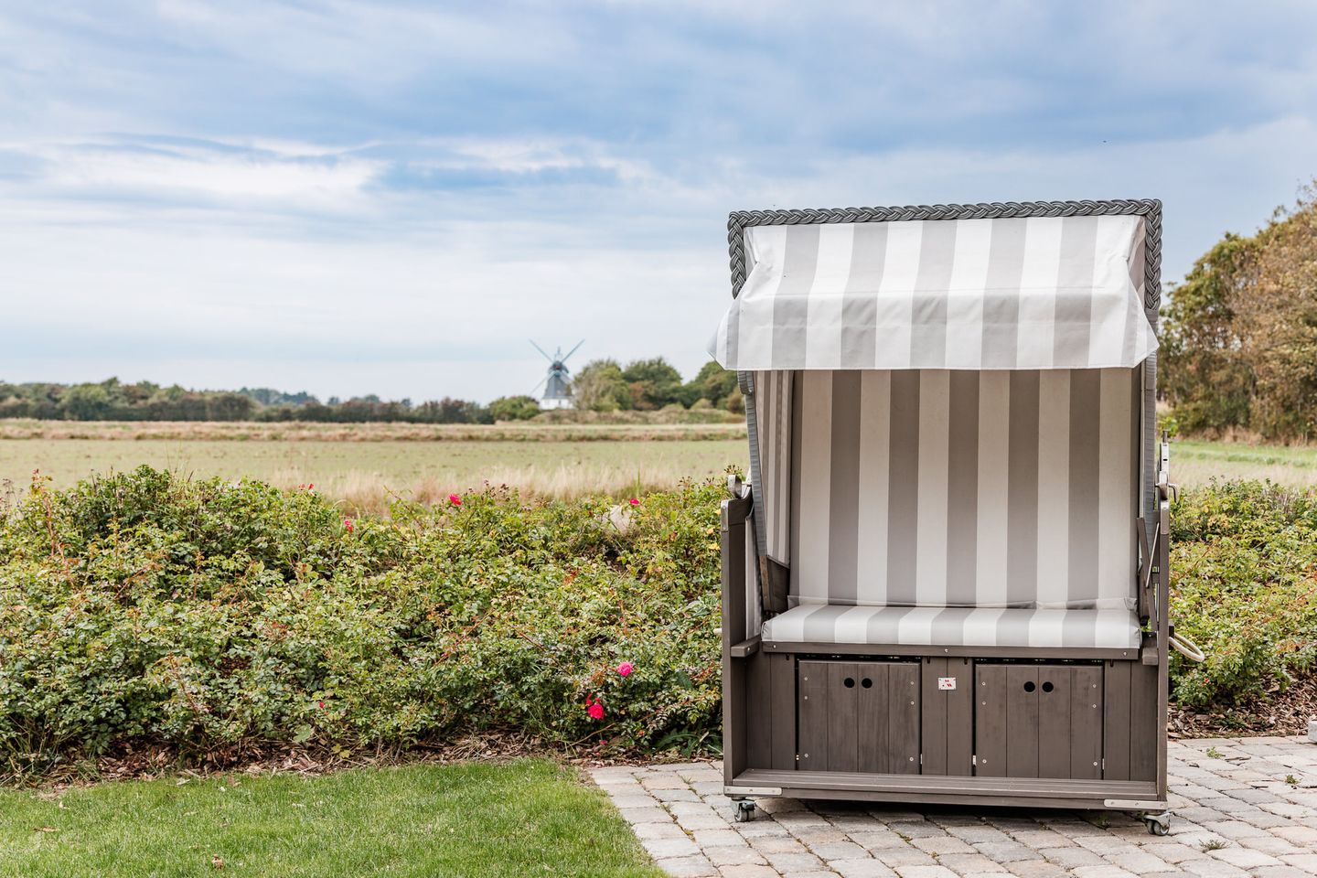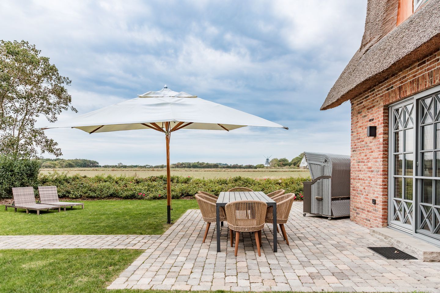 Auf den beiden Außenterrassen mit hauseigenem Strandkorb können Sie die Aussicht bei Sonne und Wind Richtung Borgsumer Mühle oder über die Felder bis zur Insel Amrum (in Abhängigkeit der Jahreszeiten) genießen.