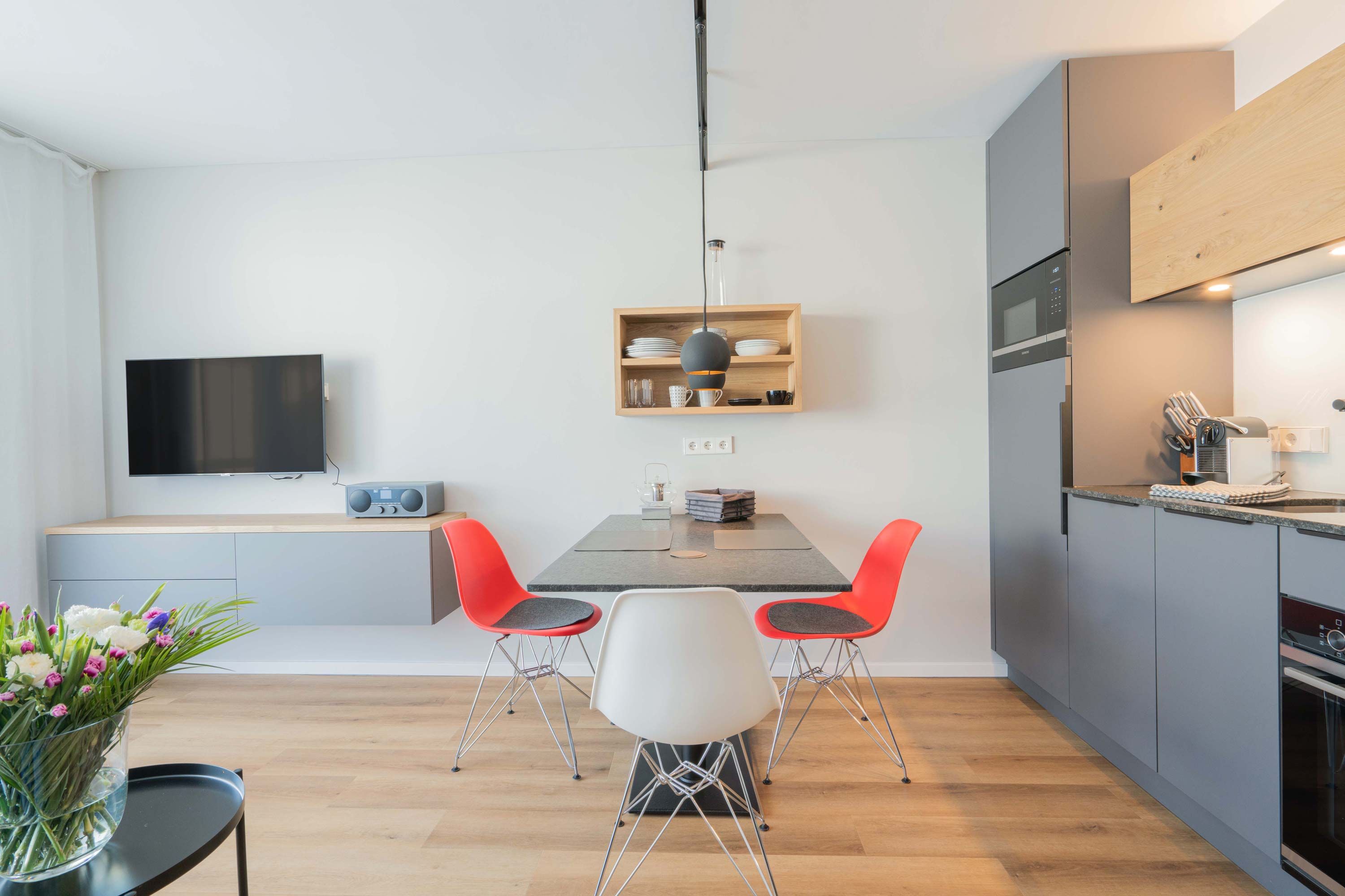 Der Wohn- und Essbereich bietet eine gemütliche Sofaecke (Ausziehcouch 160x200) mit Fernseher. Am geräumigen Esstisch lassen sich entspannte, gemeinsame Mahlzeiten geniessen. Die moderne, offene Küche ist umfangreich mit Spülmaschine, Backofen, Mikrowelle und Annehmlichkeiten wie u.a. einer Nespresso-Maschine ausgestattet. Vom Wohnraum gelangen Sie auf den West-Balkon auf dem Sie gemütlich den Tag ausklingen lassen können. Das moderne Duschbad bietet Ihnen Entspannung unter der Regendusche.