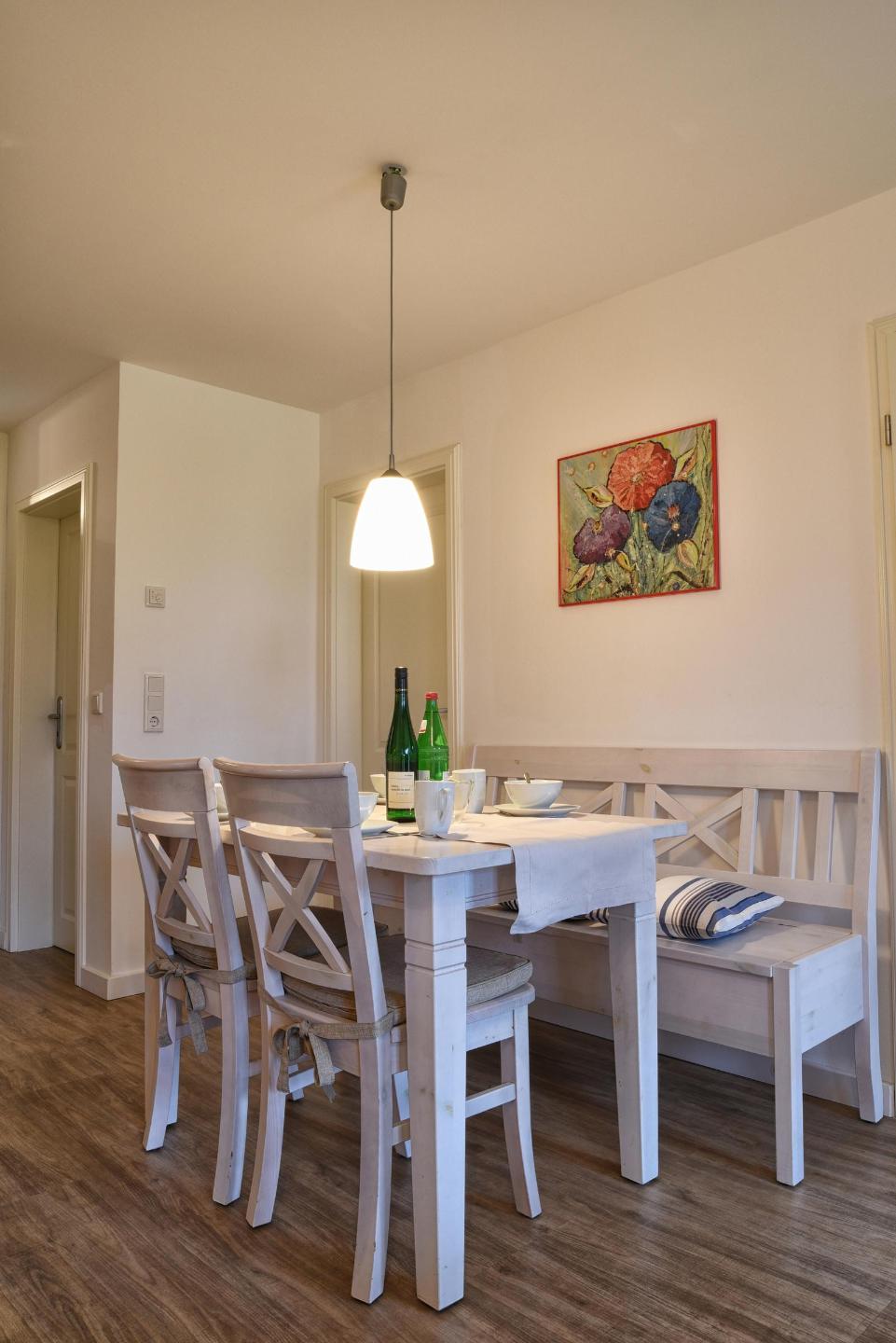 Die Stadtwohnung 6 liegt links im Erdgeschoss. Sie verfügt über ein kombiniertes Wohn-/Esszimmer mit einer Küchenzeile mit Einbauküche, 2 separate Schlafräume, ein Duschbad und eine Süd-Terrasse nebst Garten. Zudem stehen 8 videoüberwachte PKW- Stellplätze für 9 Stadtwohnungen direkt am Haus zur Verfügung. Waschmaschine und Trockner stehen Ihnen im Hauswirtschaftsraum des Hauses 10a zur Verfügung. In den gemeinsamen Bereichen des Hauses finden Sie außerdem diverse Brettspiele, Bücher sowie Prospekte und Kaffeepad- und Kapselmaschinen, die Sie sich für Ihren Aufenthalt gerne mit in Ihre Stadtwohnung nehmen können.
