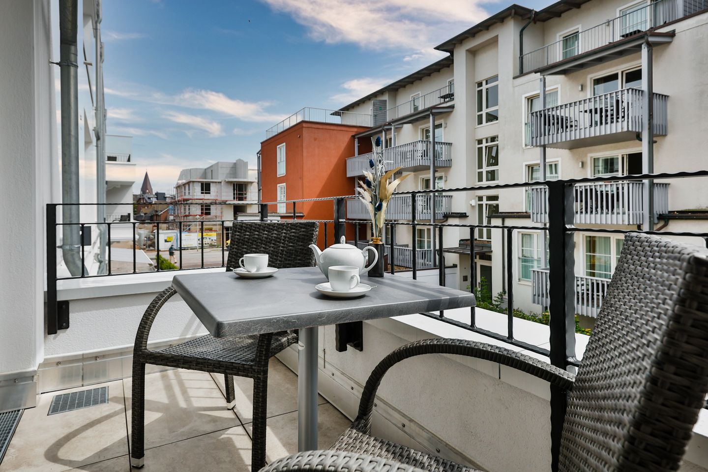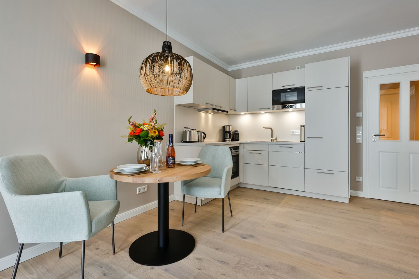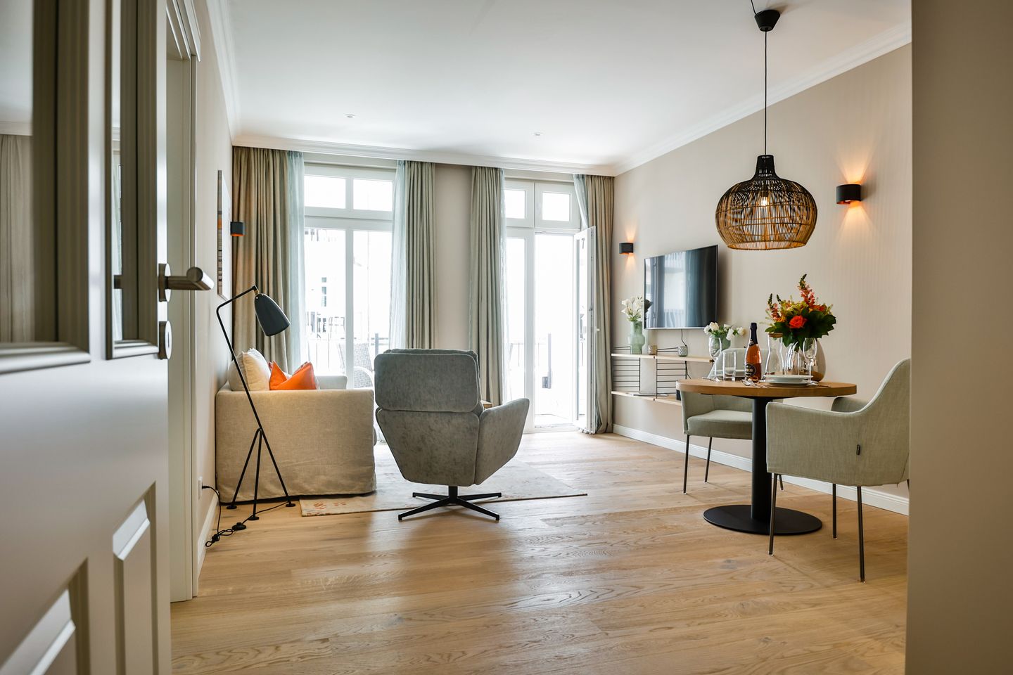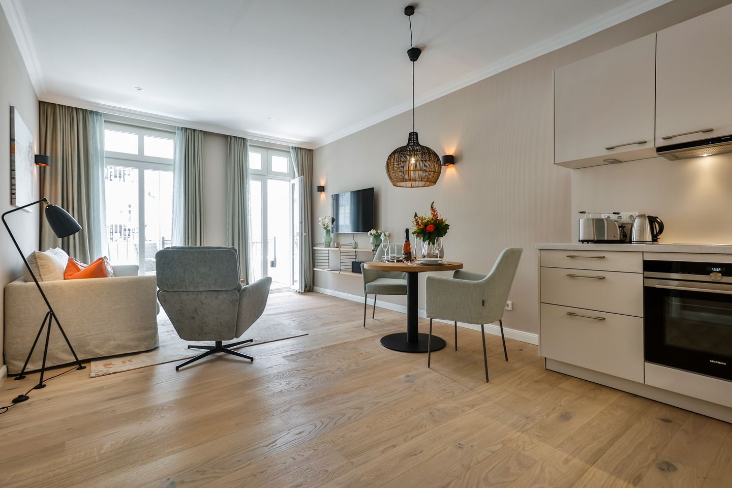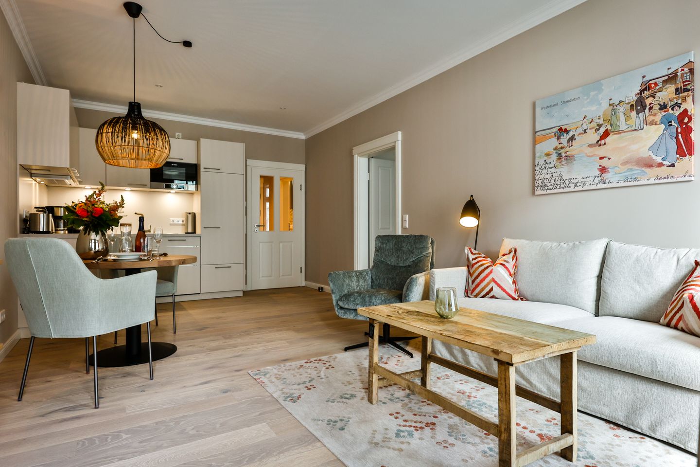 Diese stilvoll ausgestattete 2-Zimmer-Ferienwohnung im ersten Obergeschoss des Logierhauses Jonna bietet auf ca. 56 m² großzügigen Platz für bis zu 2 Personen. Verbringen Sie entspannte Urlaubstage auf Sylt in zentraler Lage von Westerland. Die Einkaufsmeile Friedrichstraße ist nur wenige Schritte entfernt und die Strandpromenade erreichen Sie fußläufig in ein paar Minuten. Genießen Sie die ruhige Atmosphäre und den hohen Komfort dieser exklusiven Ferienwohnung mit Fußbodenheizung, einem Balkon zur Südseite und Zugang zum gemeinschaftlichen Wellnessbereich.