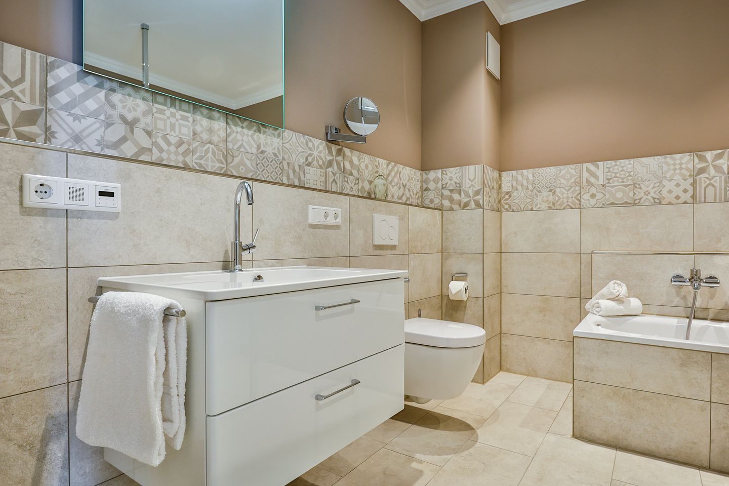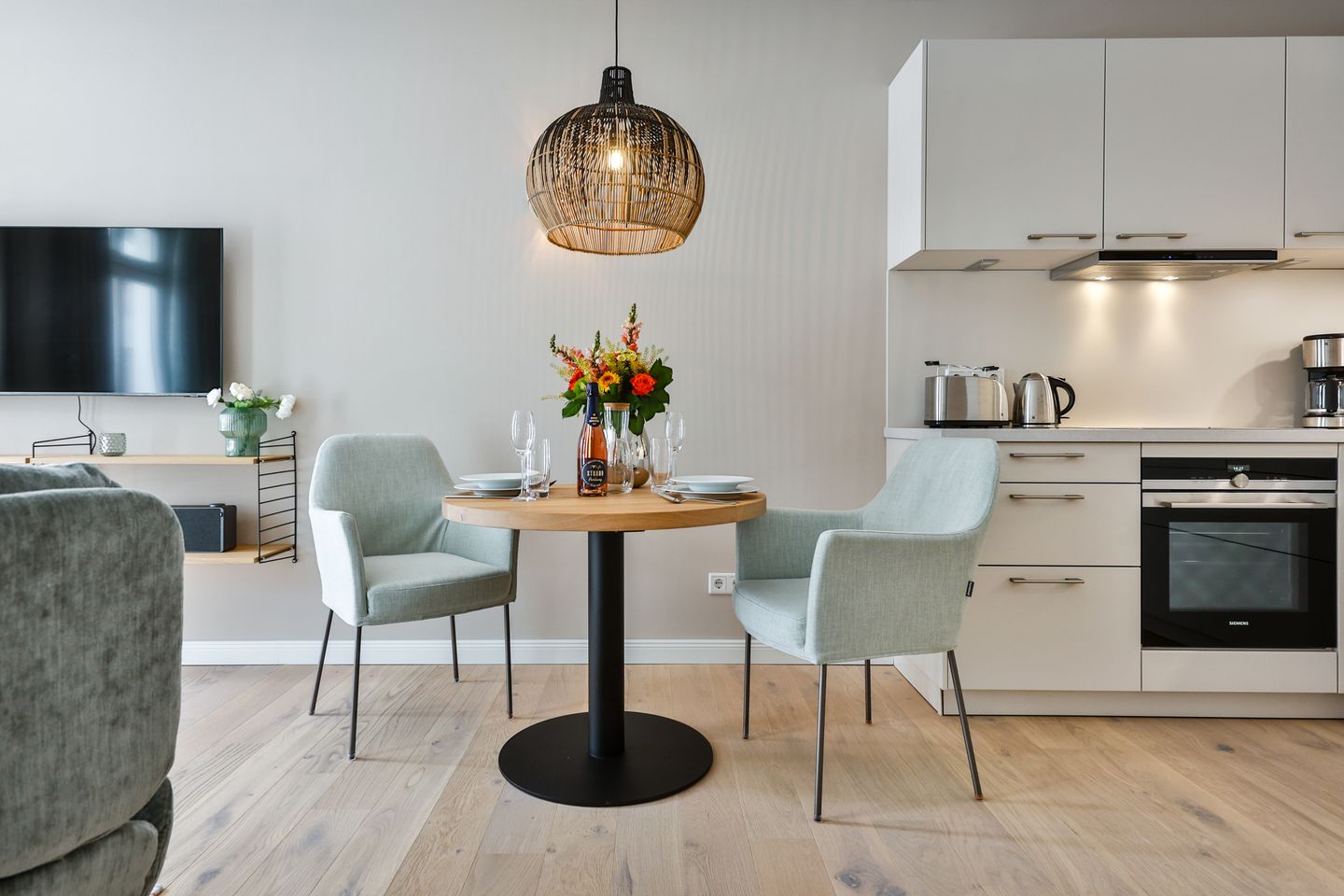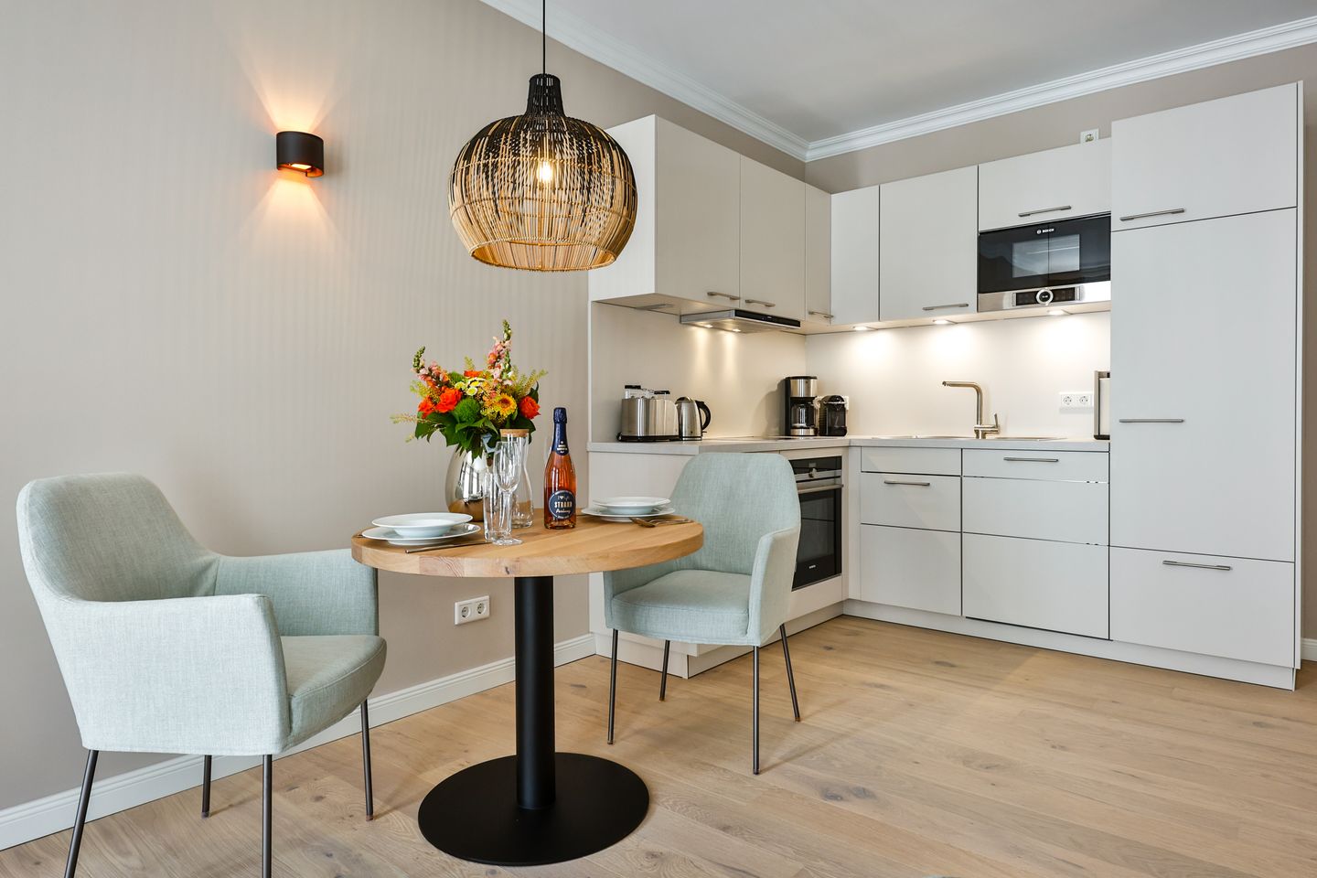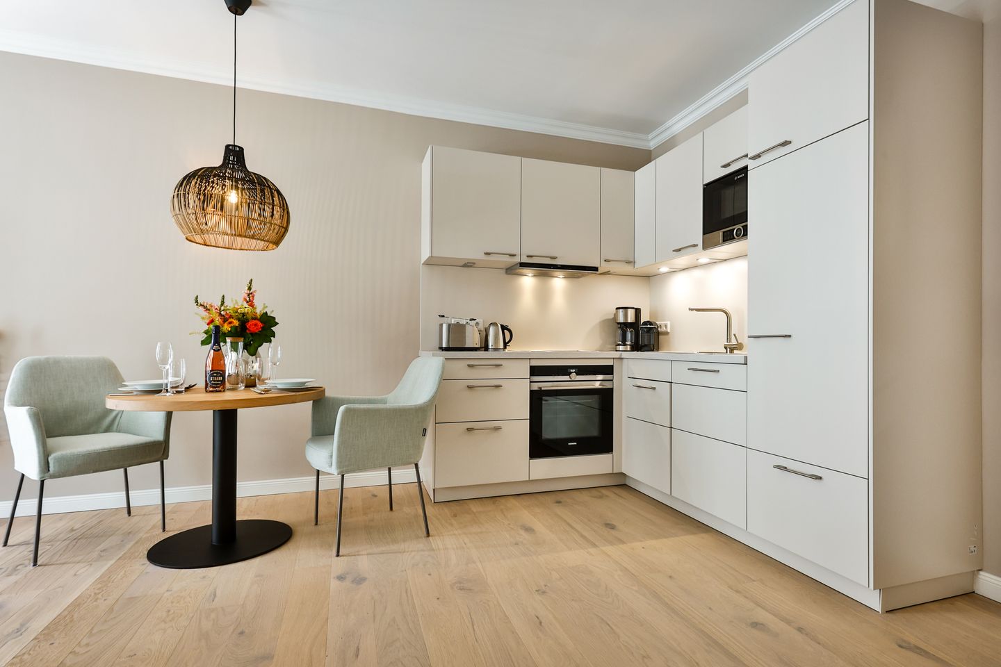 Jede dieser 12 hochwertigen Wohnungen bietet eine voll ausgestattete Küche mit modernem Komfort sowie Fußbodenheizung, TV-Flachbildschirm, Musikanlage, Waschtrockner (Kombi Gerät) und außer der ebenerdigen Dusche auch eine Badewanne. Genießen Sie entspannte Stunden auf dem Balkon oder der Loggia.