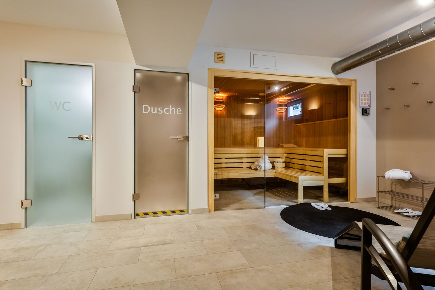 Der ansprechende Wellnessbereich im Untergeschoss steht Ihnen täglich zwischen 16:00 und 20:00 Uhr zur Verfügung und bietet Sauna- und Ruhebereich für Ihre Erholung.