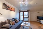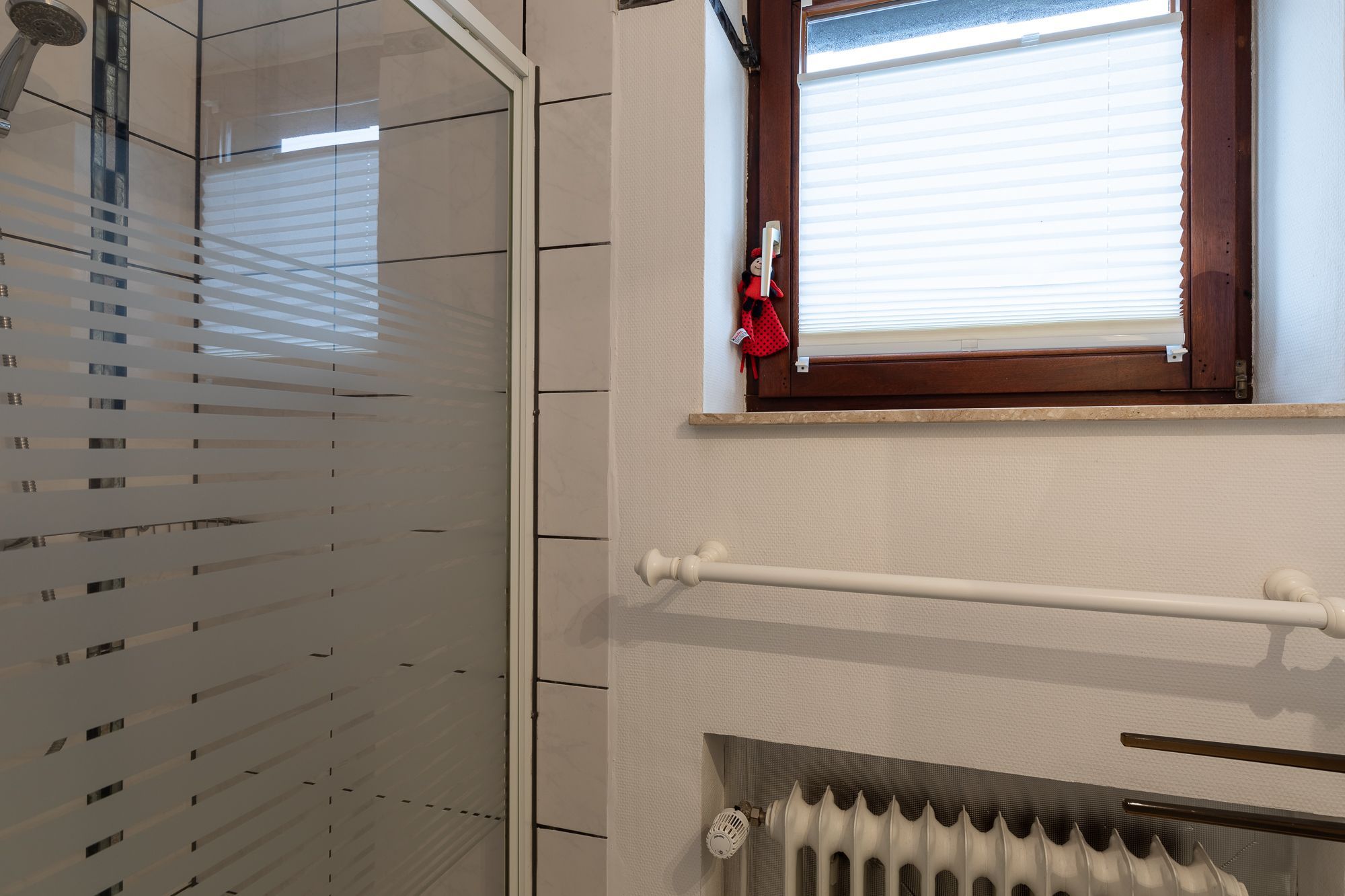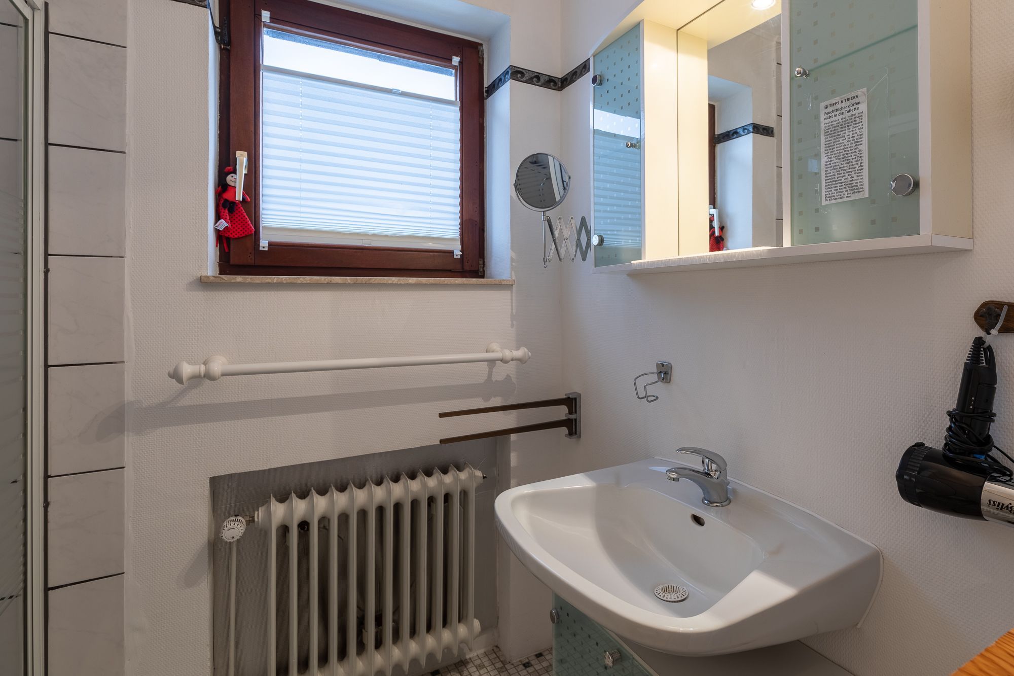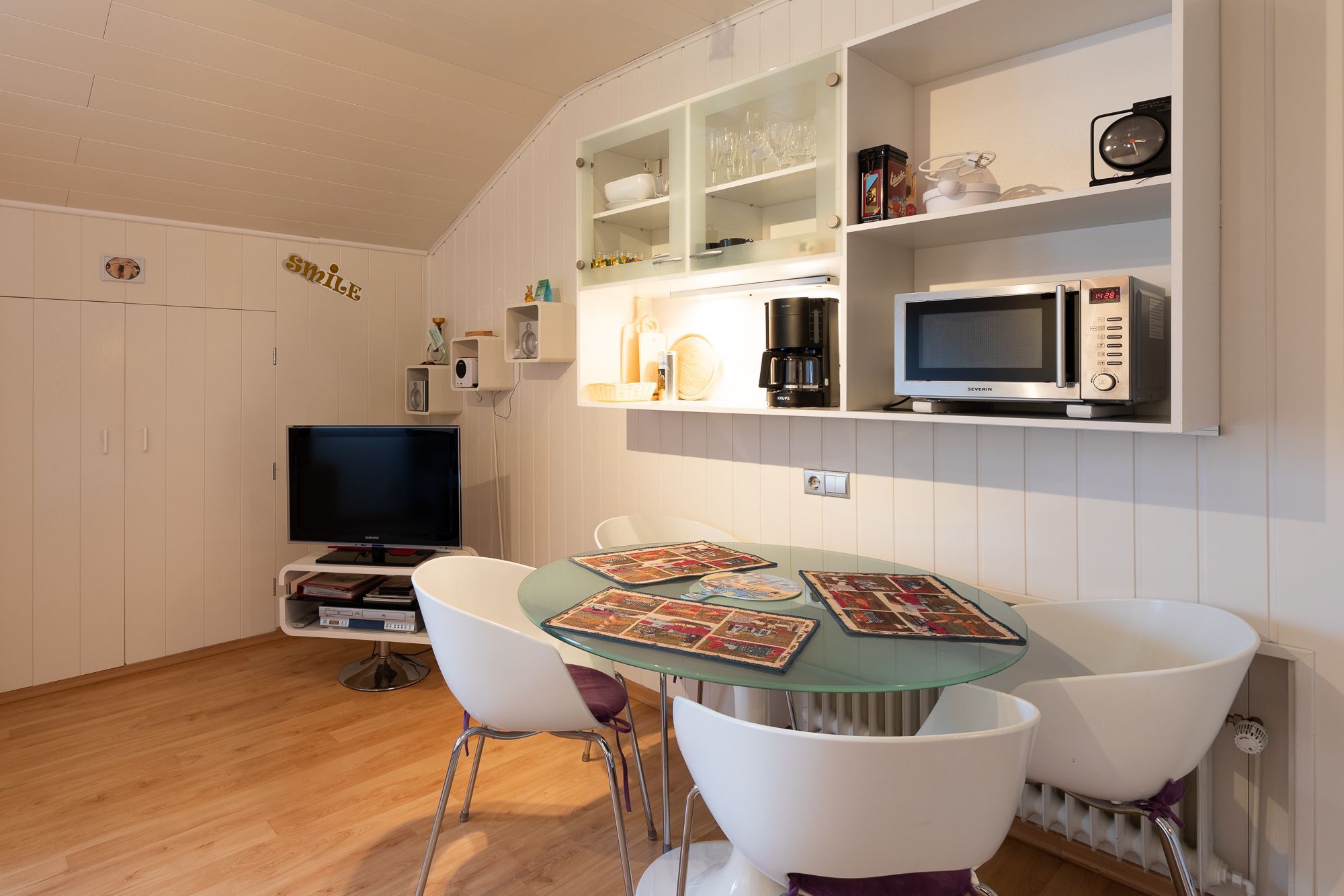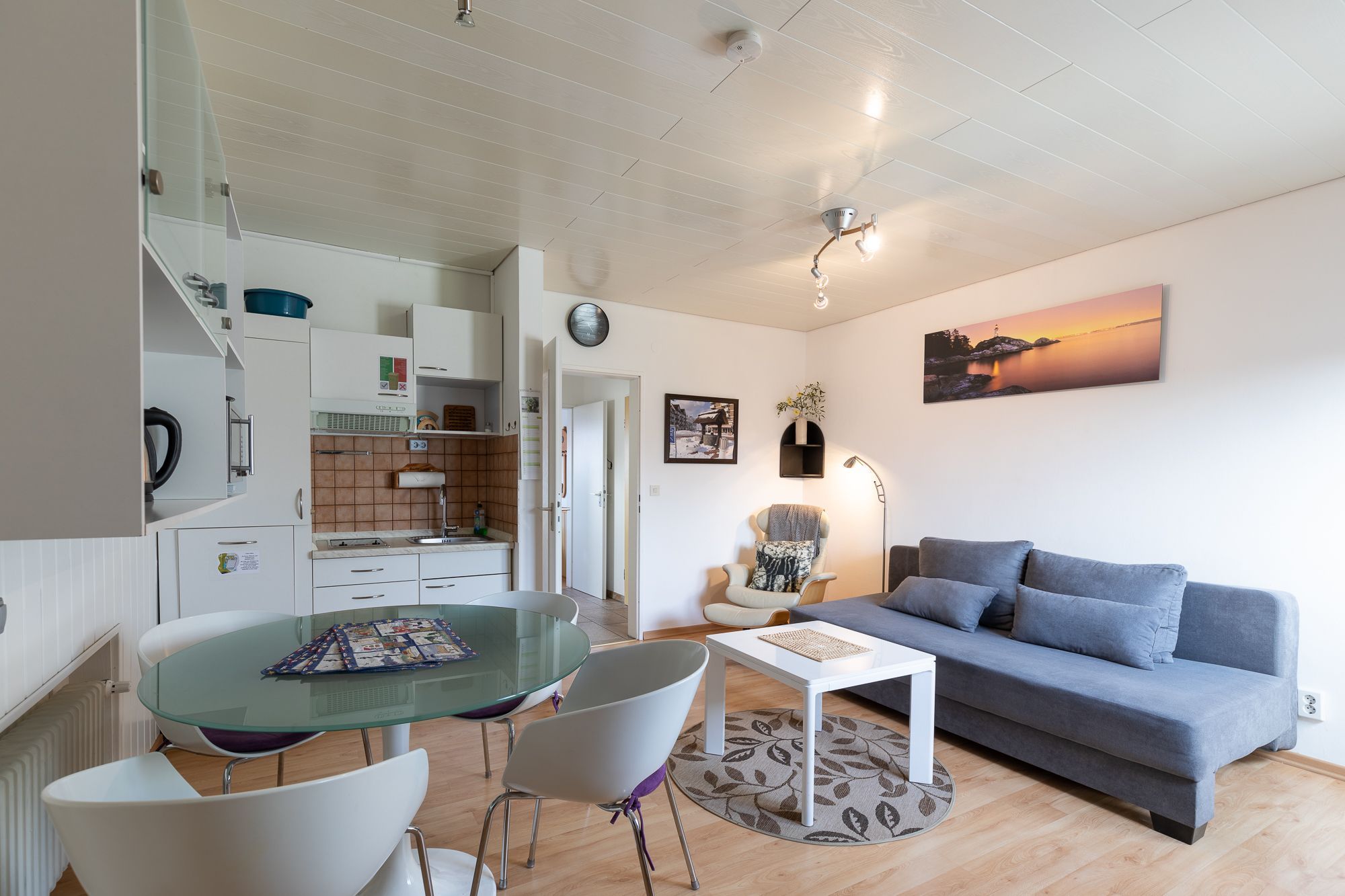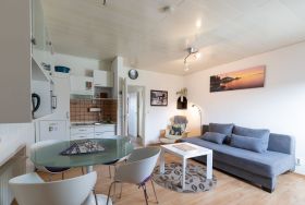 Ein Schlafzimmer mit zwei Einzelbetten + Kommode. Ein Wohnzimmer mit Küchenzeile (Kaffee- und Pad-Maschine, Heißwasser- und Eierkocher, Heißluft/Grill-Mikrowelle, Kühlschrank mit Gefrierfach, Geschirrspülmaschine, 2 Kochplatten), Rundsitz-Essplatz, Lesesessel mit Fußbank, zweitüriger Einbauschrank, Wäscheständer, Staubsauger, Schlaf-Sofa, Sat TV. Balkon mit Sitzmöbel. Bad mit niedriger Duschwanne + Föhn. Gegensprechanlage/Türöffner. Nichtraucherhaus, keine Haustiere, kostenloser PKW-Stellplatz direkt am Haus, Fahrradunterstand hinterm Haus.