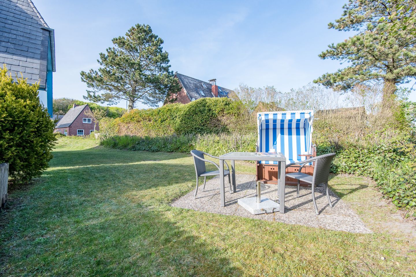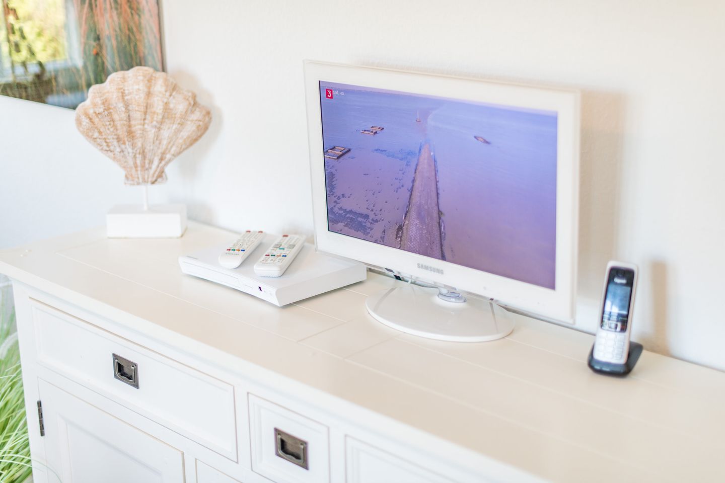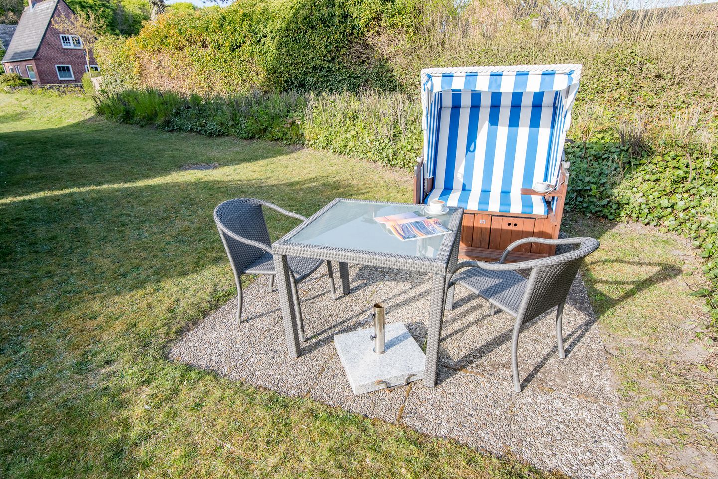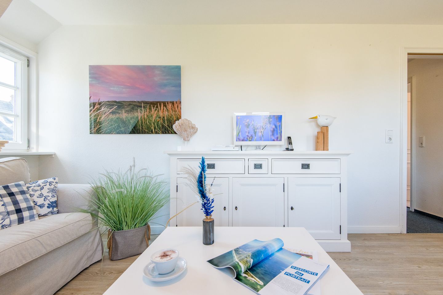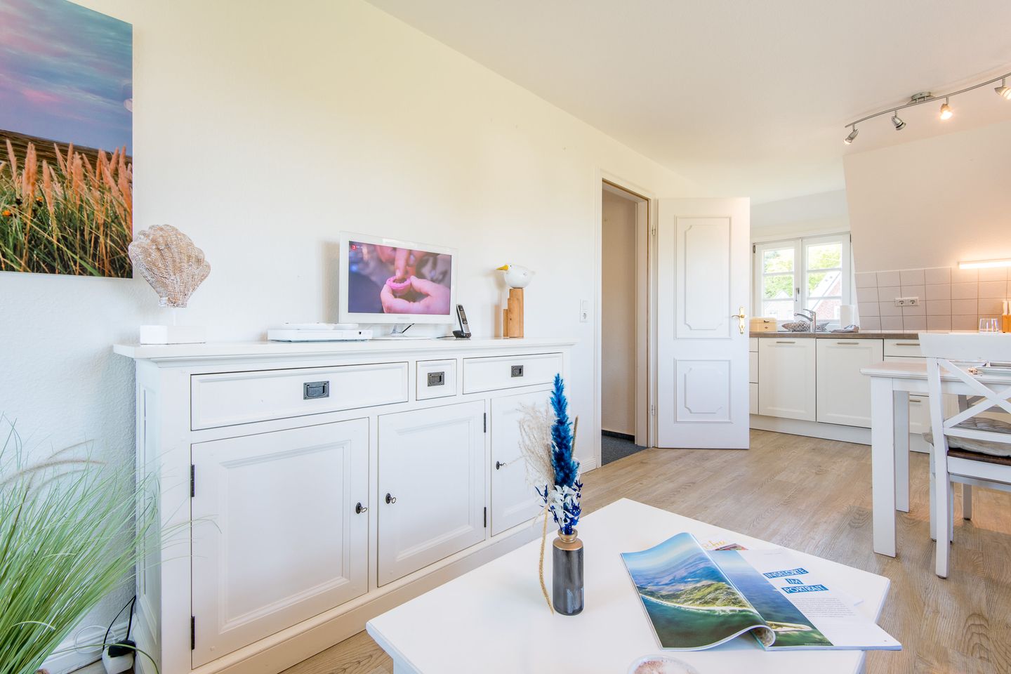 Der gemütliche Wohnbereich ist mit einem komfortablen Sofa, einem Esstisch für gesellige Mahlzeiten und einem TV ausgestattet. Die Wohnung verfügt zudem über einen einladenden Garten mit Sonnenfreisitz und Strandkorb, der besonders an sonnigen Tagen zum Verweilen einlädt.
