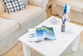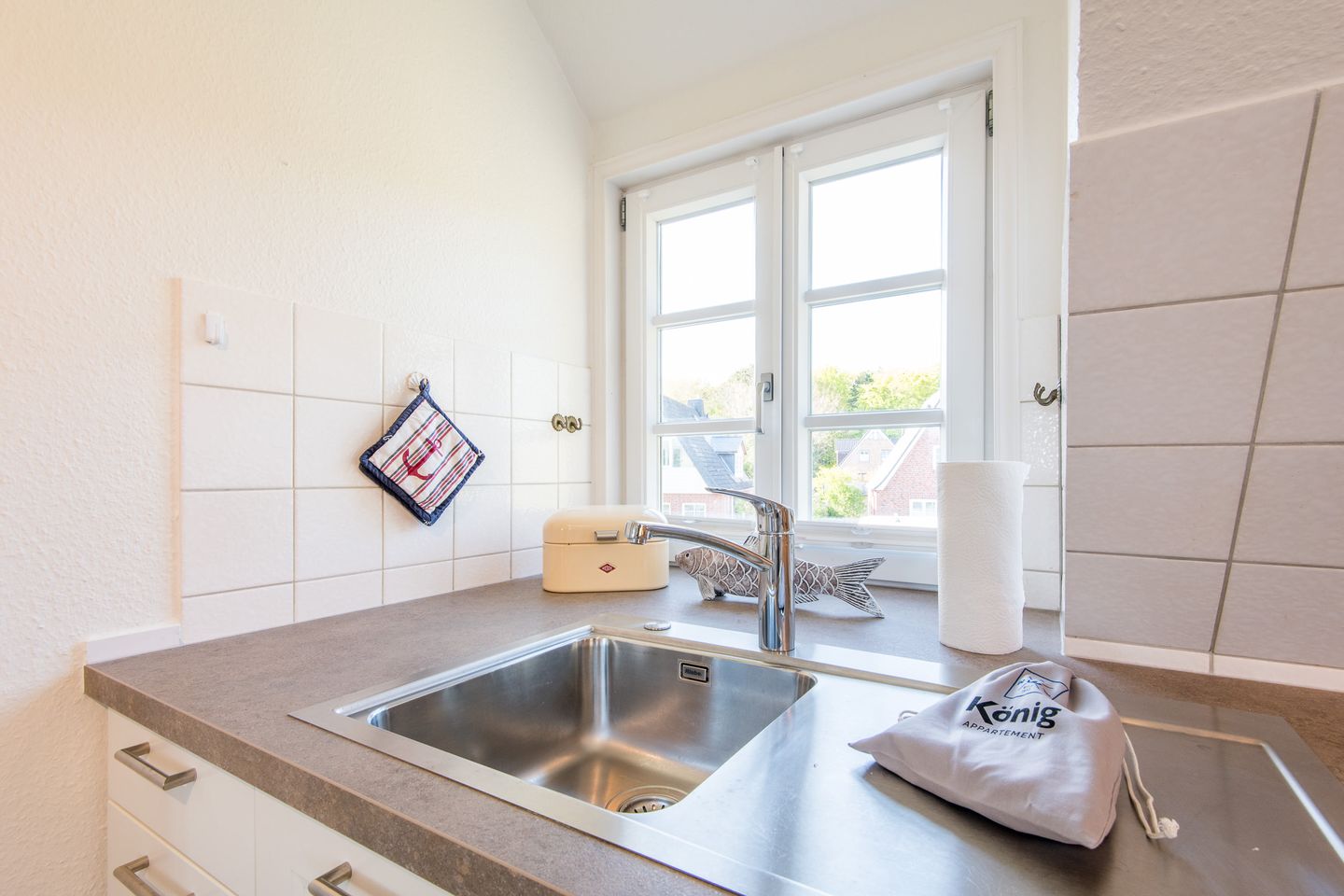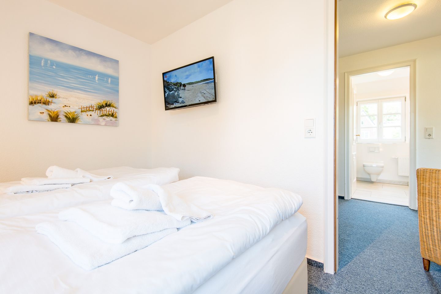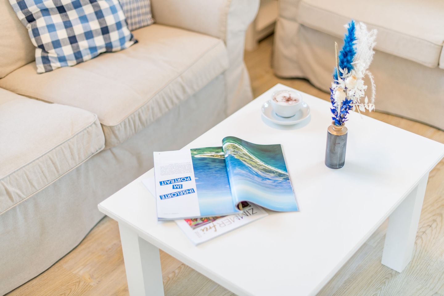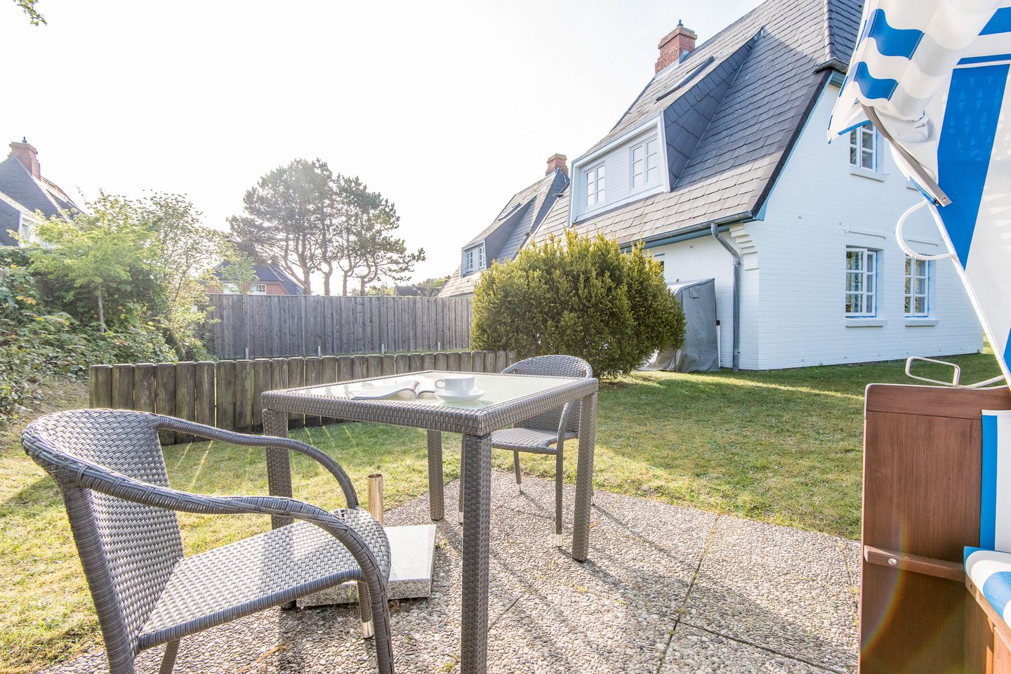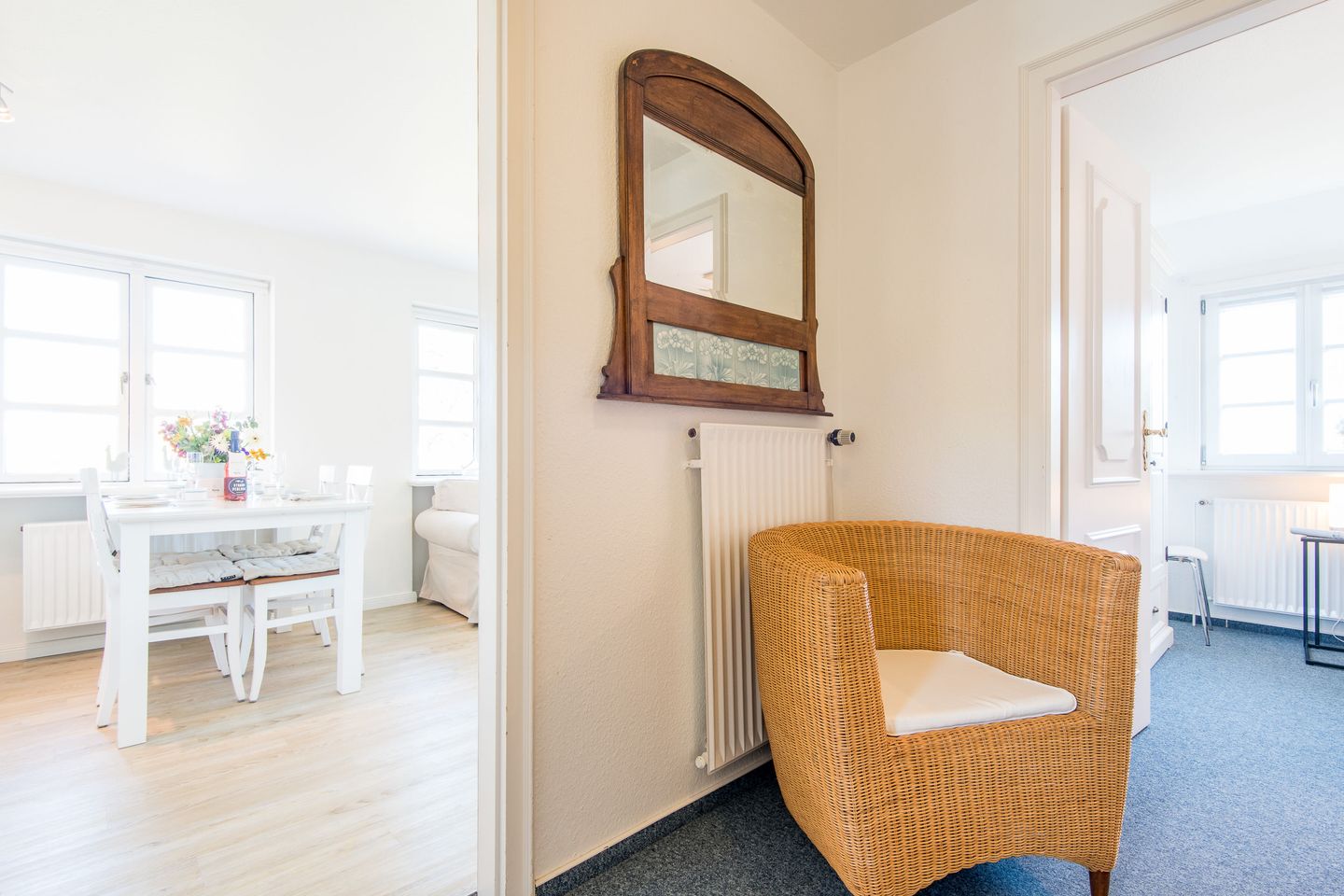 Der gemütliche Wohnbereich ist mit einem komfortablen Sofa, einem Esstisch für gesellige Mahlzeiten und einem TV ausgestattet. Die Wohnung verfügt zudem über einen einladenden Garten mit Sonnenfreisitz und Strandkorb, der besonders an sonnigen Tagen zum Verweilen einlädt.